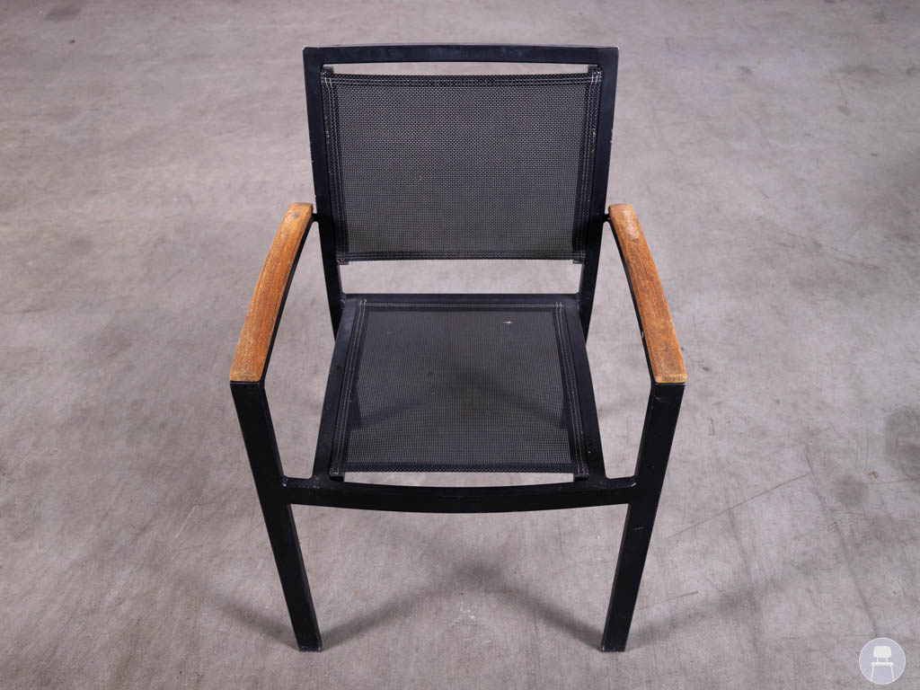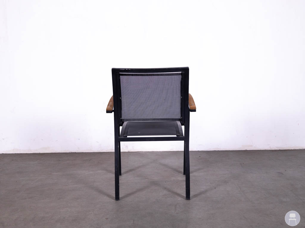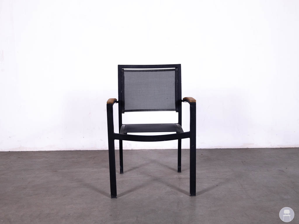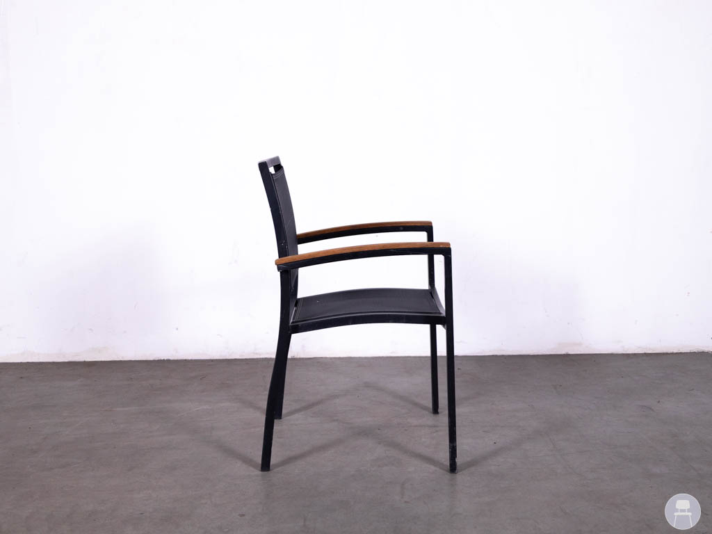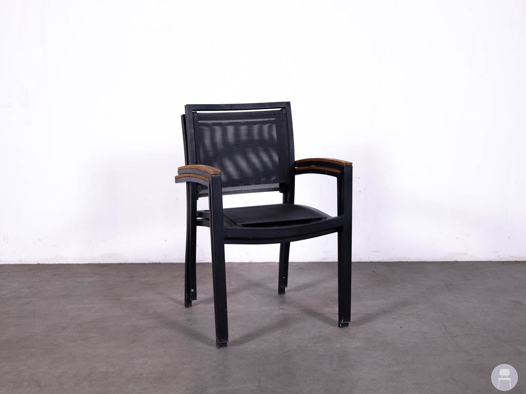 Deze terrasstoel heeft een stevig frame van aluminium in een zwarte kleur, wat zorgt voor een lichtgewicht maar sterke constructie. De zitting en rugleuning zijn uitgevoerd in Batyline in zwart, een slijtvast en weerbestendig materiaal dat perfect geschikt is voor buitengebruik. De armleuningen zijn afgewerkt met een houtlook detail, wat de stoel een warme en stijlvolle uitstraling geeft.