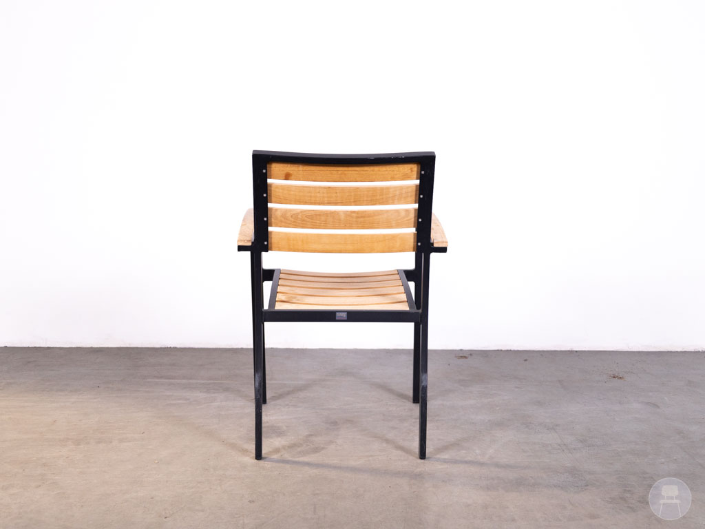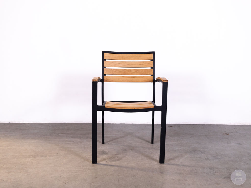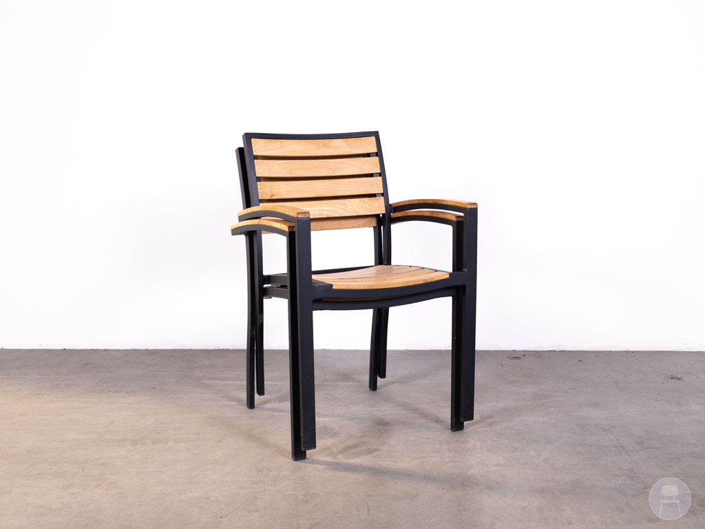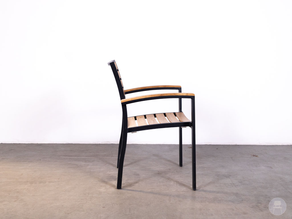 Terrasstoel Batyline Marius Teak is een praktische en stijlvolle terrasstoel, ideaal voor intensief horecagebruik. Deze terrasstoel is uitgevoerd met een zwart metalen frame gecombineerd met teakhouten latten in de zitting en rugleuning. Dit zorgt voor een moderne en natuurlijke uitstraling die perfect past op elk terras. De stoel is voorzien van armleuningen voor extra comfort en is bovendien stapelbaar, wat hem zeer geschikt maakt voor efficiënt opbergen en flexibel gebruik in de horeca. De combinatie van teak hout en metaal maakt deze stoel duurzaam en weerbestendig, ideaal voor buitengebruik. Perfect voor wie zoekt naar stapelbare tuinstoelen met armleuning.