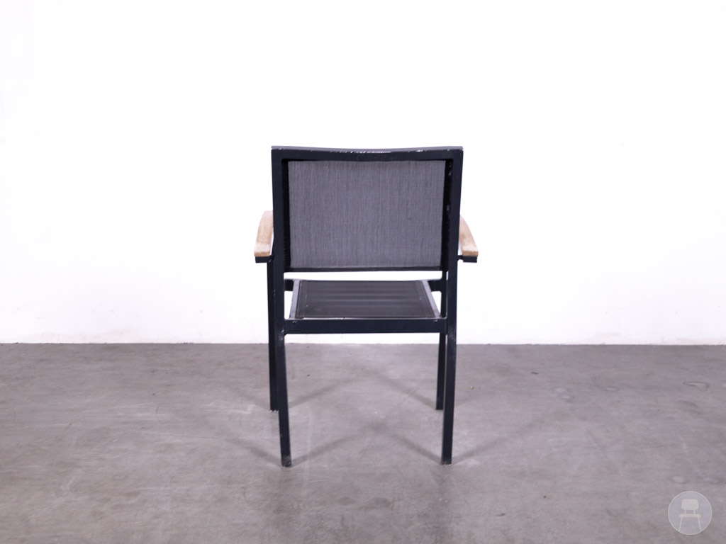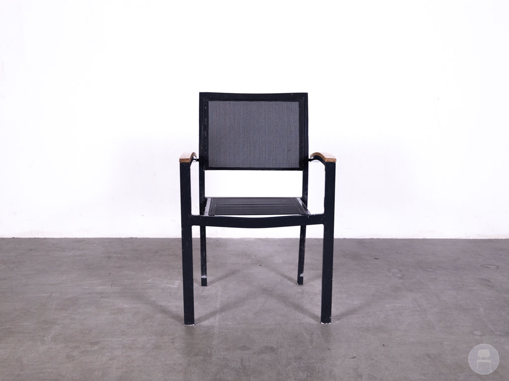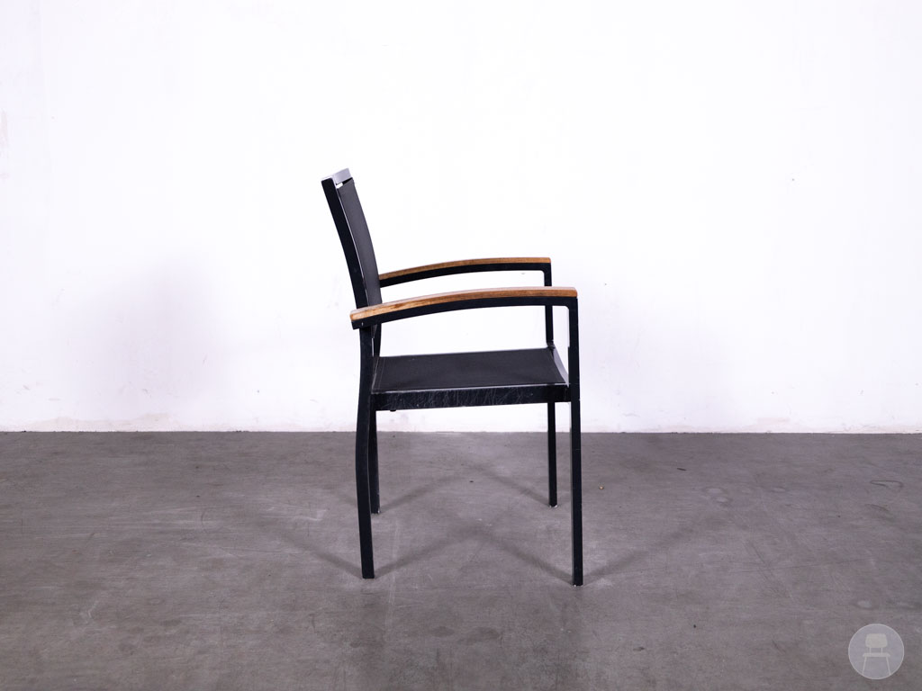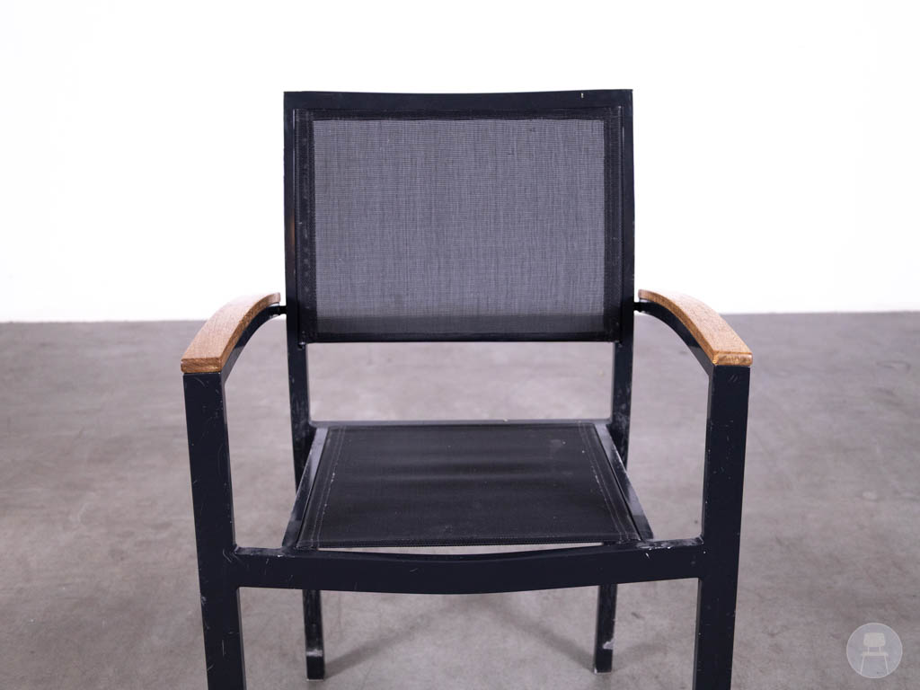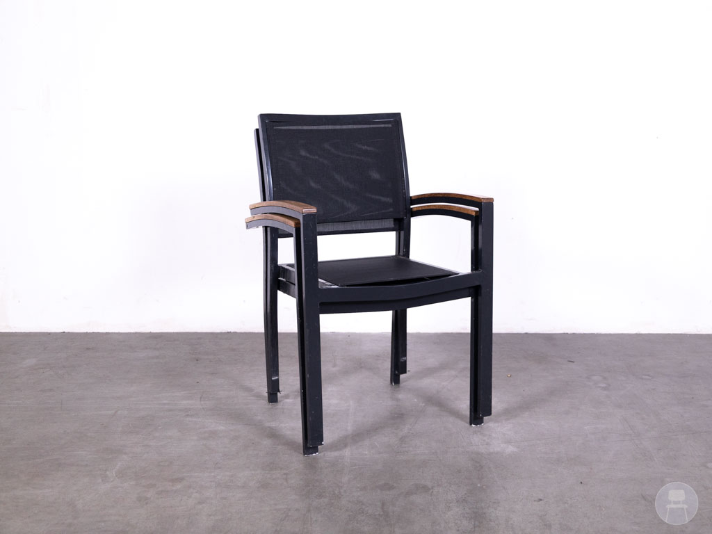 De armleuningen zijn stijlvol afgewerkt met teakhout, wat zorgt voor een warme, natuurlijke touch en een mooie balans met het strakke zwarte frame. De Batyline Ties combineert comfort, design en functionaliteit, en is daarmee een uitstekende keuze voor cafés, restaurants en hotels die hun terras willen voorzien van kwalitatieve en stijlvolle zitplaatsen.
