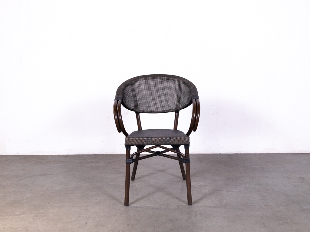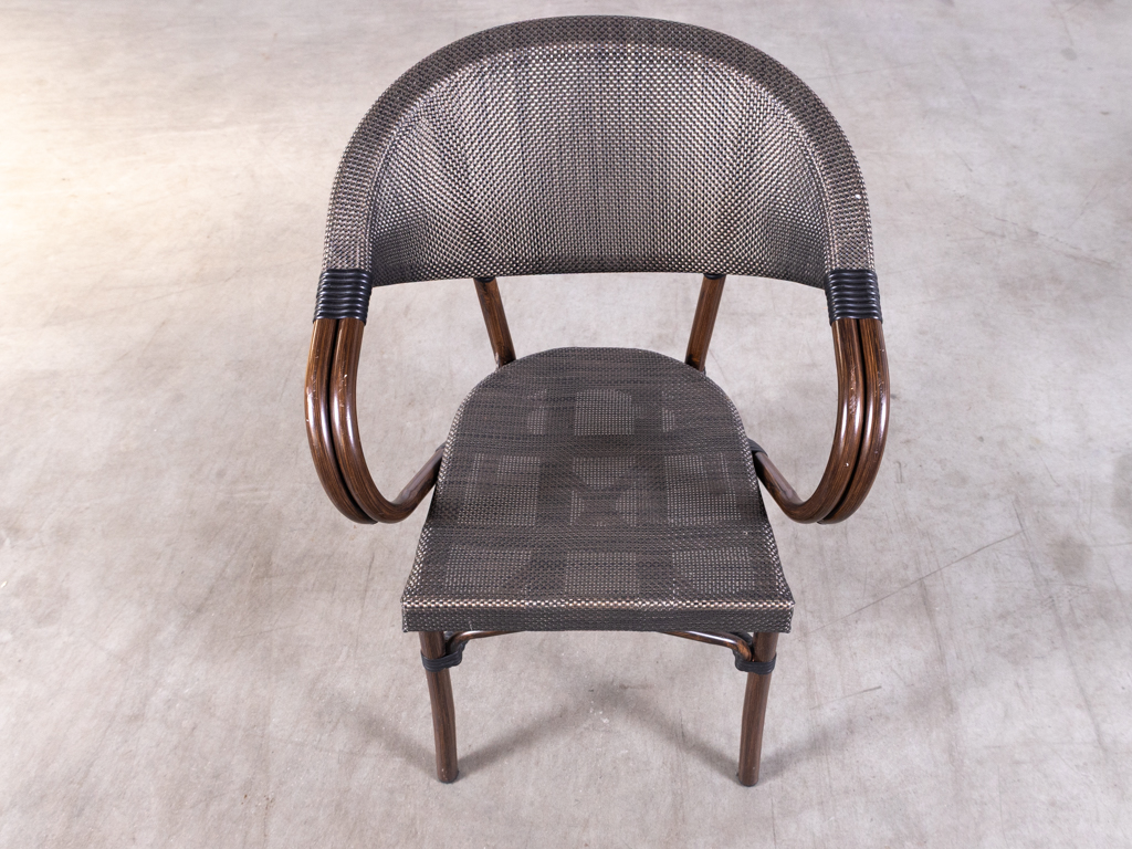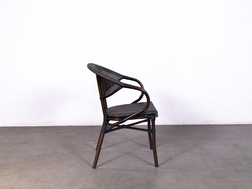 De zitting en rug zijn vervaardigd uit sterk kunststof vlechtwerk, wat zorgt voor een comfortabele zit en eenvoudig onderhoud. Het frame van aluminium met bruine houtlook afwerking in combinatie met het zwarte vlechtwerk geeft de stoel een warme en tijdloze uitstraling.