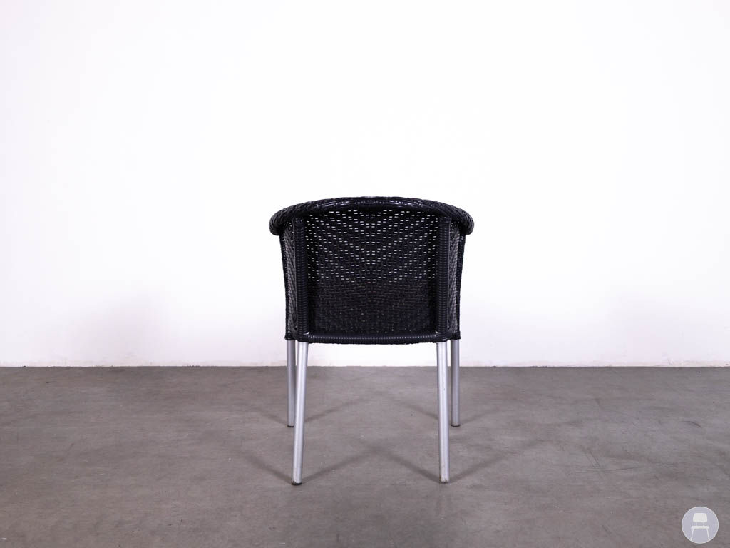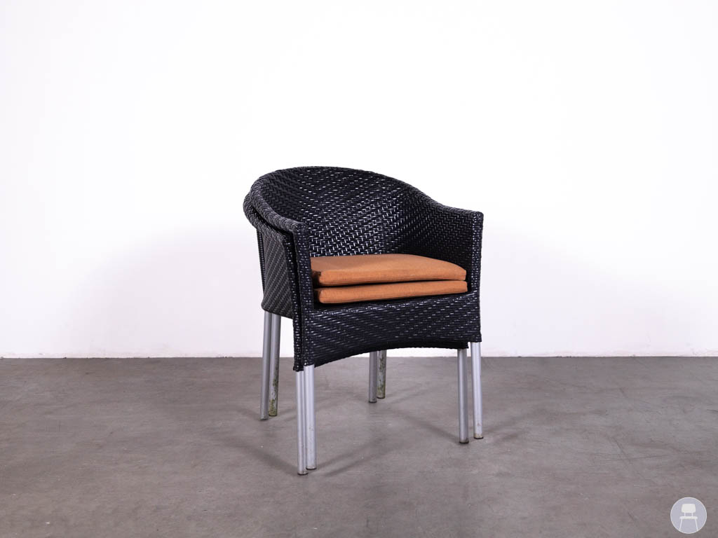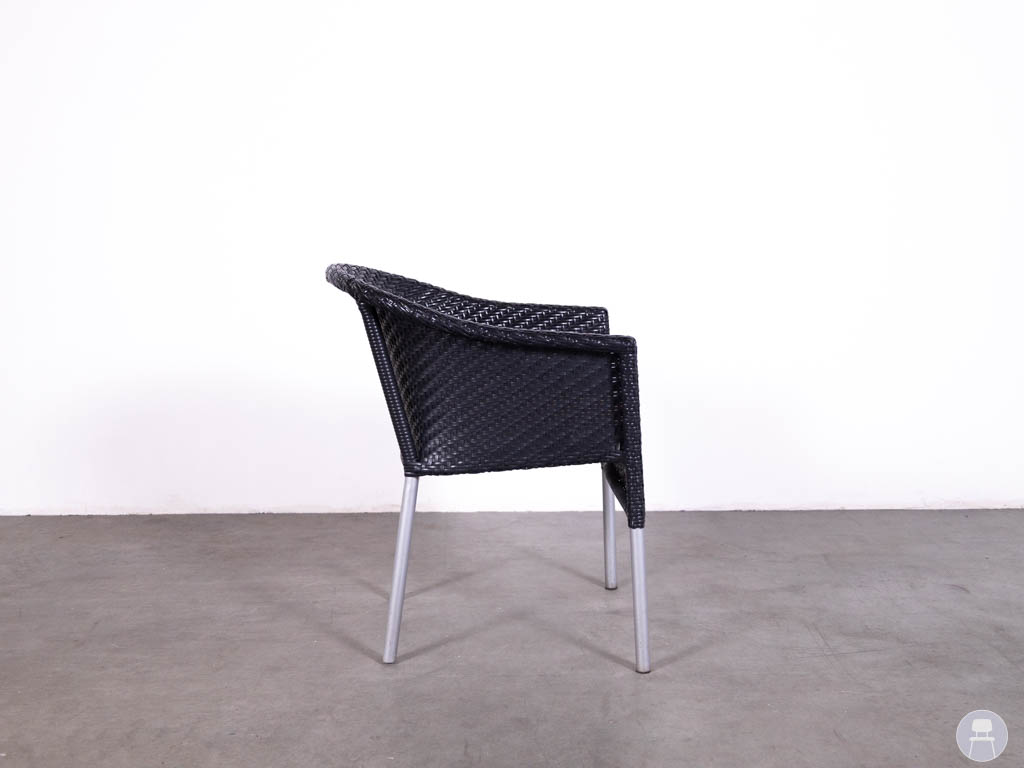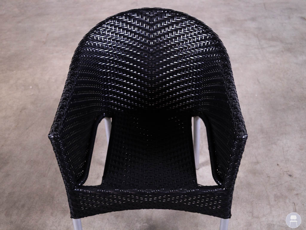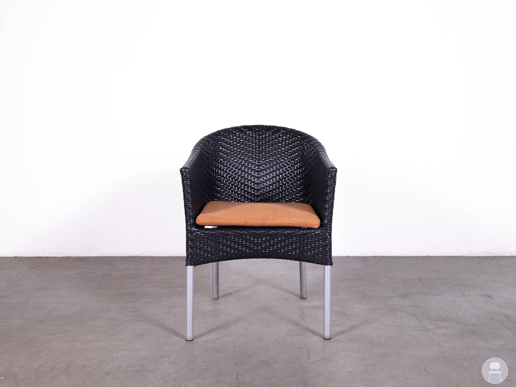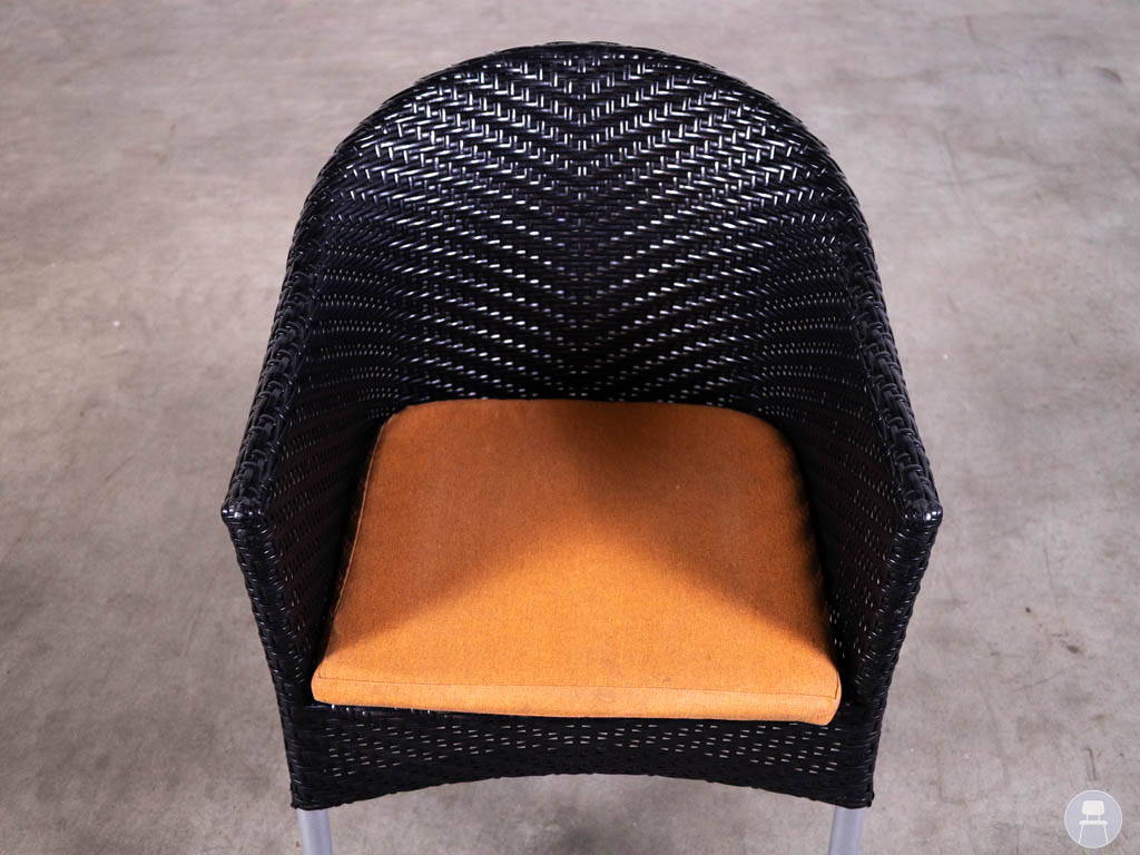 De stoel is uitgevoerd in zwart wicker (gevlochten kunststof), wat zorgt voor een duurzame en weerbestendige afwerking. Het stevige aluminium frame biedt extra stabiliteit en maakt de stoel licht van gewicht. Het bijgeleverde zitkussen in warme bruintint zorgt voor extra comfort en een uitnodigende uitstraling. Dankzij het stapelbare ontwerp is deze terrasstoel eenvoudig op te bergen en ruimtebesparend, wat ideaal is voor drukke horecalocaties.