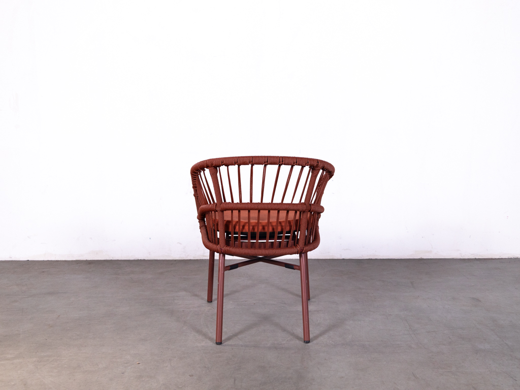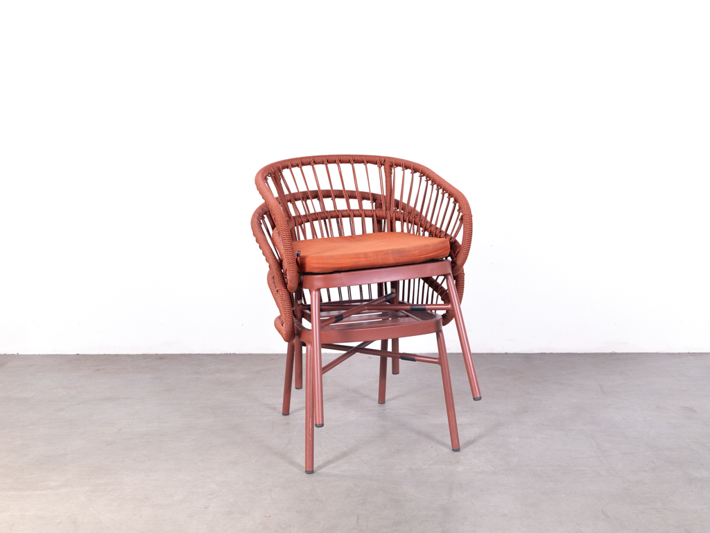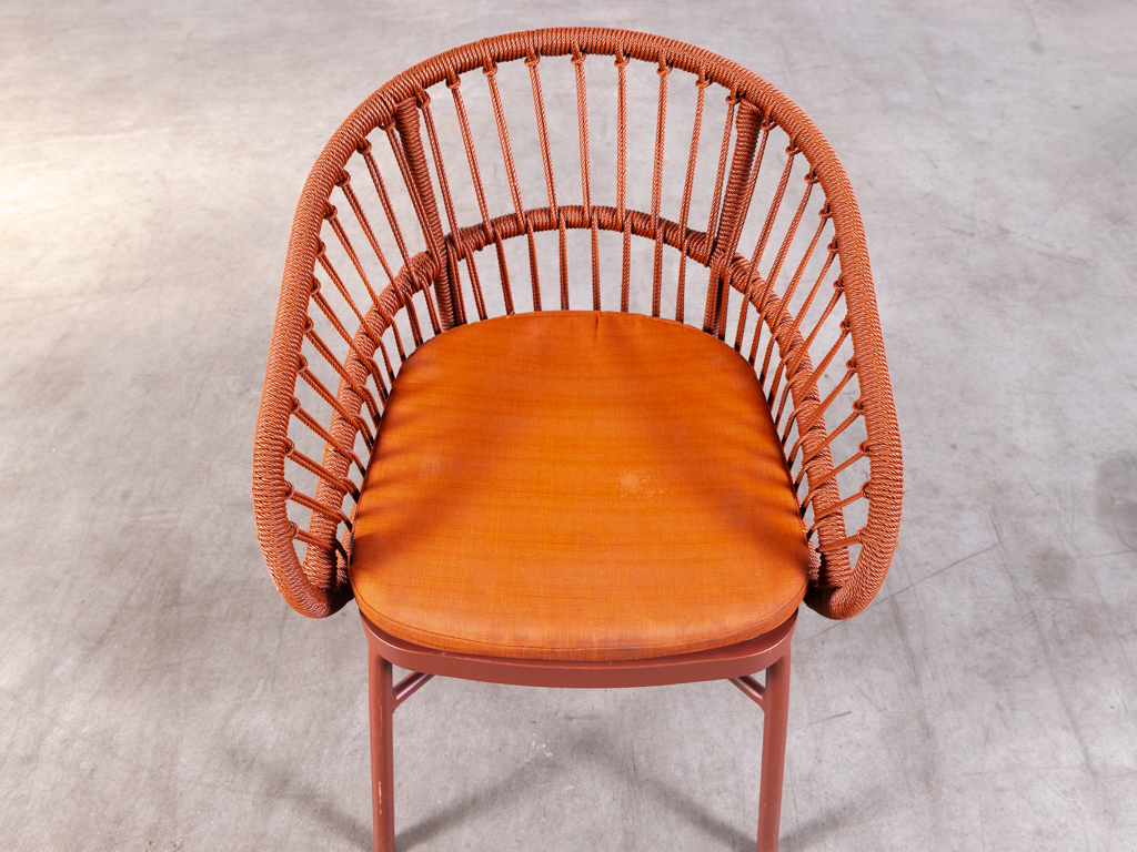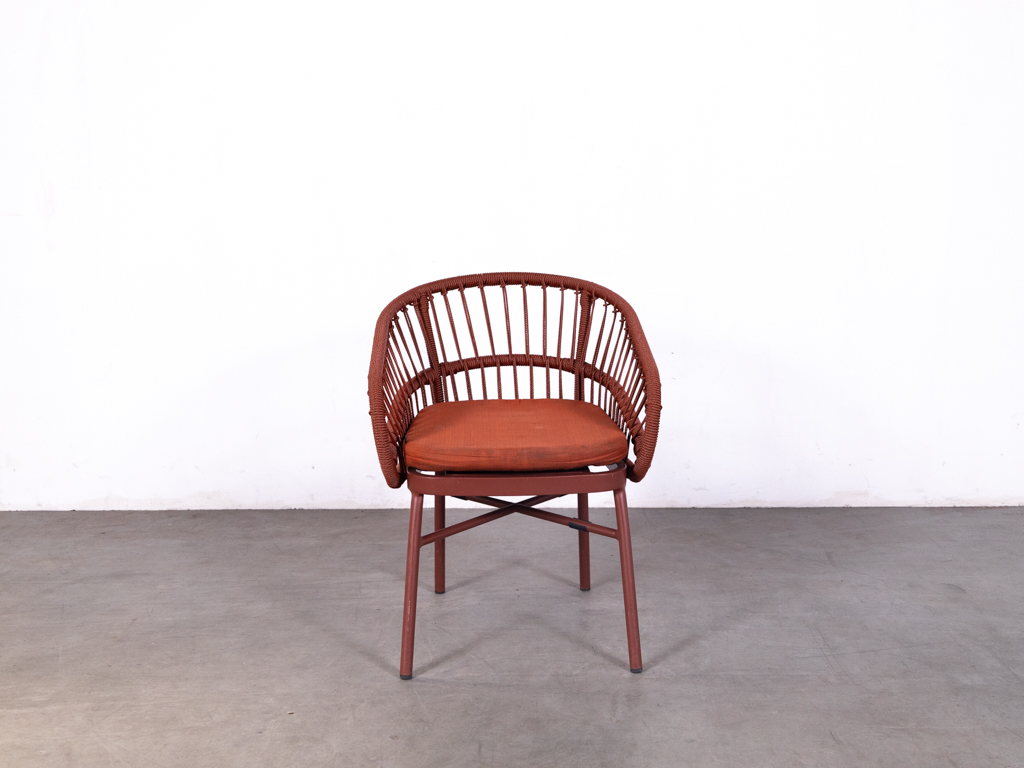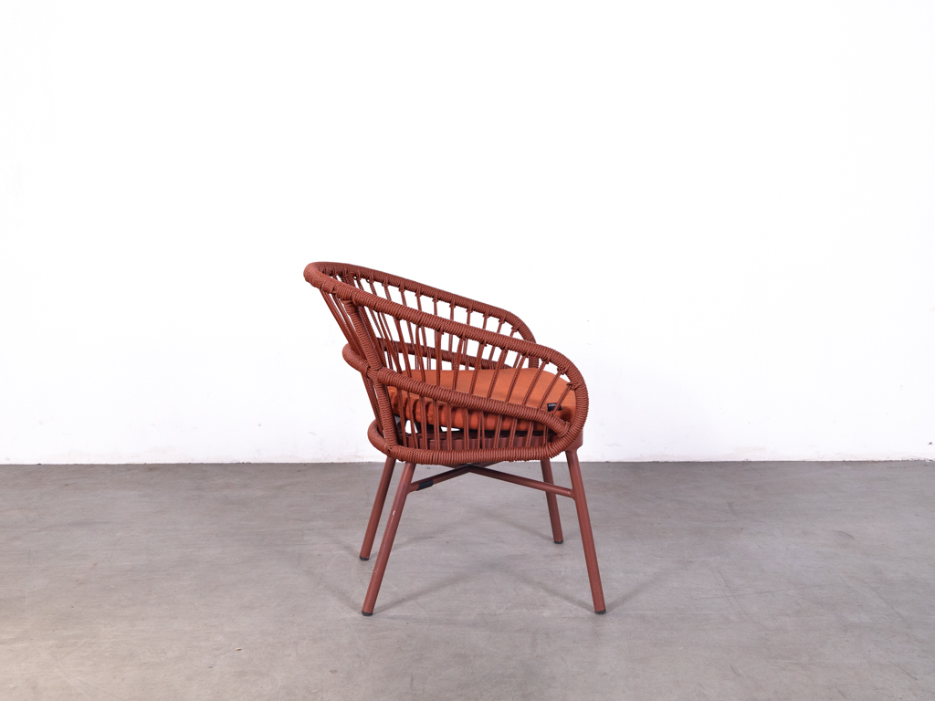 Terrasstoel Lot met kussen rood De arend is een opvallende en comfortabele horecastoel, uitgevoerd in textileen touw en aluminium in een warme rode kleur. Deze terrasstoel van het merk De Arend heeft een modern en speels design met een rond gevormde rugleuning en geïntegreerde armleuningen.