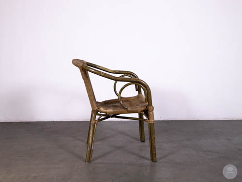 De stoel is uitgevoerd in naturel wicker vlechtwerk en heeft een stevig frame met een verweerde houtlook afwerking. Dit geeft de stoel een charmante, doorleefde uitstraling die goed past bij een vintage of landelijke stijl. De armleuningen en comfortabele zitting maken deze stoel zeer geschikt voor langdurig gebruik.