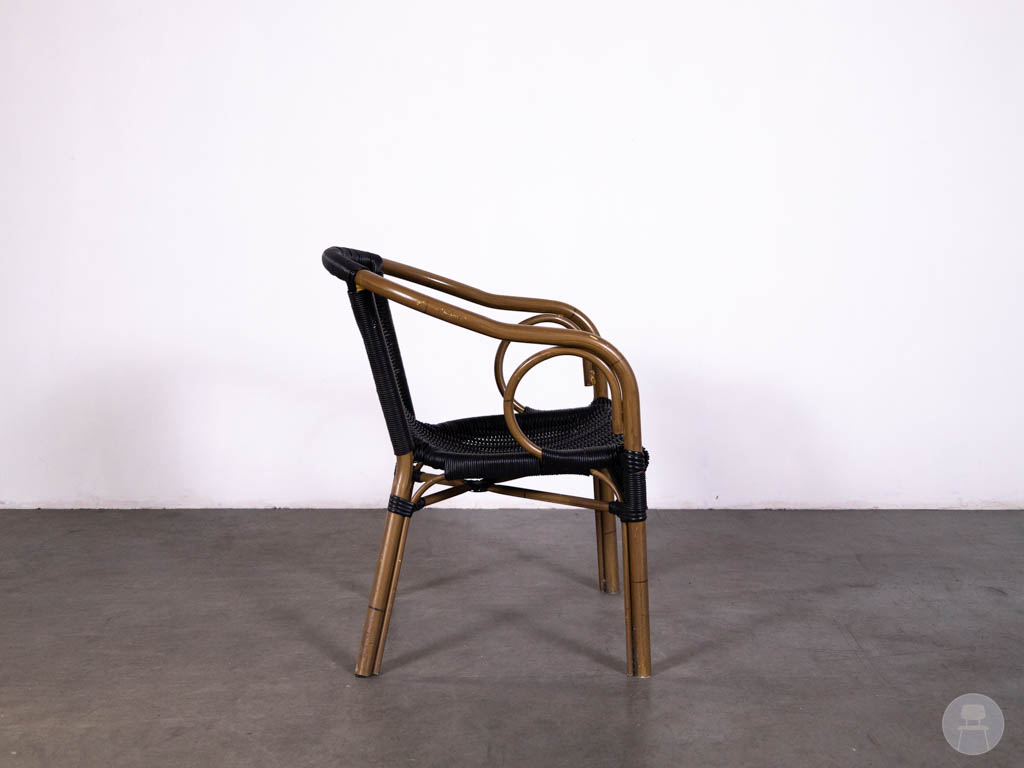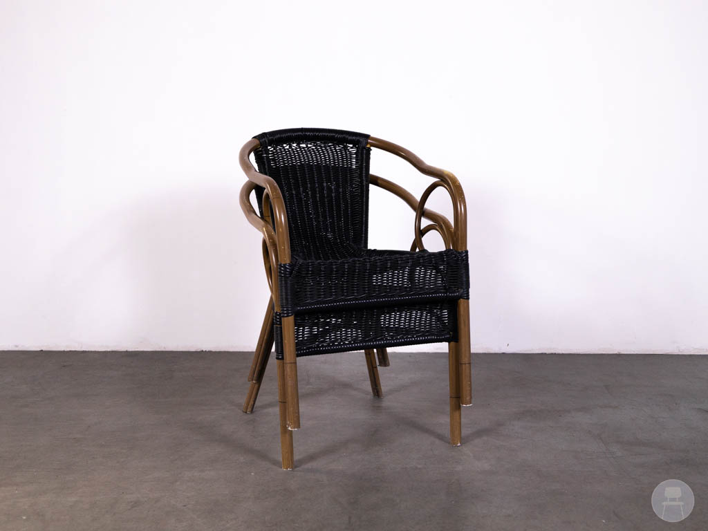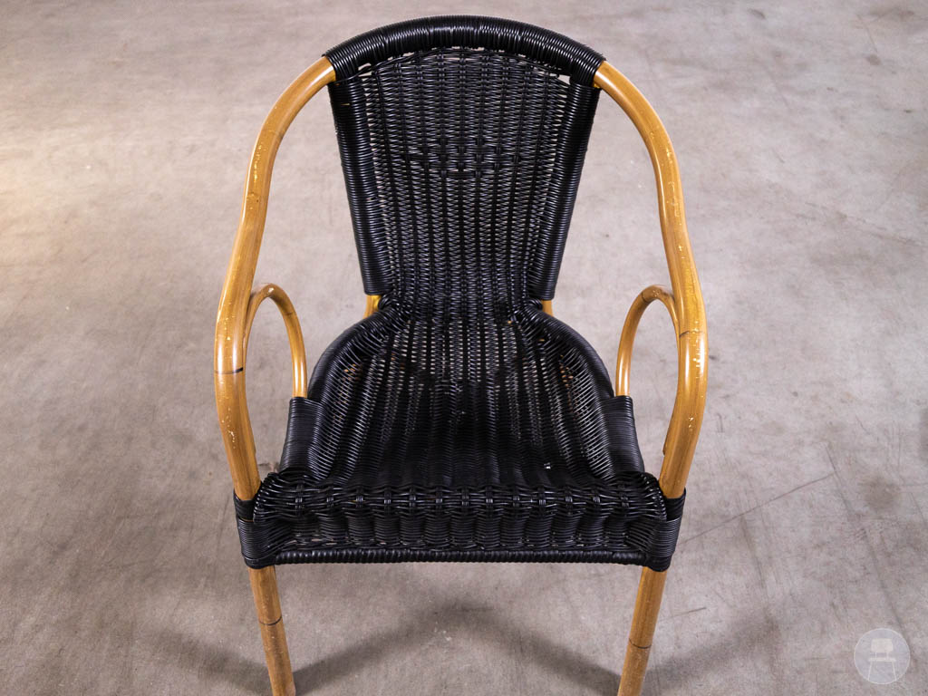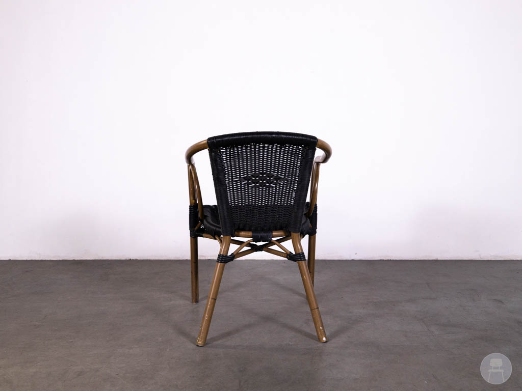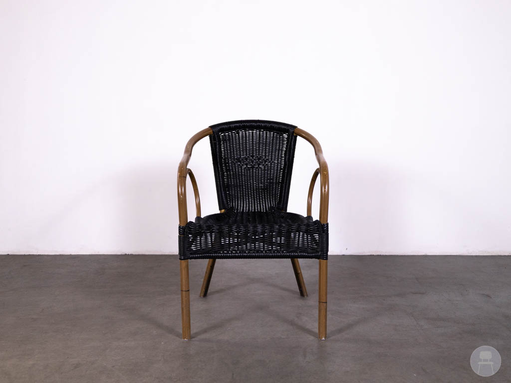 De stoel is uitgevoerd in zwart gevlochten wicker, wat zorgt voor een duurzame en onderhoudsvriendelijke afwerking, ideaal voor intensief gebruik in de horeca. Het frame met houtlook accenten geeft de stoel een klassieke twist en extra karakter. De armleuningen en ergonomische vorm zorgen voor een comfortabel zitgevoel voor gasten.