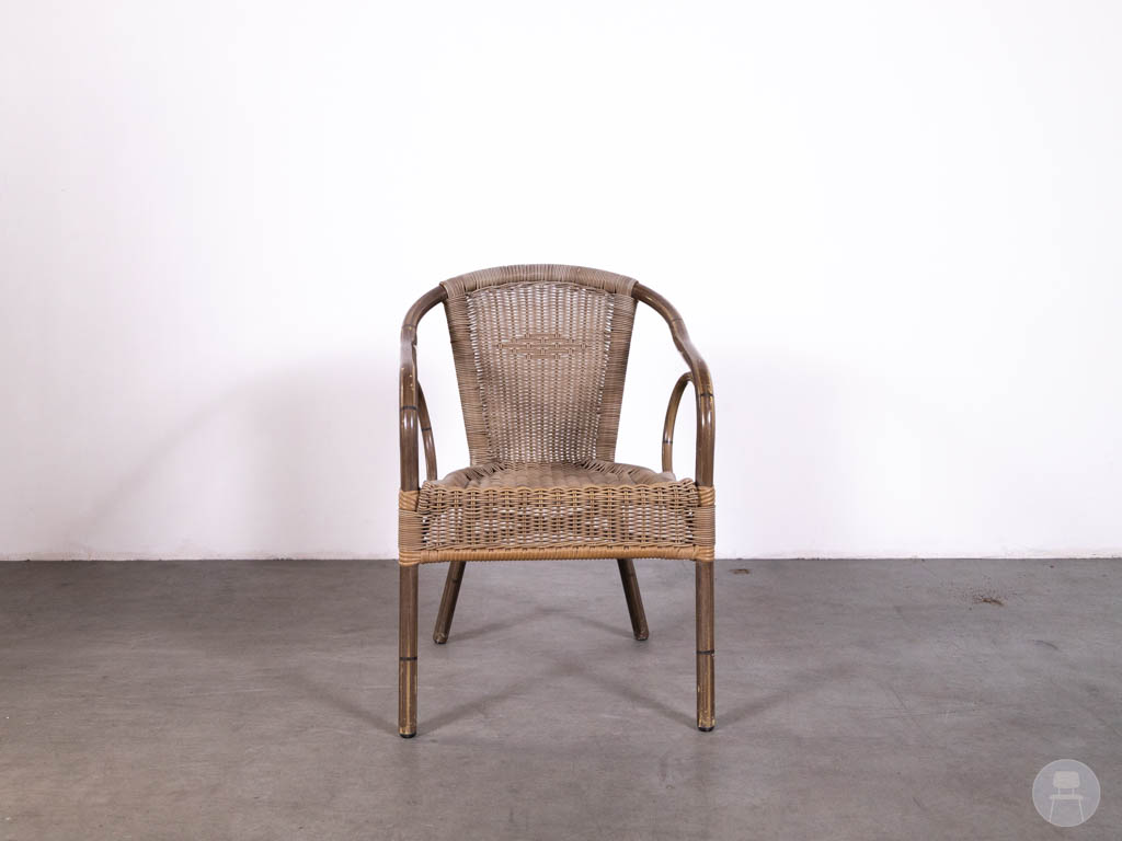 Deze terrasstoel is uitgevoerd in donkerbruin wicker vlechtwerk met een stevig aluminium frame in houtlook. De combinatie van kunststof wicker en aluminium zorgt ervoor dat de stoel licht van gewicht is, weerbestendig en geschikt voor intensief buitengebruik. Dankzij de comfortabele zitting en armleuningen is deze stoel ideaal voor langdurig gebruik.