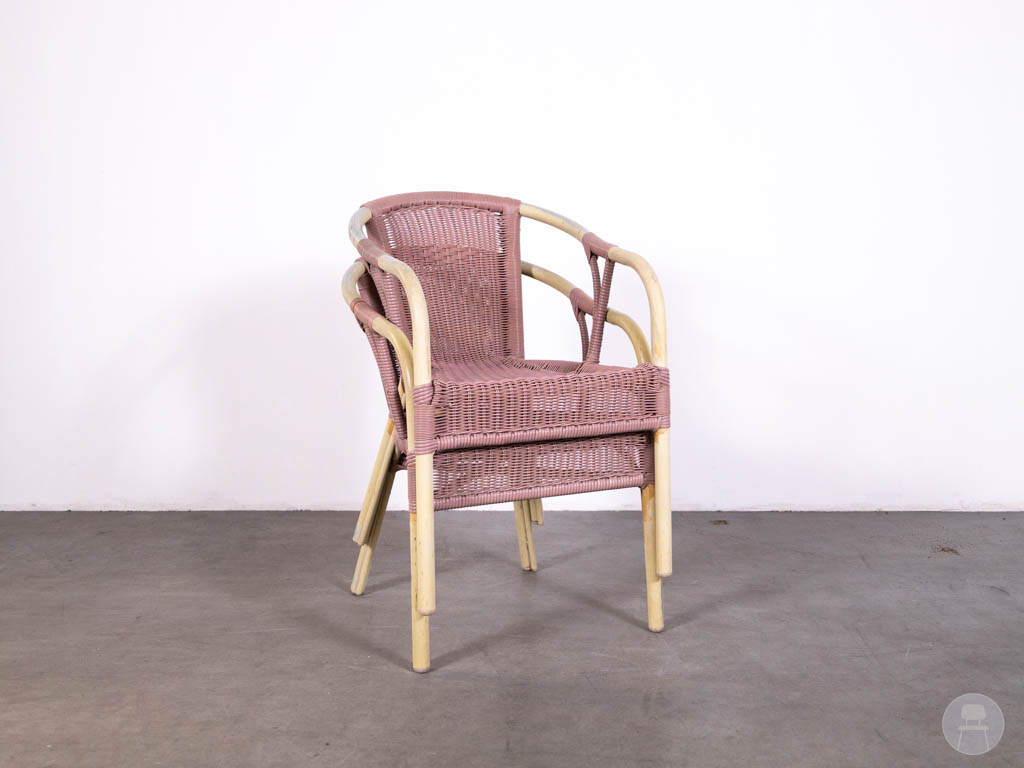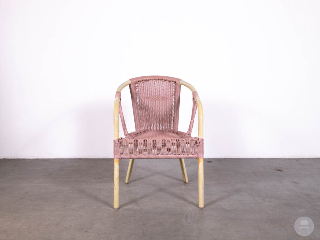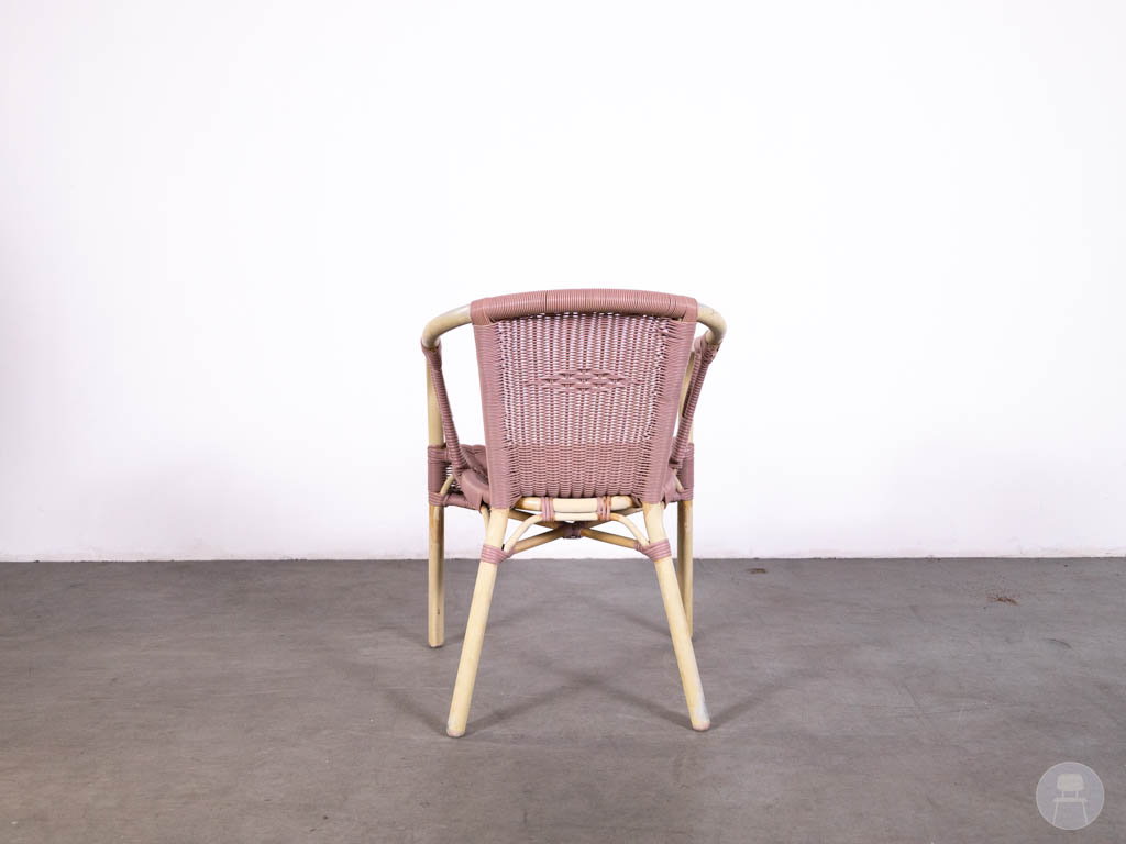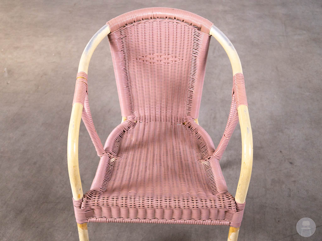 Let op: deze stoel bevat gebruikerssporen. De Panda lijn staat bekend om zijn duurzame en weerbestendige horecameubilair met een stijlvolle uitstraling. Een uitstekende keuze voor wie zoekt naar een horeca terrasstoel, wicker stoel roze of bistro stoel buiten met een unieke en frisse look.