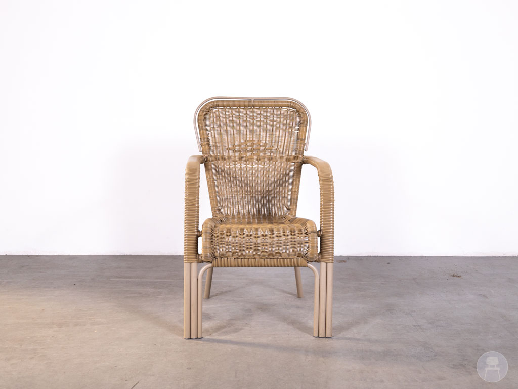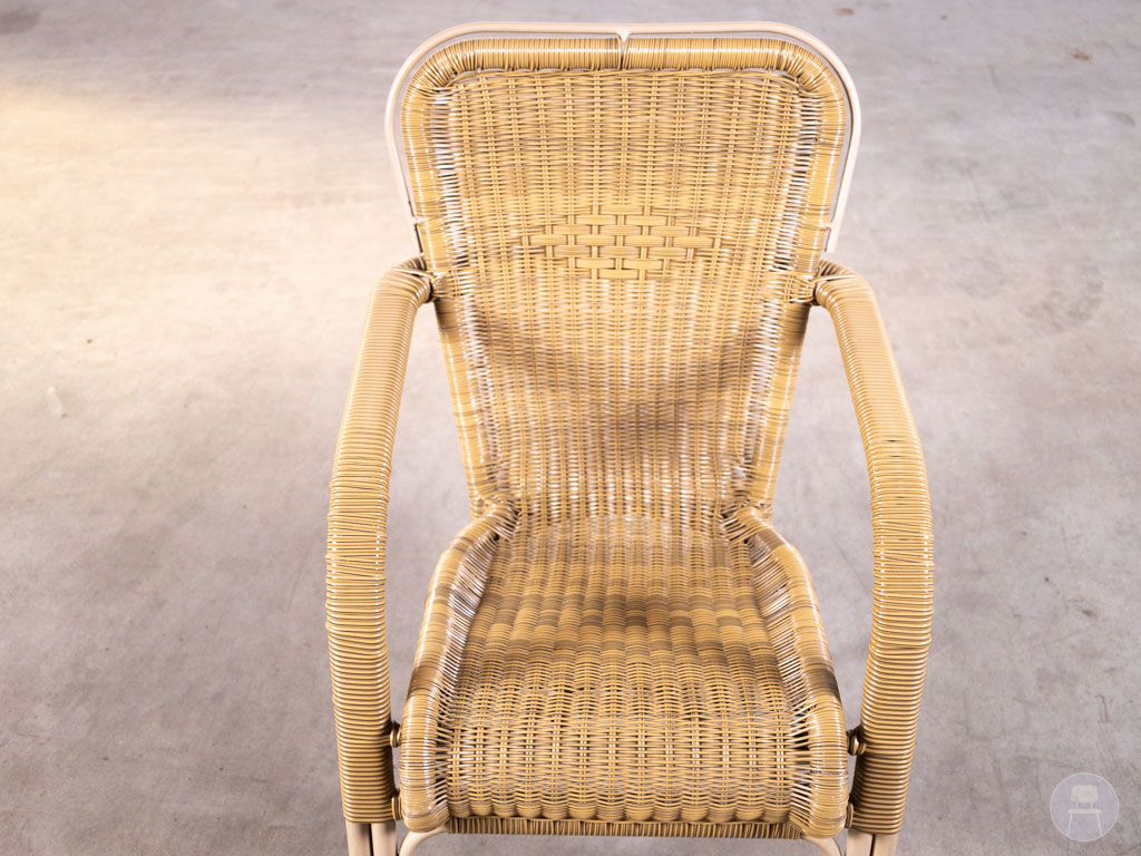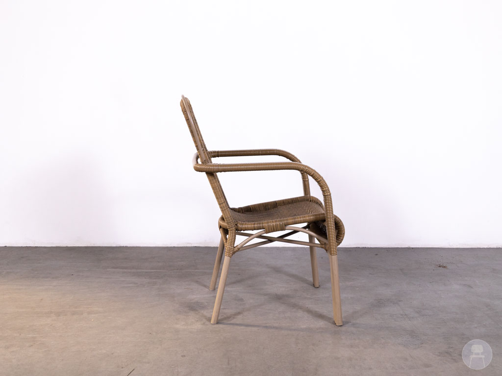 Deze terrasstoel is uitgevoerd in een kunststof wicker vlechtwerk in een warme naturel kleur, wat zorgt voor een klassieke en gezellige look. Het frame is gemaakt van lichtgewicht aluminium, waardoor de stoel stevig én eenvoudig te verplaatsen is. De armleuningen bieden extra comfort voor gasten.