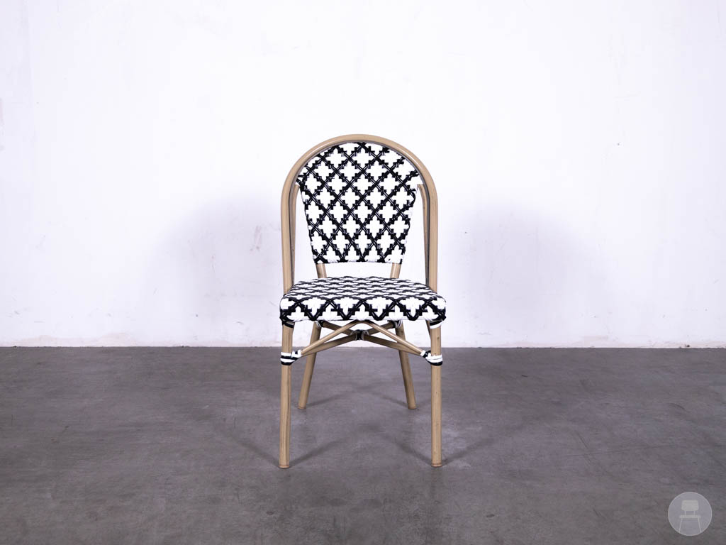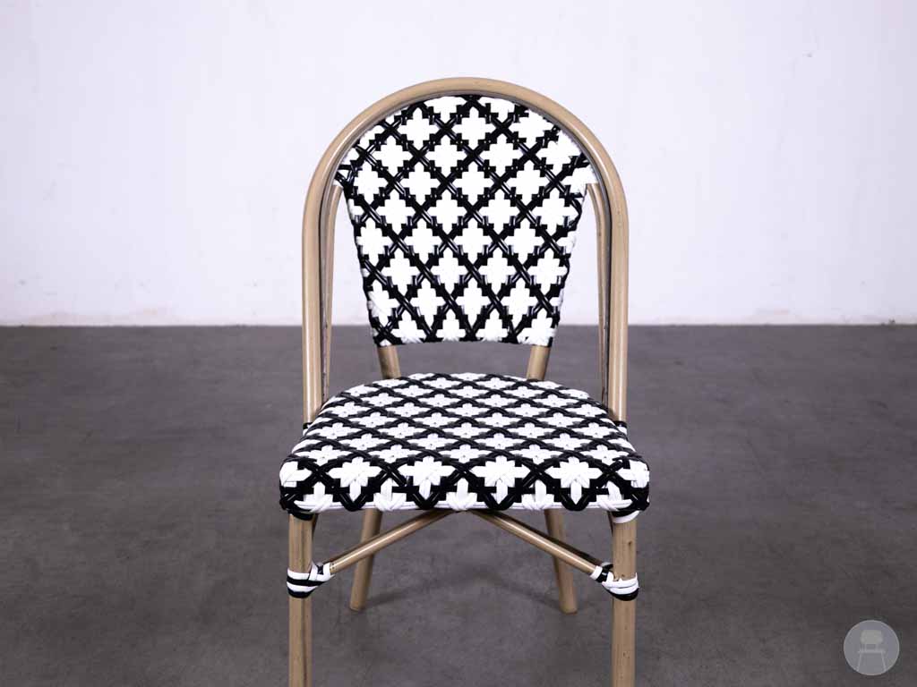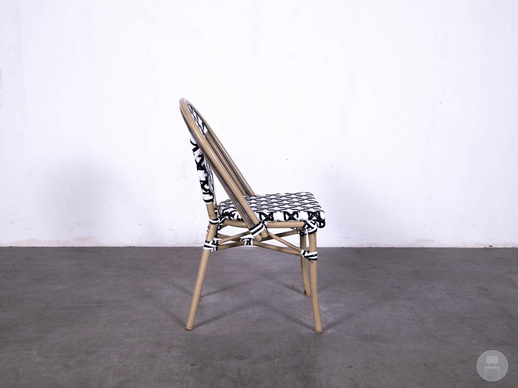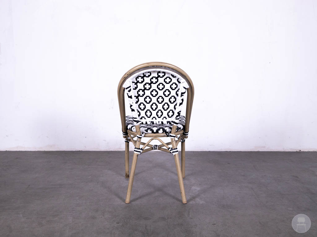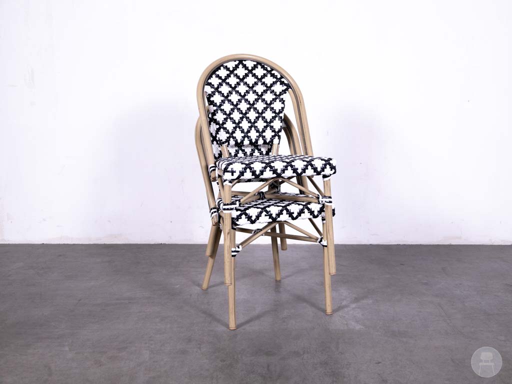 Terrasstoel Paris Flower zwart/wit brengt direct de sfeer van een charmant Parijs terras naar jouw horecazaak. Deze stijlvolle stoel heeft een stevig aluminium frame met een bamboe-look afwerking, wat zorgt voor een authentieke uitstraling zonder in te leveren op duurzaamheid. De zitting en rugleuning zijn gevlochten van zwart-wit kunststof in een elegant bloemenpatroon, wat zorgt voor een opvallende, doch tijdloze look.