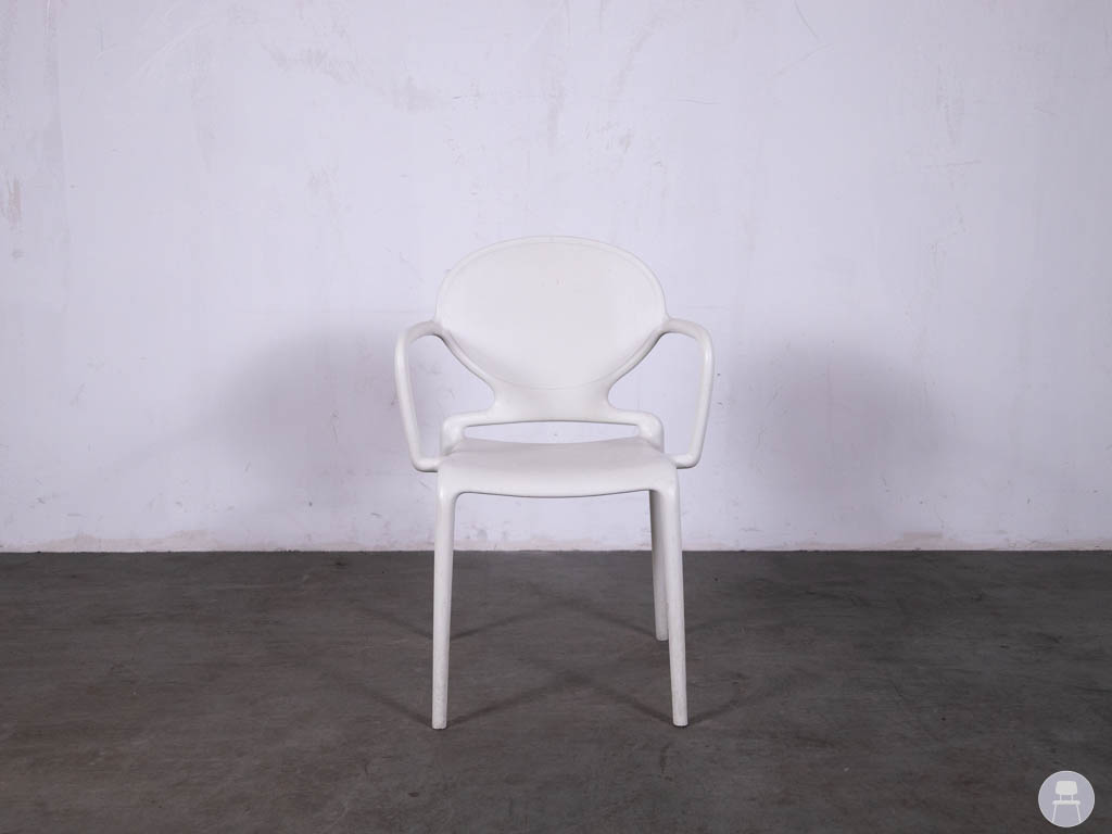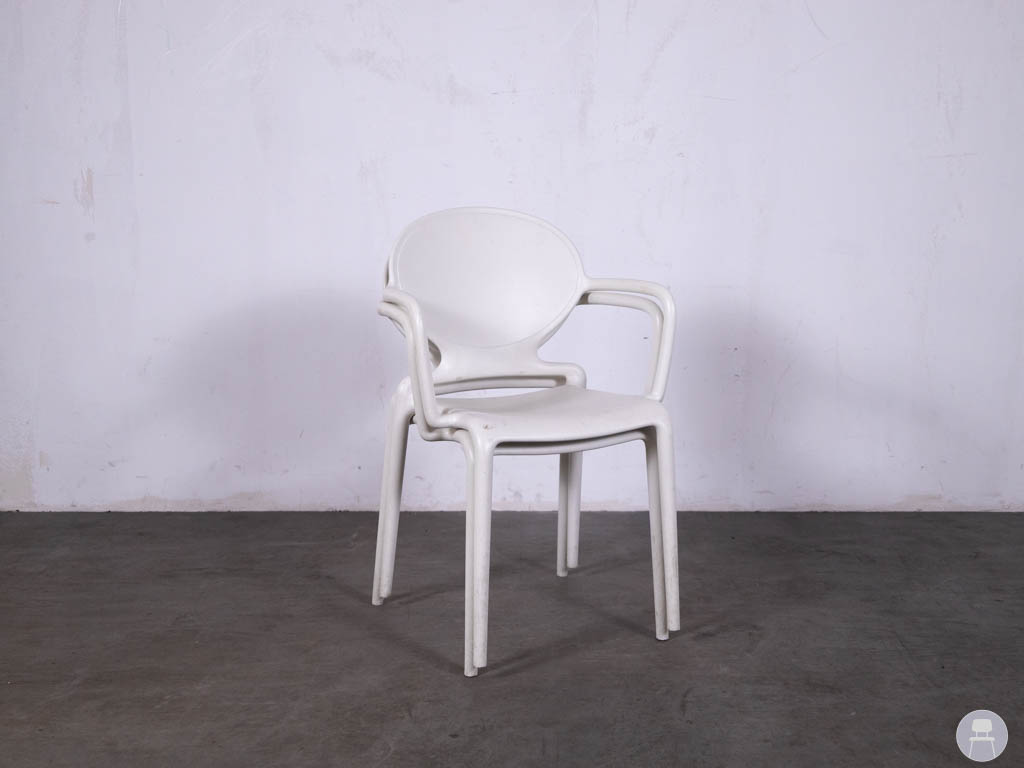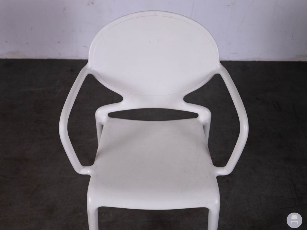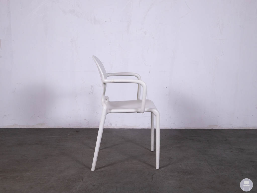 De stoel is gemaakt van wit kunststof, waardoor hij onderhoudsvriendelijk en geschikt is voor zowel binnen- als buitengebruik. Dankzij het ontwerp met armleuningen biedt de stoel extra zitcomfort. Een groot voordeel van de terrasstoel Sonja is dat deze stapelbaar is. Hierdoor kunnen meerdere stoelen eenvoudig en ruimtebesparend worden opgeborgen wanneer ze niet in gebruik zijn. De stoel vertoont gebruikssporen, wat gebruikelijk is bij horeca meubilair, maar is nog prima geschikt voor dagelijks gebruik.