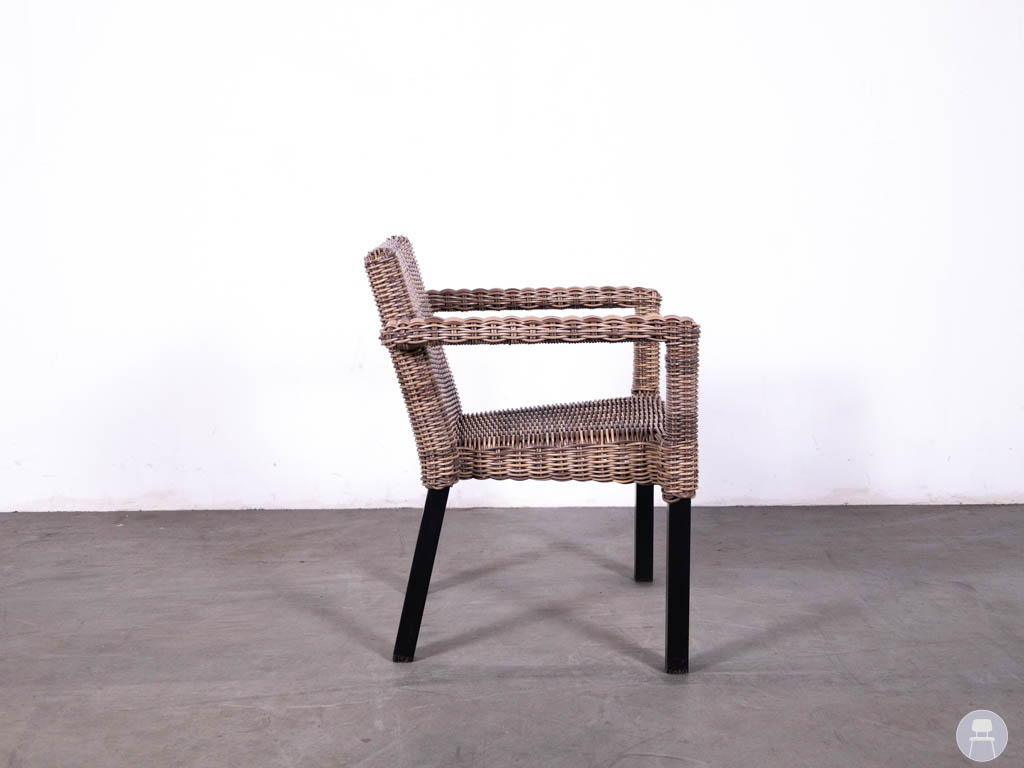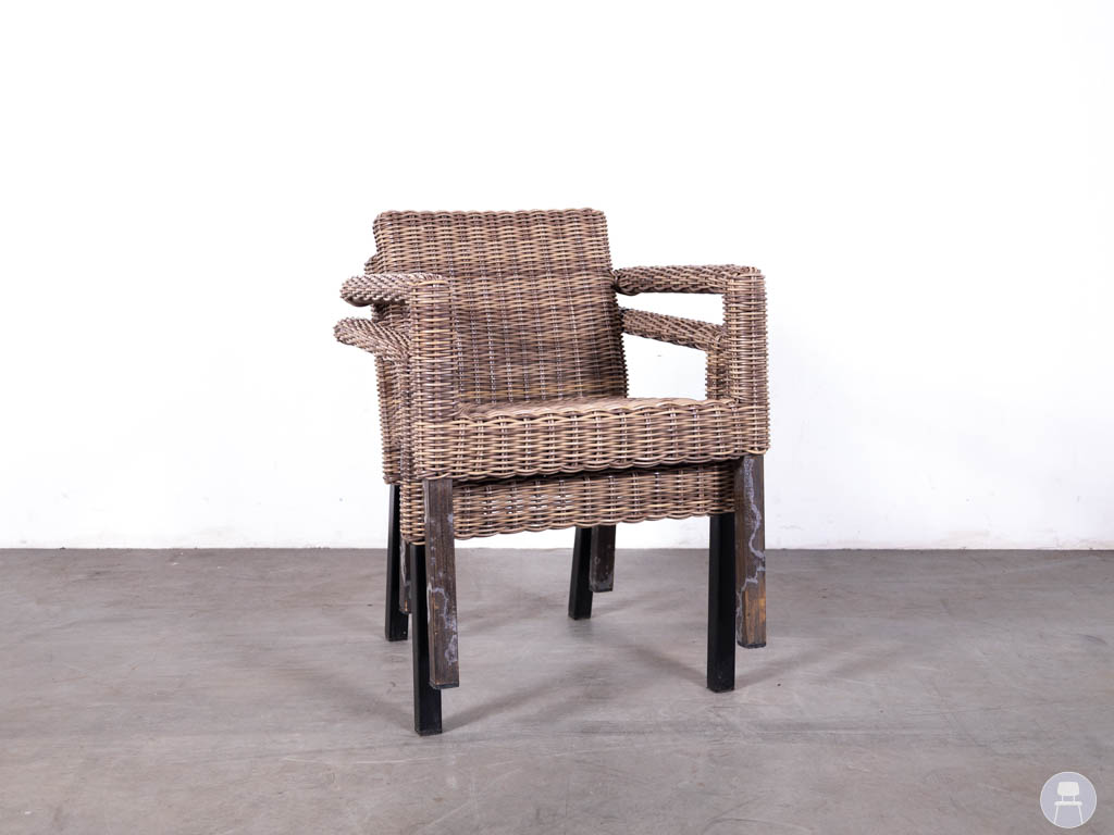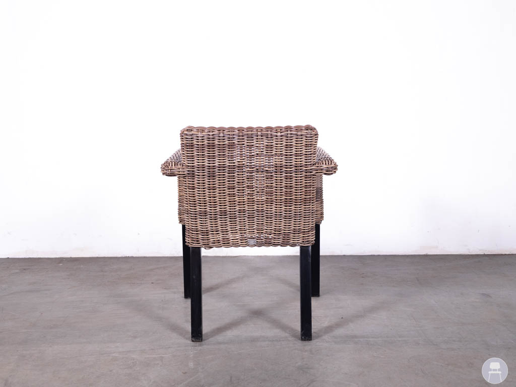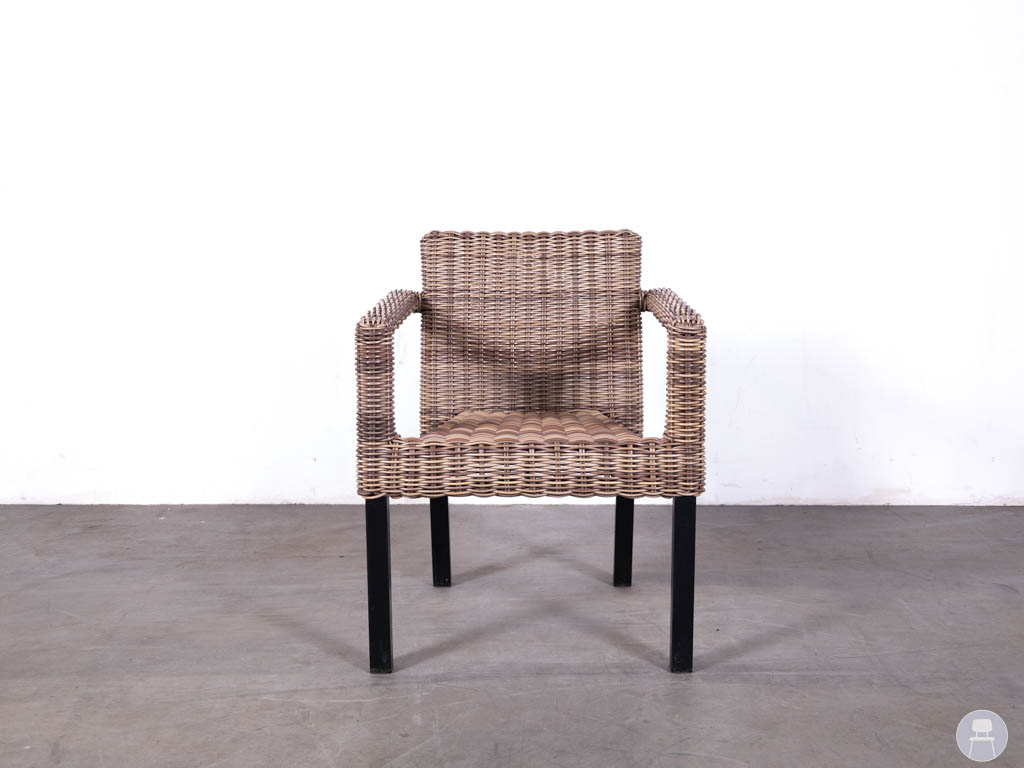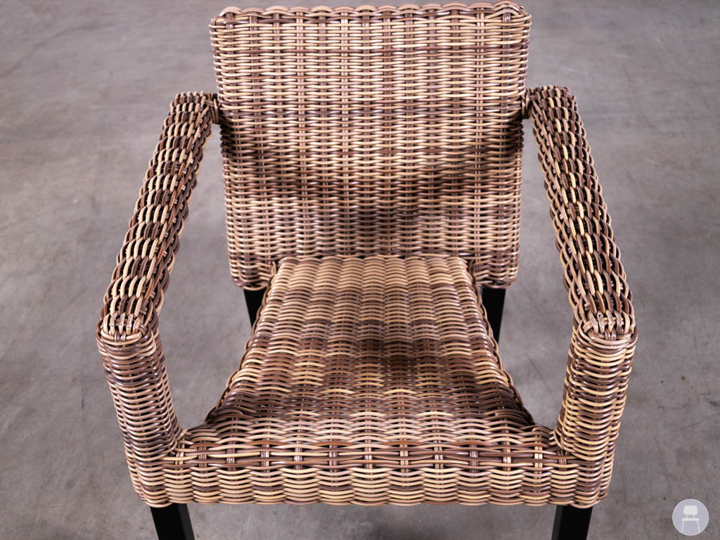 Deze terrasstoel van Satelliet is uitgevoerd in hoogwaardig kunststof wicker in een warme bruine kleur, gecombineerd met een stevig zwart metalen frame. De brede armleuningen en het gevlochten design zorgen voor een luxe en uitnodigende look op ieder terras.