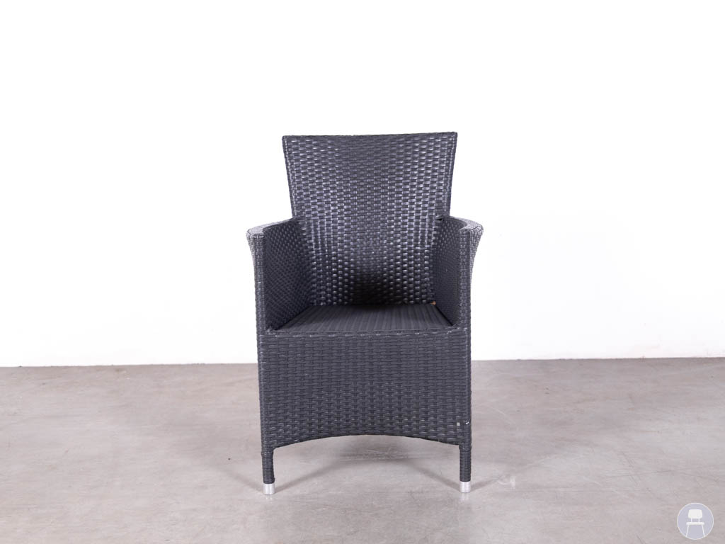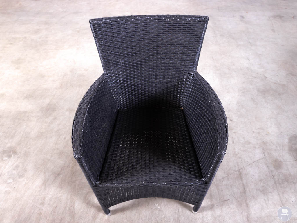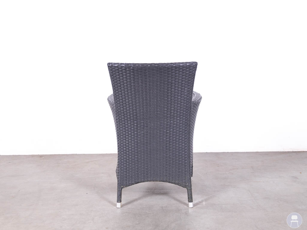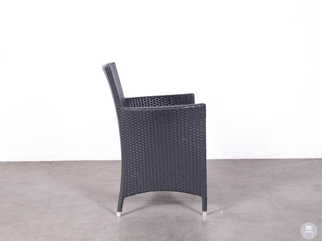 Deze terrasstoel is volledig uitgevoerd in duurzaam wicker (kunststof vlechtwerk) in een strakke zwarte kleur. Het stevige ontwerp met hoge rugleuning en armleuningen zorgt voor extra comfort en ondersteuning voor uw gasten.