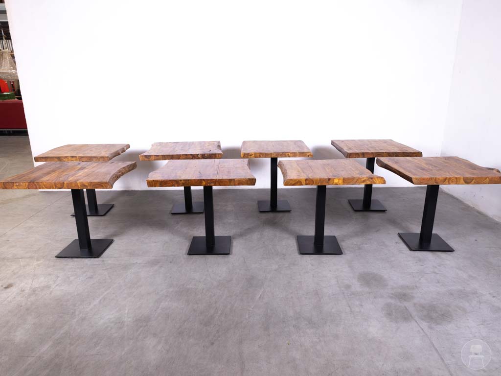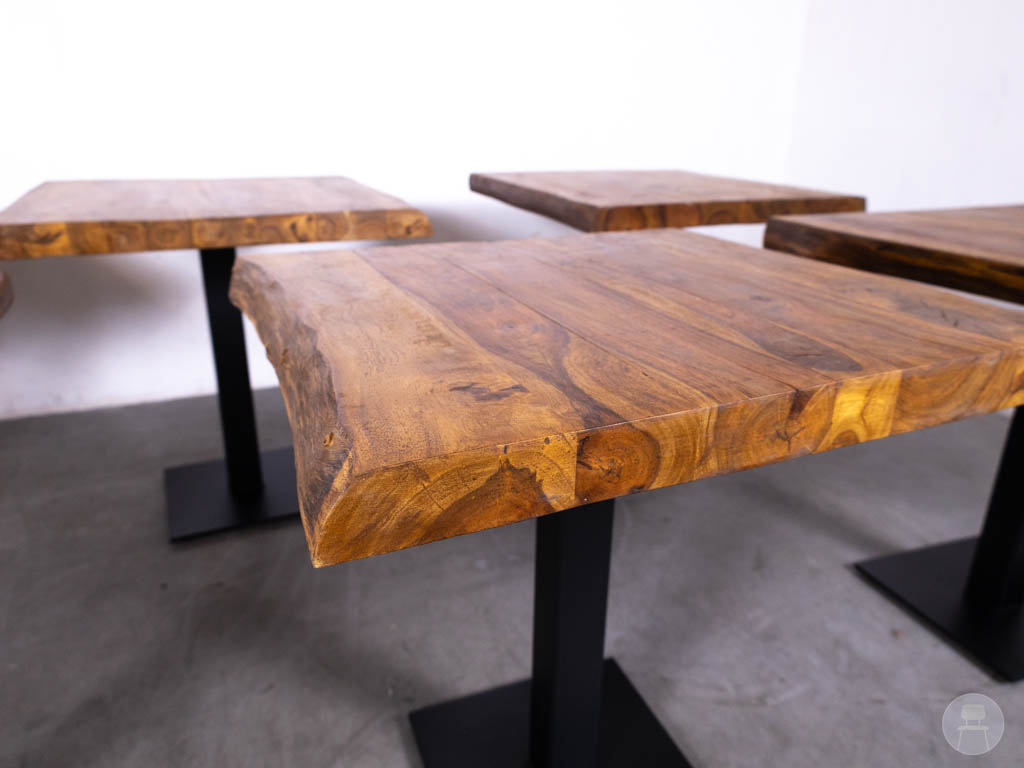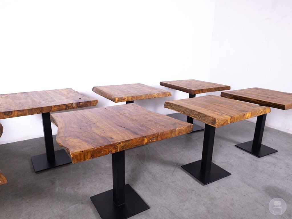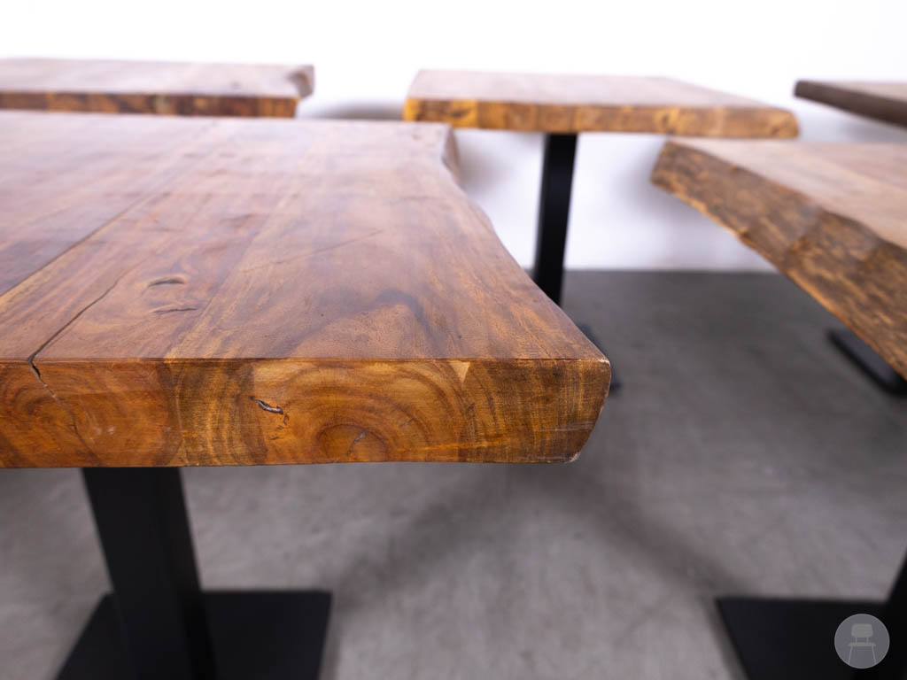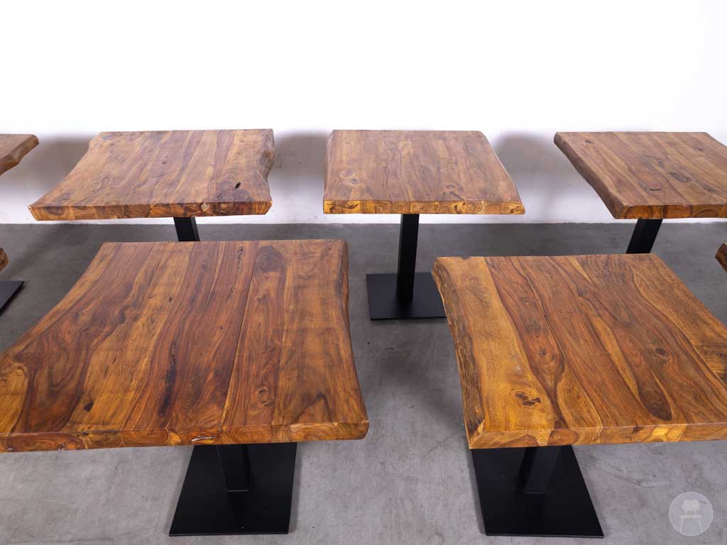 Met 1 set 8 stuks Horecatafel Beau sheesam creëer je direct sfeer in je zaak. De massief sheesam houten bladen hebben allemaal een eigen vorm en afmeting, waardoor geen enkele tafel hetzelfde is. Dat geeft je restaurant, lunchroom of hotelbar een unieke, ambachtelijke uitstraling. De natuurlijke nerf en warme kleur van het hout combineren prachtig met het strakke stalen onderstel in zwart. Samen zorgt dit voor een stoere, maar toch verfijnde look die perfect past in industriële, vintage of juist moderne interieurs.