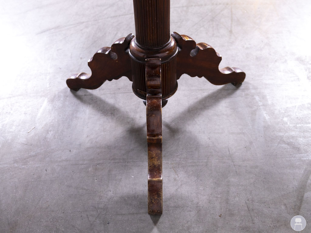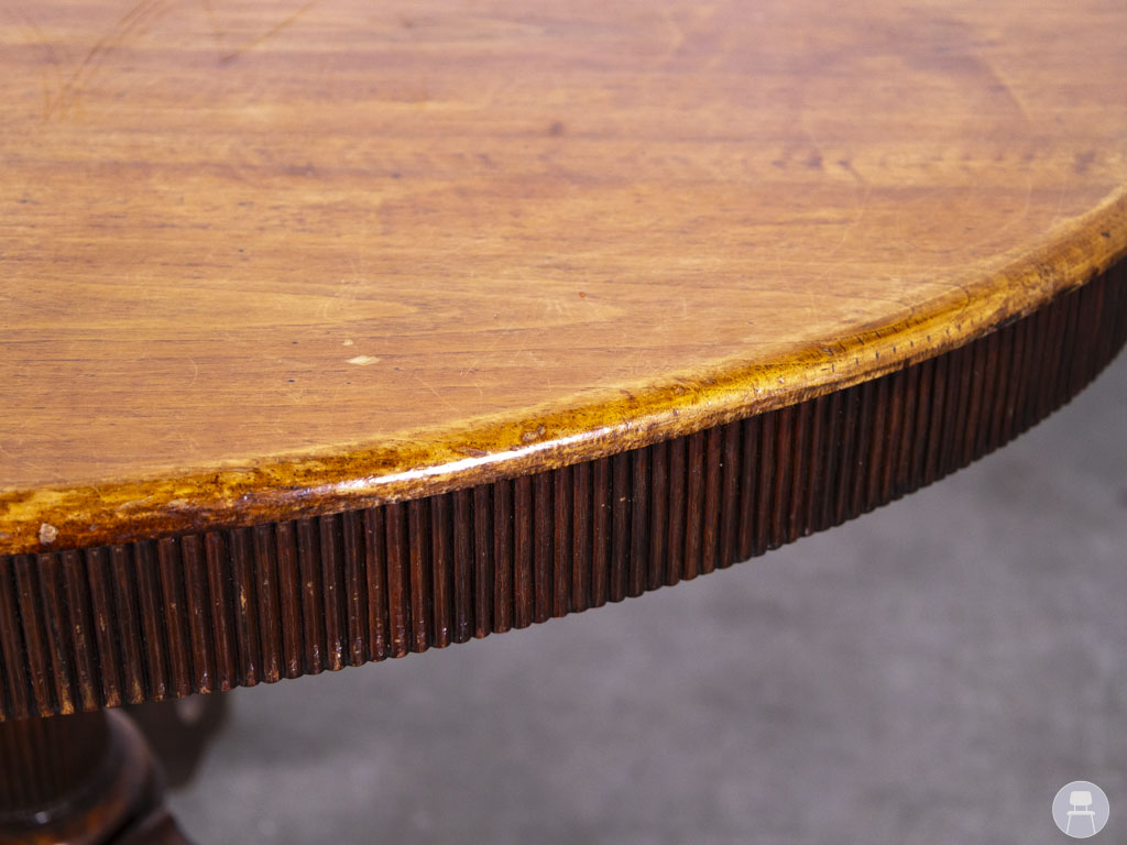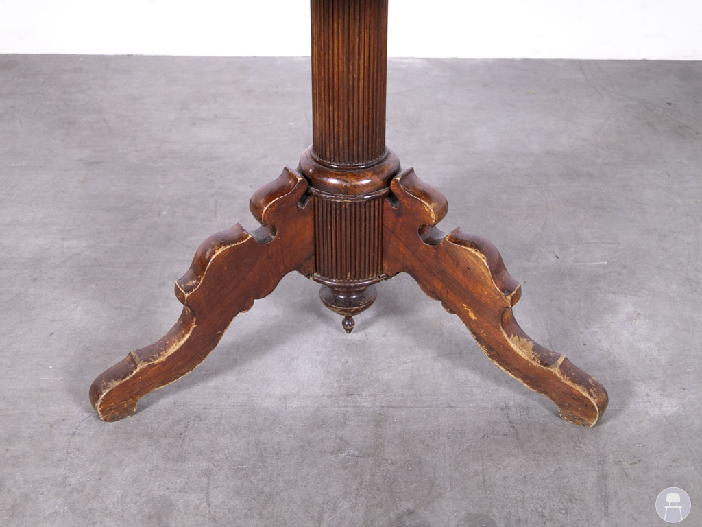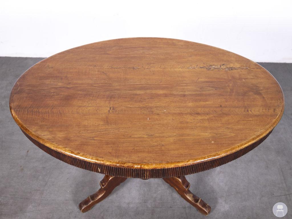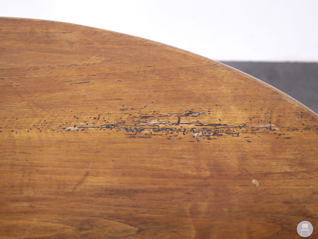 Het ovale tafelblad meet 110 bij 72 cm en toont gebruikssporen die bijdragen aan het authentieke karakter van deze tweedehands tafel. Het onderstel met sierlijke houten poten zorgt voor stabiliteit én charme, en maakt deze horecatafel tot een echte blikvanger binnen een vintage of rustiek interieur.