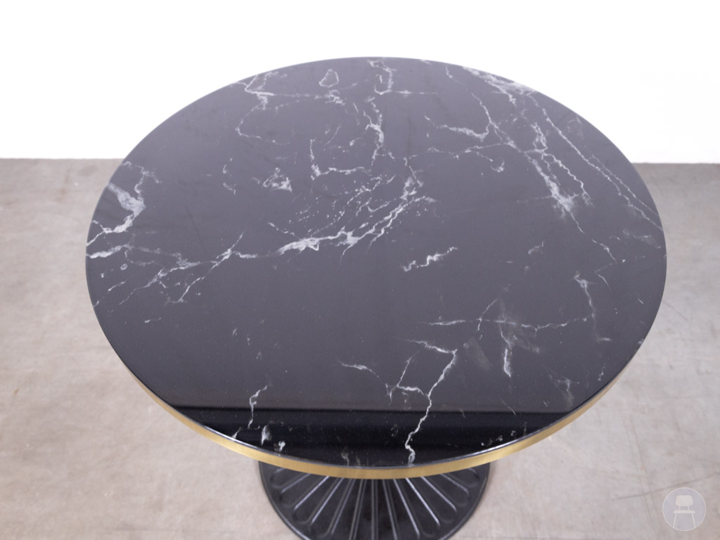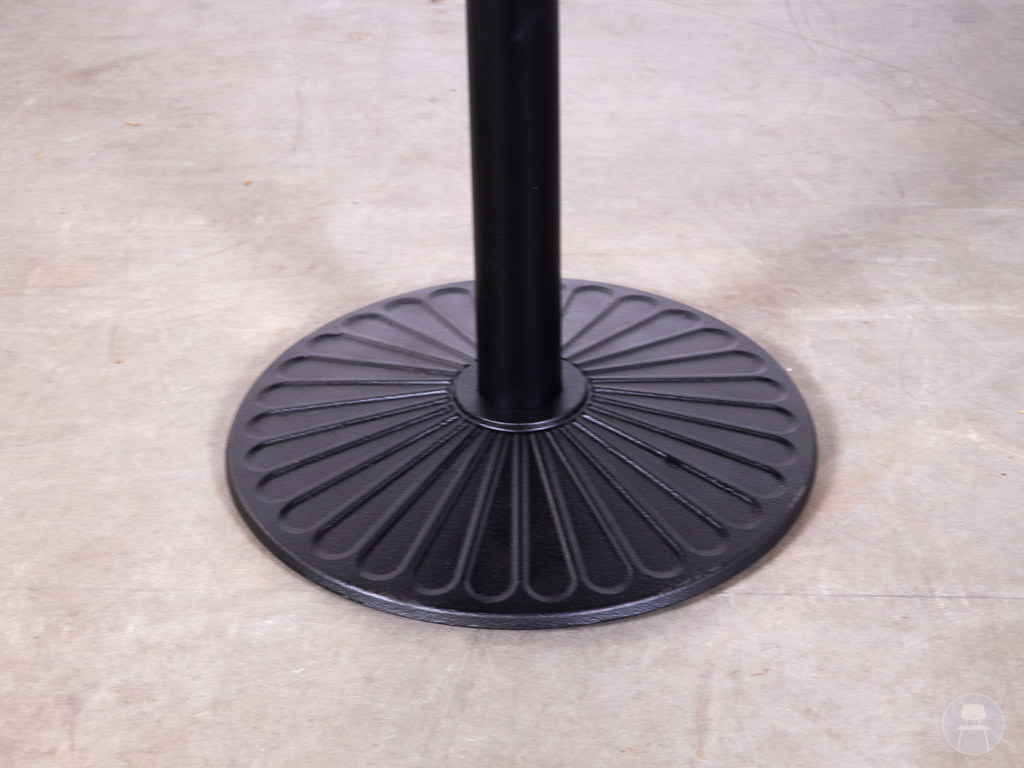 Het stevige zwarte metalen onderstel met een decoratieve voet zorgt voor stabiliteit en geeft de tafel een klassieke, luxe uitstraling. De centrale kolom biedt daarnaast voldoende beenruimte, wat het comfort verhoogt. Deze horecatafel is afkomstig van het bekende horecamerk Satelliet en staat bekend om zijn stevige kwaliteit en duurzame materialen. Let op: de tafel kan lichte gebruikssporen vertonen.