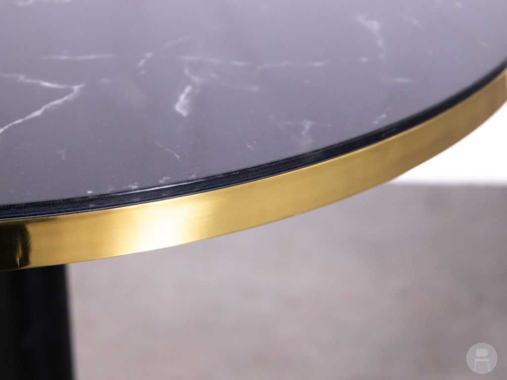 Horecatafel Bonnie marmerlook glas Satelliet 80cm rond is een luxe en stijlvolle tafel die perfect past binnen moderne en chique horeca-interieurs. De tafel is uitgevoerd met een rond glazen tafelblad van 80 cm met een elegante zwarte marmerlook, afgewerkt met een verfijnde messingkleurige rand.