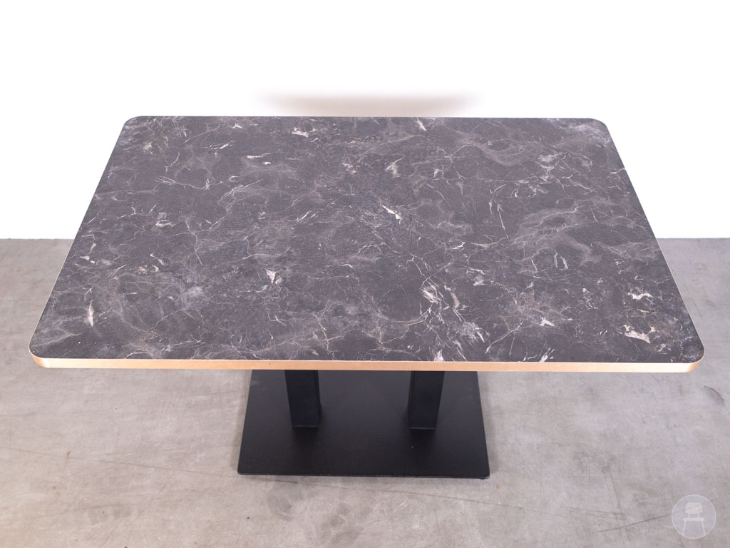 Het blad van 120×80 cm biedt voldoende ruimte voor gasten en is dankzij het melamine materiaal krasbestendig en onderhoudsvriendelijk, ideaal voor intensief horecagebruik. De combinatie van marmerlook en metaal zorgt voor een stijlvolle en eigentijdse uitstraling.
