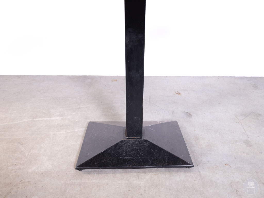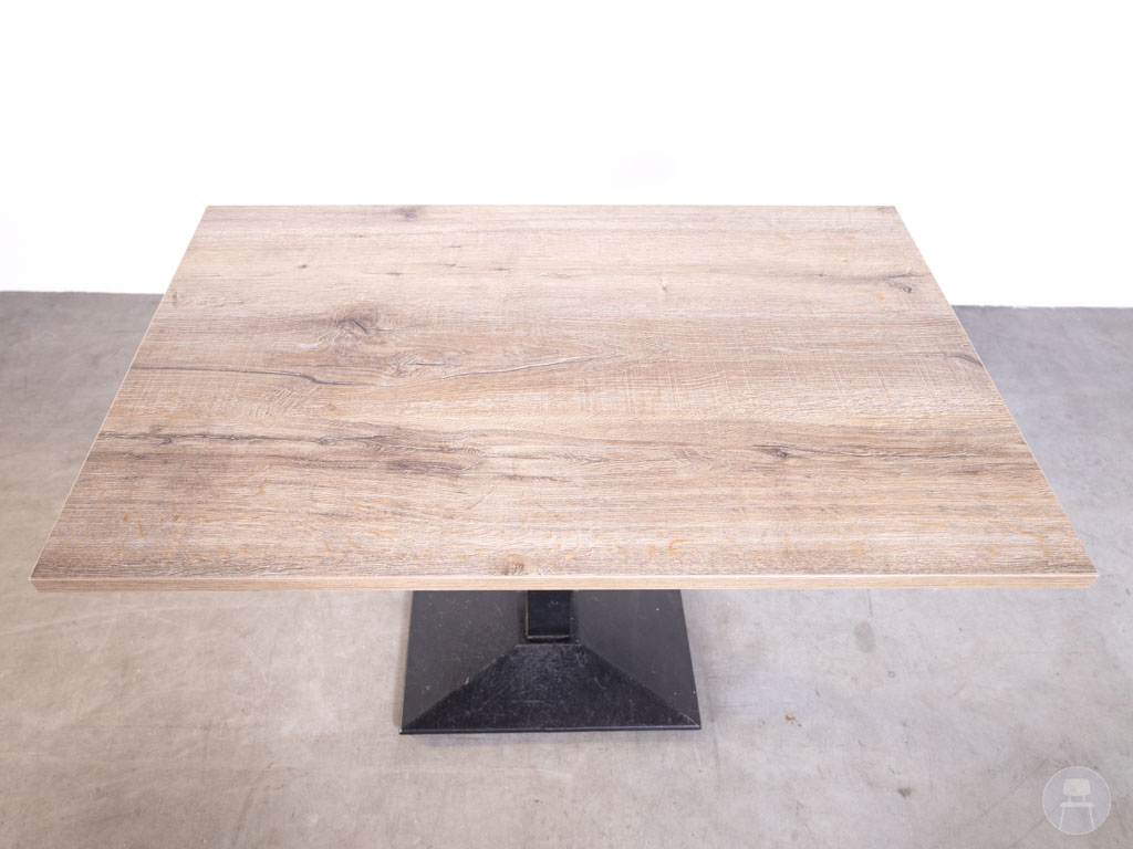 Deze rechthoekige horecatafel van 120×70 cm is voorzien van een sterk melamine blad in lichte houtlook. Het blad is krasbestendig, onderhoudsvriendelijk en eenvoudig schoon te maken, wat perfect is voor dagelijks gebruik in de horeca. Het zwarte stalen onderstel met centrale kolom en stevige voet zorgt voor optimale stabiliteit en voldoende beenruimte voor gasten.