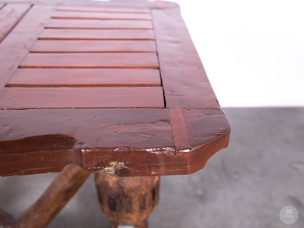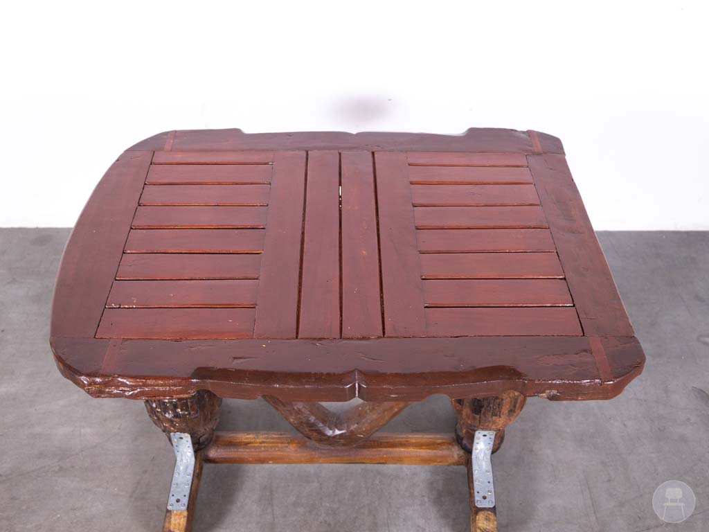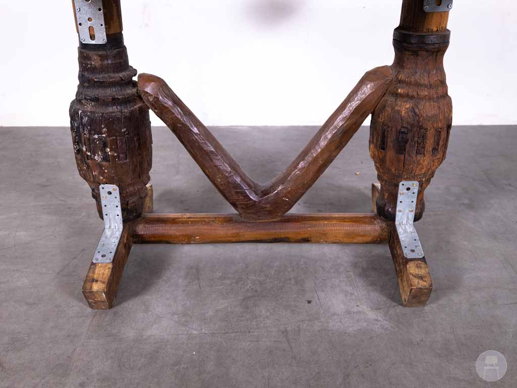 Horecatafel Kiki 100x75cm is zo’n stuk waar je gasten spontaan naar toe worden getrokken. Helemaal massief hout, zwaar, robuust en absoluut niet doorsnee. Het blad bestaat uit brede planken met een warme bruine finish en een licht verouderde glans. De randen zijn onregelmatig en organisch gevormd, waardoor de tafel oogt alsof hij rechtstreeks uit een ambachtelijke werkplaats komt. Het onderstel met de gedraaide poten, het karakteristieke V-element en de zichtbare metalen hoekbeugels geeft een stoere, bijna industriële twist aan het geheel. Dit is geen perfecte showroomtafel, maar een meubel met verhalen, gebruikssporen en charme.