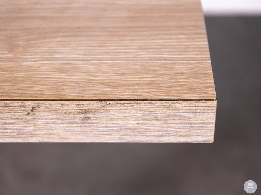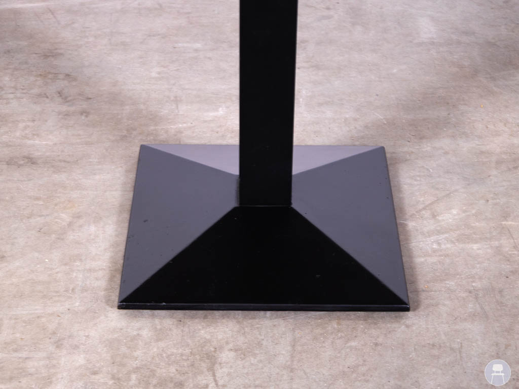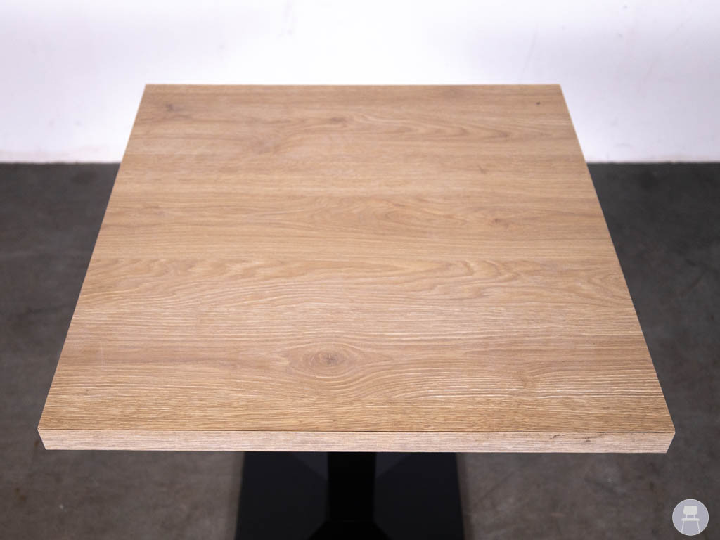 Het vierkante tafelblad heeft een houtlook afwerking, wat zorgt voor een warme en natuurlijke uitstraling. Hierdoor is de tafel eenvoudig te combineren met verschillende interieurstijlen, van modern tot industrieel. De tafel staat op een zwart metalen onderstel met vierkante voet, wat zorgt voor een stevige en stabiele basis. Dankzij het formaat van 65 x 65 cm is de tafel ideaal voor twee personen en geschikt voor zowel kleine als grotere horecaruimtes.