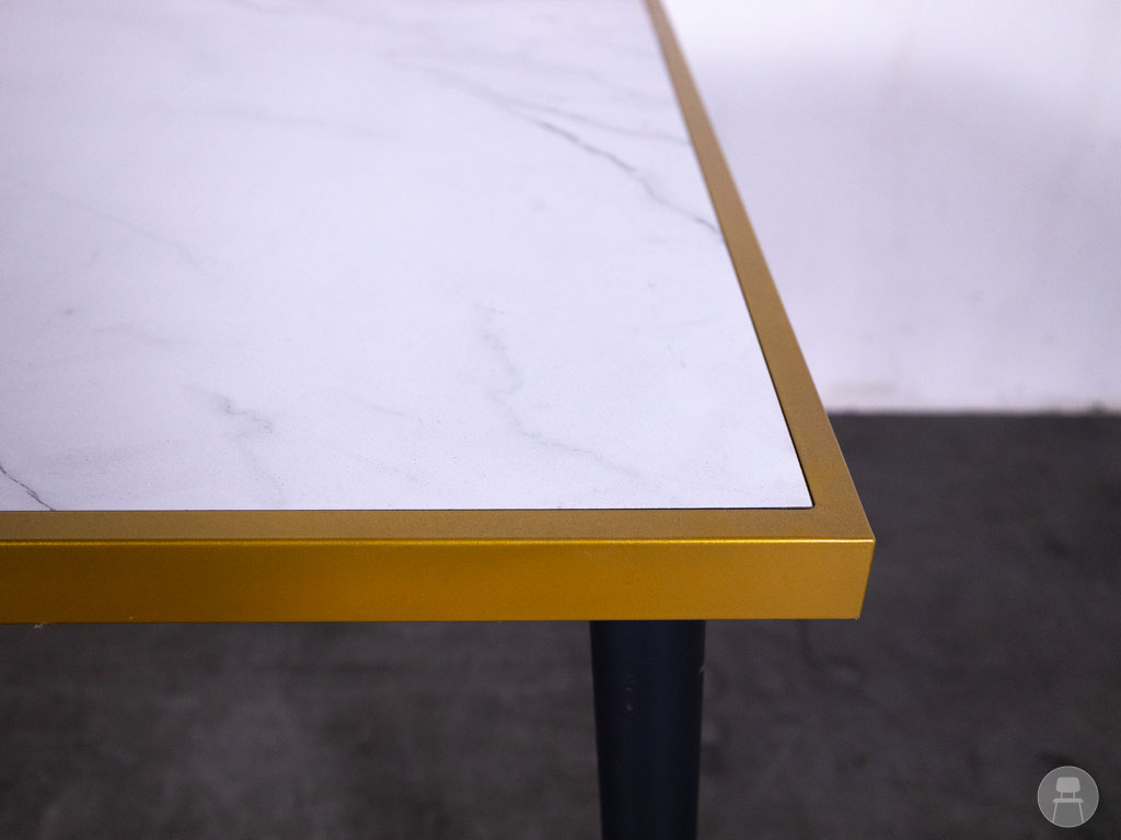 Horecatafel Mabel marmerlook wit/goud 120x80cm geeft je horecazaak een stijlvolle en moderne uitstraling. Het tafelblad heeft een luxe wit marmerlook dessin met subtiele grijze aders, omlijst door een gouden rand die zorgt voor een chique accent. De slanke, zwarte poten geven de tafel een elegante uitstraling en zorgen voor een stabiele basis. Dankzij het formaat is deze horecatafel ideaal voor cafés, restaurants, hotellounges of als eyecatcher in een ontvangstruimte. Het blad is onderhoudsvriendelijk en eenvoudig schoon te maken — perfect voor intensief gebruik in de horeca.
