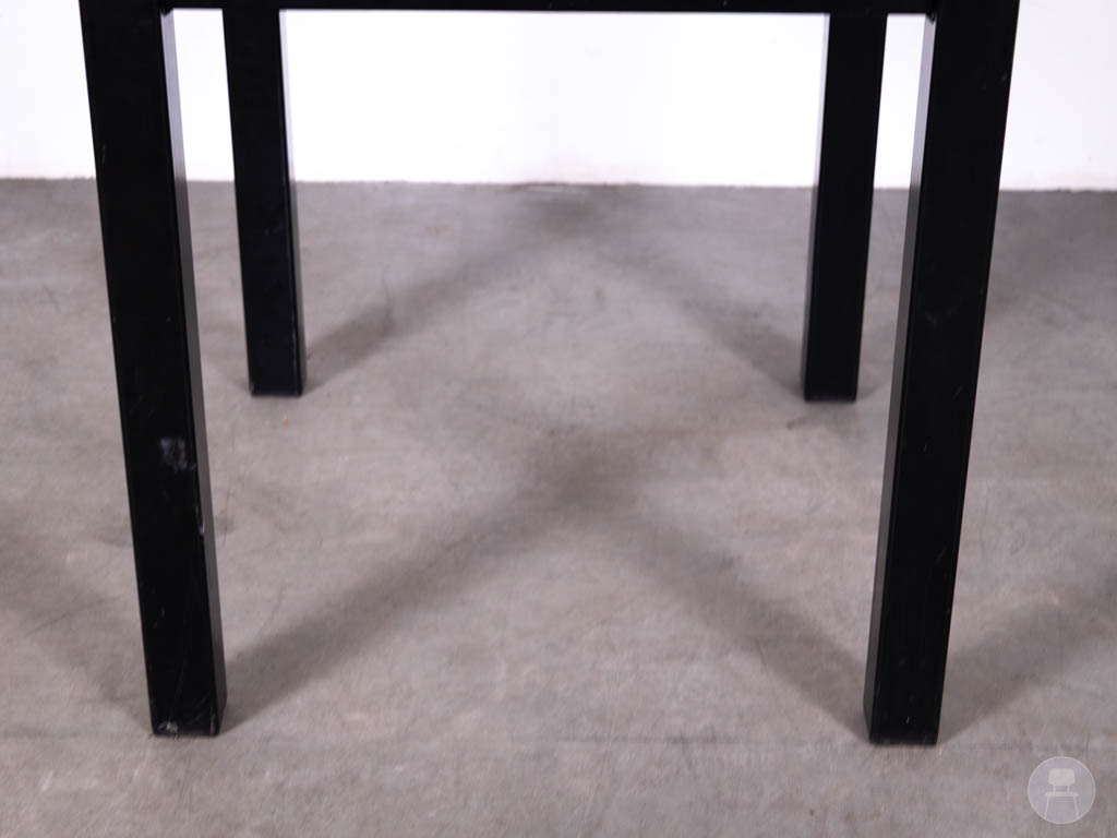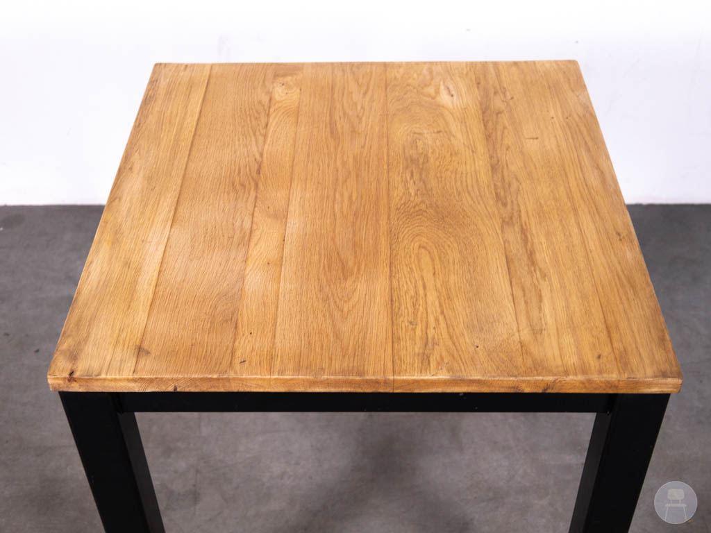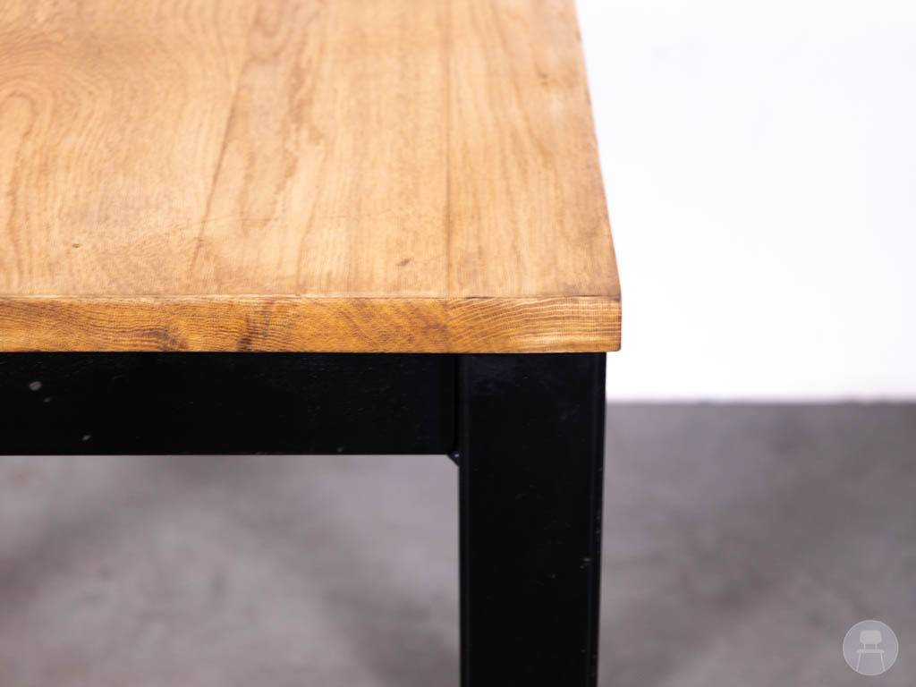 Het onderstel is uitgevoerd in zwart staal met rechte poten, wat zorgt voor een stevige constructie en een industriële uitstraling. De combinatie van eikenhout en zwart staal maakt deze tafel tijdloos en eenvoudig te combineren met diverse horecastoelen.