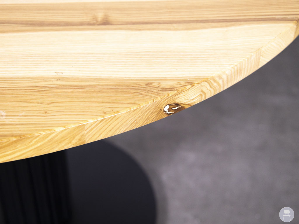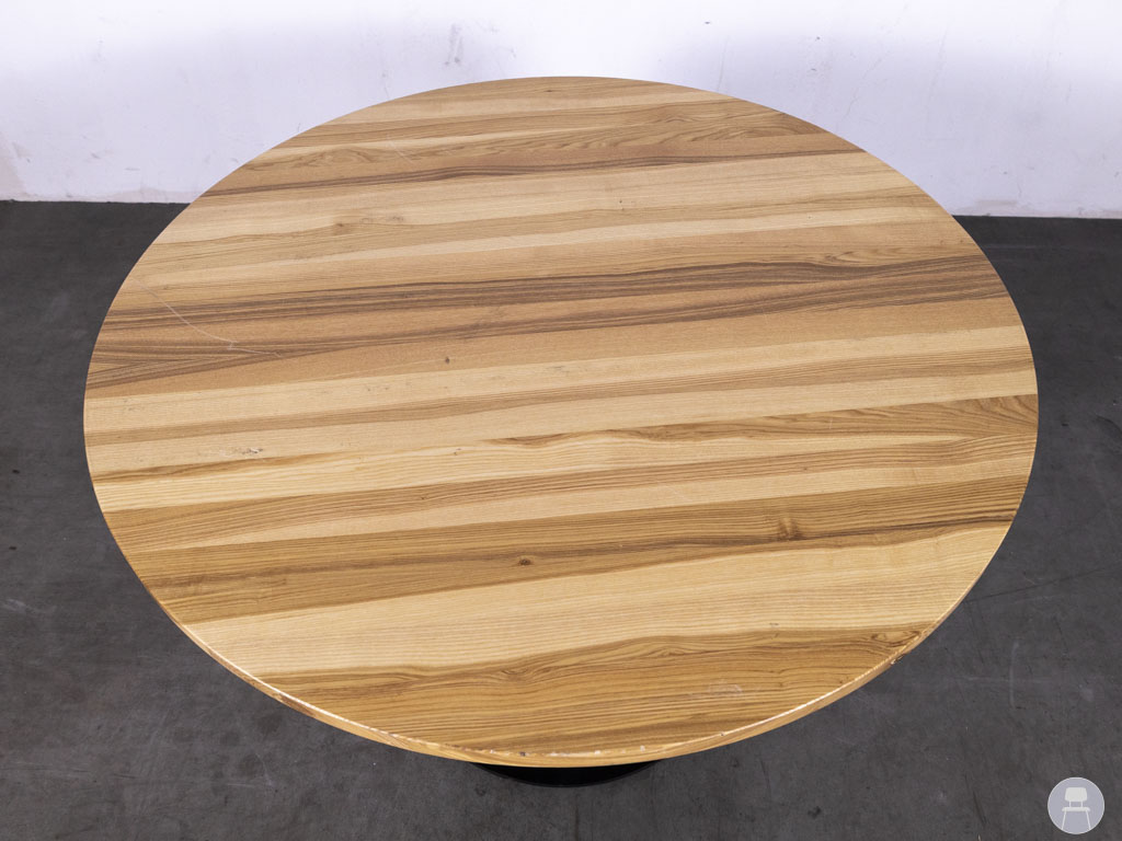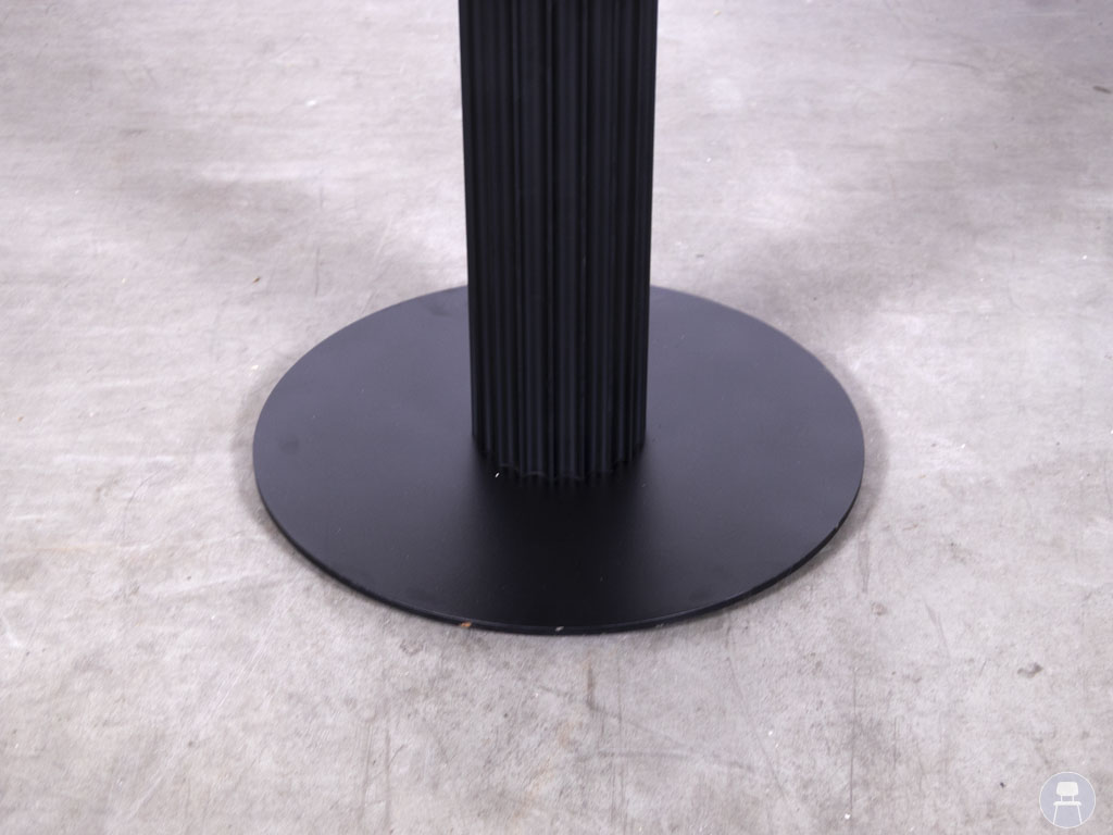 Horecatafel Nadine Lonneke eiken Satelliet 110cm rond is een stijlvolle en robuuste tafel, ontworpen voor intensief gebruik in de horeca. Deze ronde tafel heeft een diameter van 110 cm en is voorzien van een massief eikenhouten blad met een natuurlijke houtnerf, wat zorgt voor een warme en authentieke uitstraling. Het blad vertoont enkele lichte gebruikssporen, maar is nog steeds stevig en representatief. Het zwarte trompetonderstel met ribstructuur zorgt voor een stabiele basis en geeft de horecatafel een moderne, industriële uitstraling. Deze tafel is geproduceerd door Satelliet, een bekend merk binnen de horecameubelbranche.