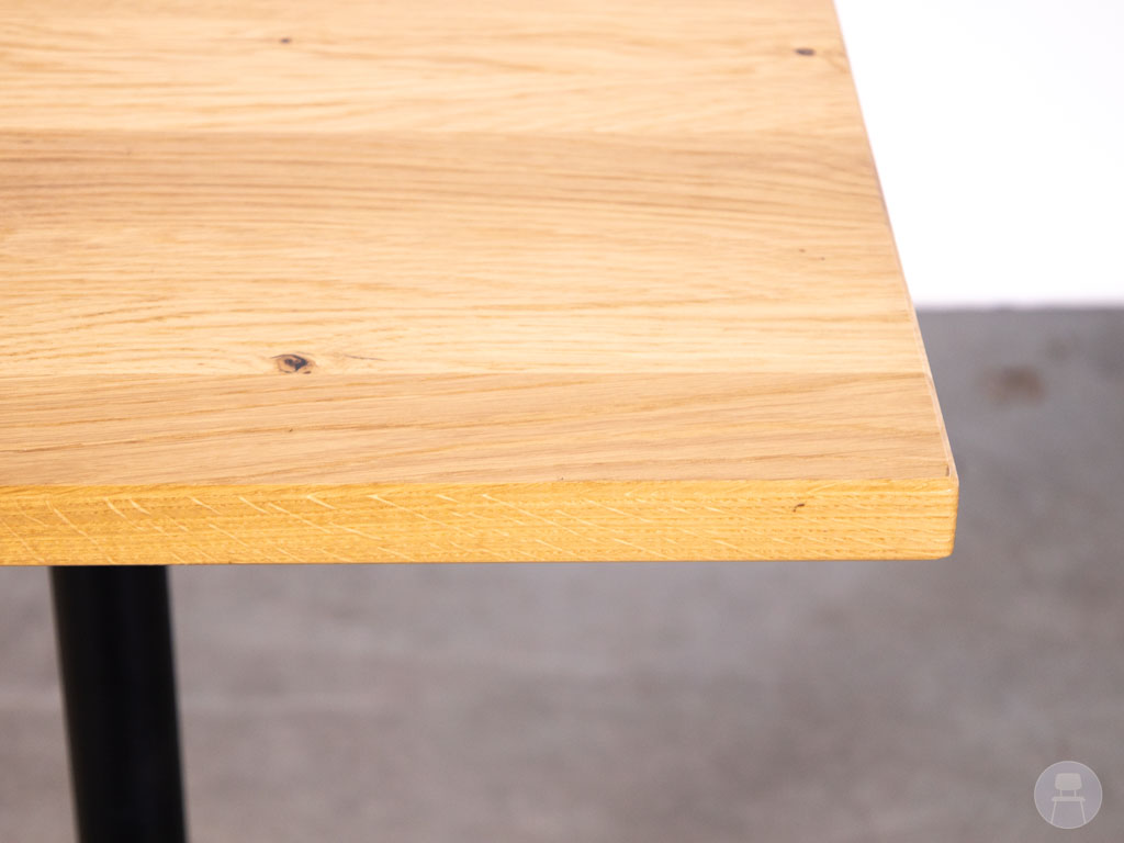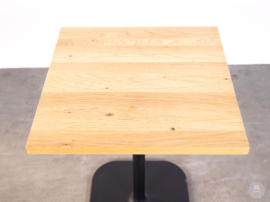 Het tafelblad is uitgevoerd in eikenhout, wat zorgt voor een warme en natuurlijke uitstraling die goed past binnen zowel moderne als industriële interieurs. Het stevige metalen onderstel in zwarte kleur biedt optimale stabiliteit en is ontworpen voor intensief horeca gebruik.