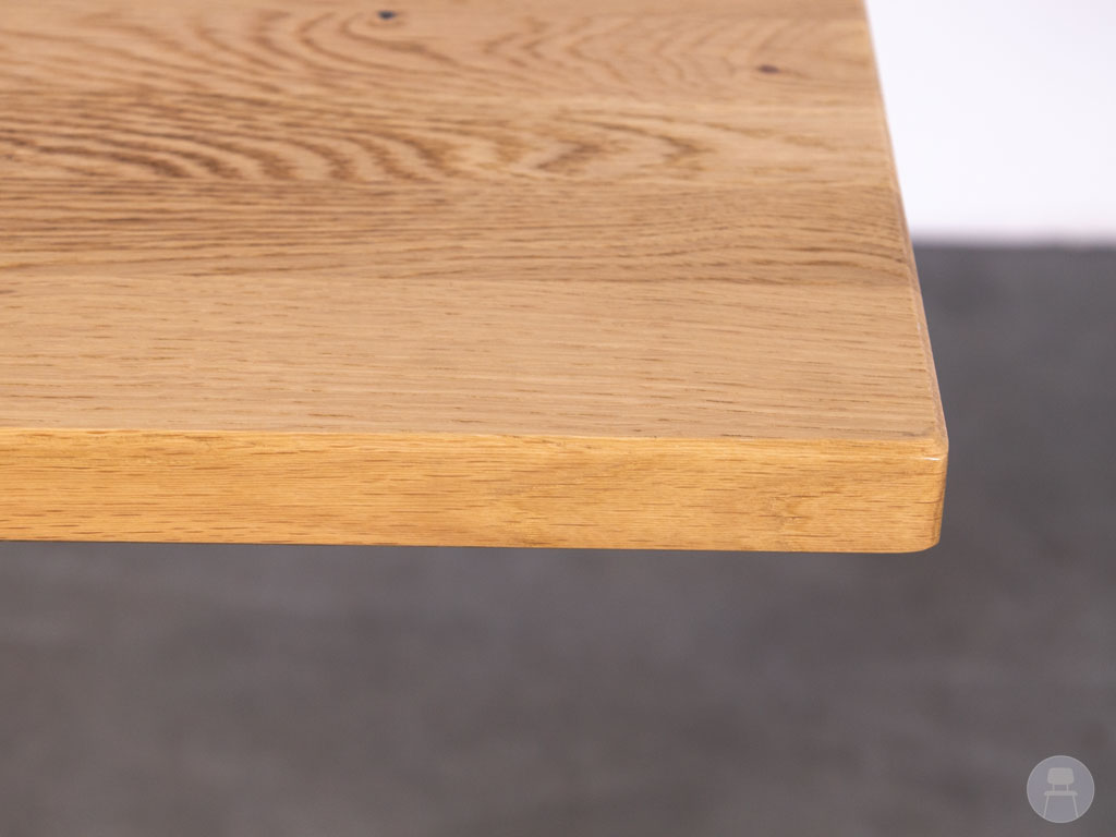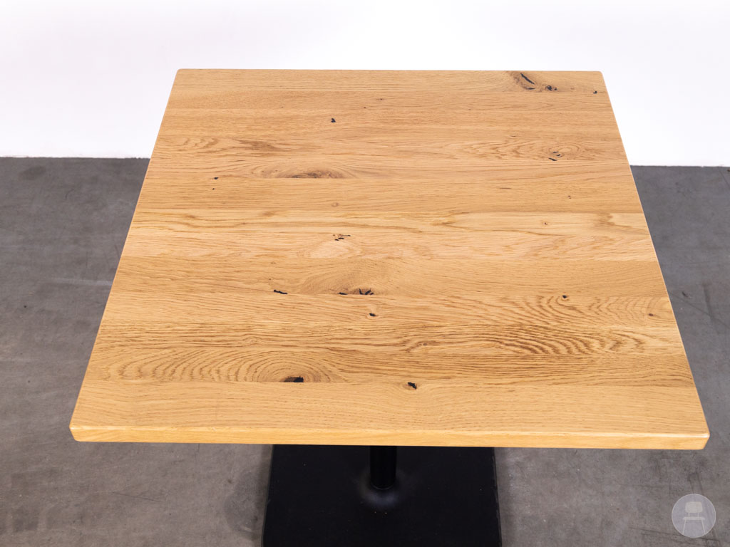 Het tafelblad is uitgevoerd in eikenhout, wat zorgt voor een warme en natuurlijke uitstraling die goed past binnen zowel moderne als industriële interieurs. Het stevige metalen onderstel in zwarte kleur biedt optimale stabiliteit en is ontworpen voor intensief horeca gebruik.