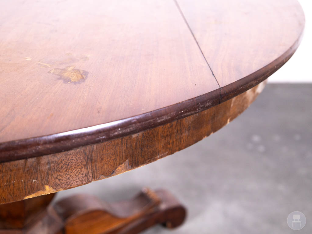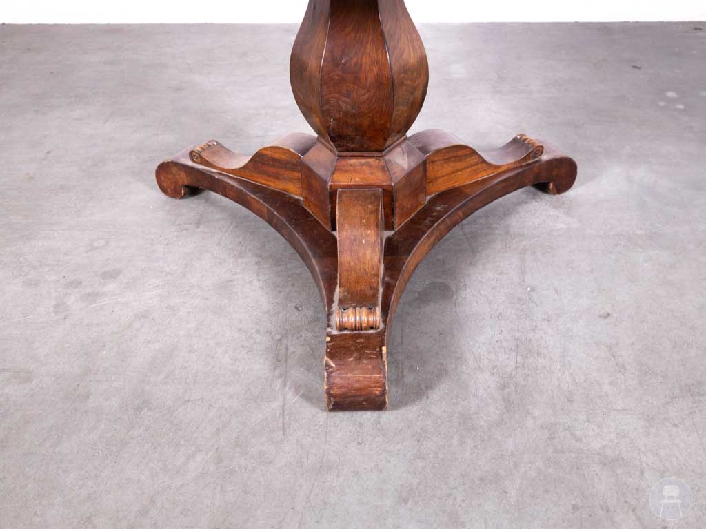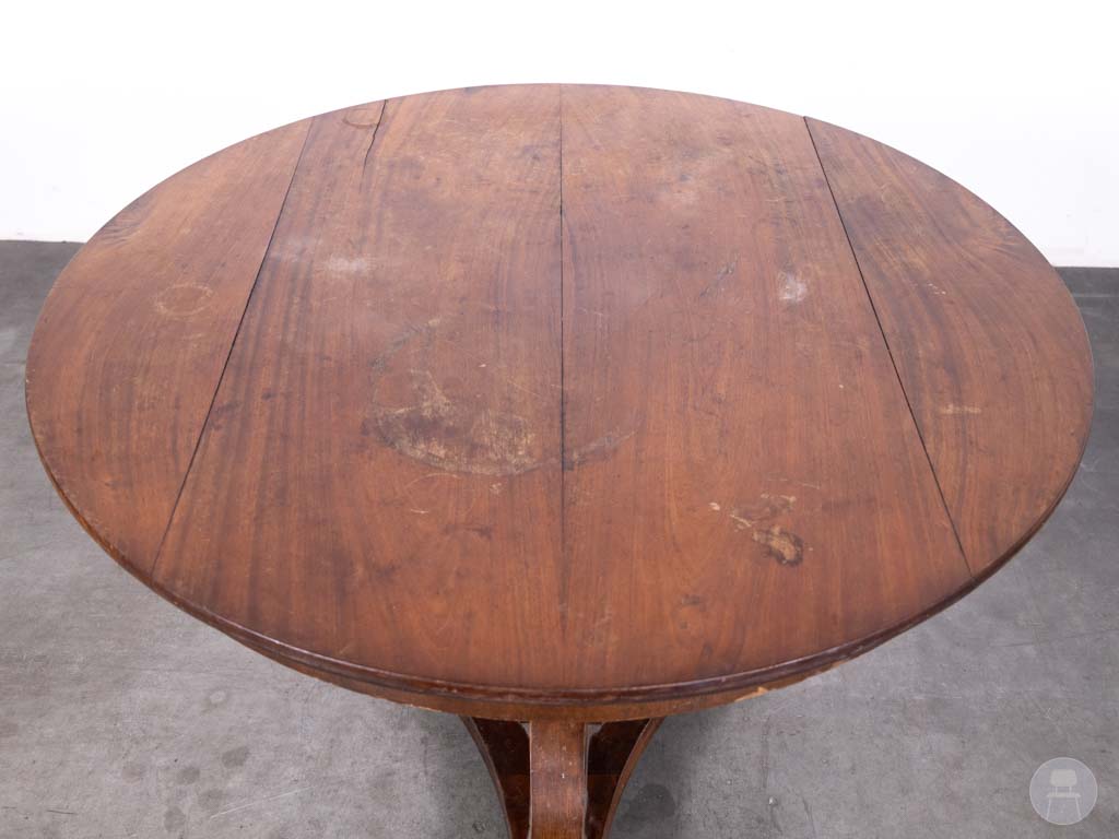Het robuuste houtwerk en de massieve poot zorgen voor stabiliteit en duurzaamheid, terwijl het karaktervolle tafelblad lichte gebruikssporen vertoont die bijdragen aan de authentieke uitstraling van deze tafel. Perfect te gebruiken in restaurants, brasserieën of hotelinterieurs waar charme en geschiedenis samenkomen.