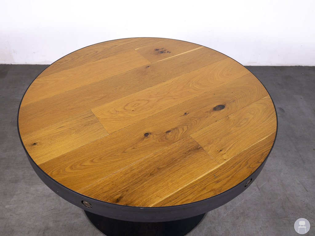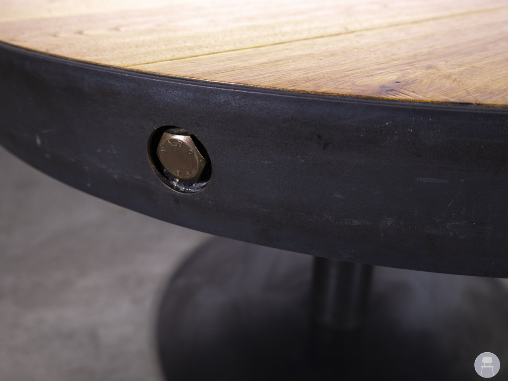 Horecatafel Simso eiken 126cm rond is een indrukwekkende verschijning die direct het hart steelt in elk horeca concept met lef. Het royale ronde blad is vervaardigd uit massief eikenhout, waarbij de natuurlijke houtnerf prachtig naar voren komt. Rondom het blad is een stoere stalen band bevestigd, compleet met zichtbare bouten, wat deze tafel zijn krachtige, industriële uitstraling geeft. De combinatie van het warme eiken en het donkere staal zorgt voor een spannend contrast dat zowel ruig als verfijnd oogt.