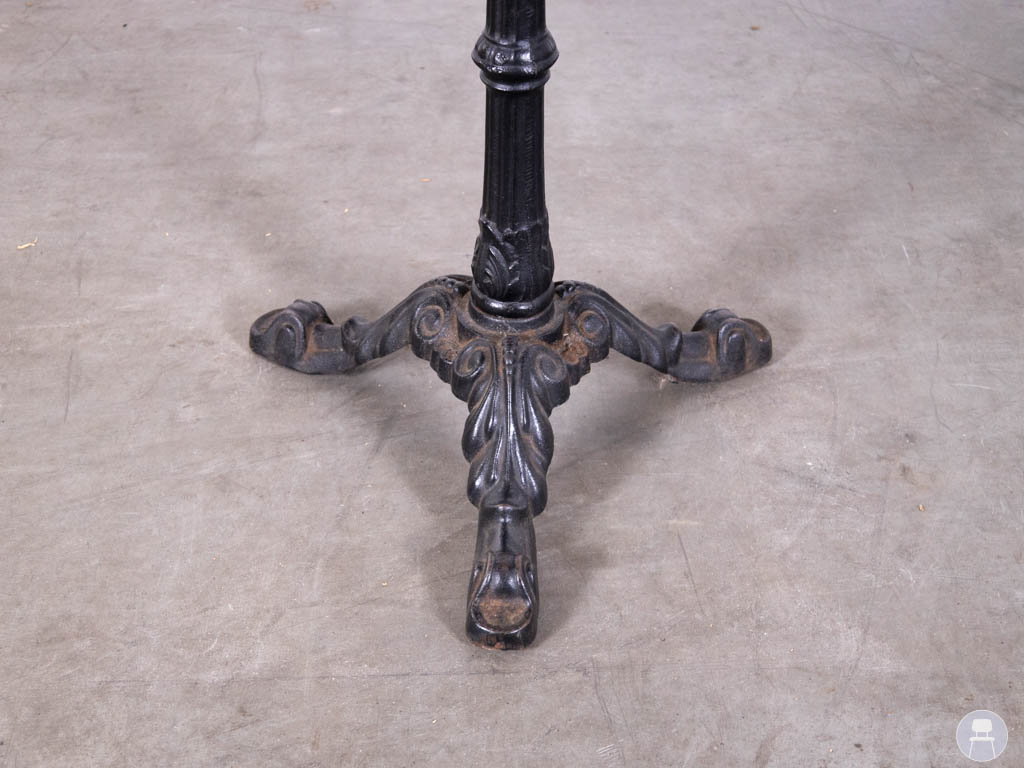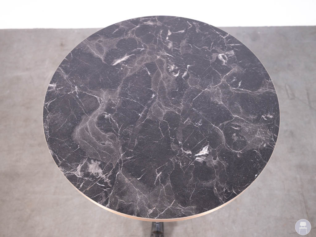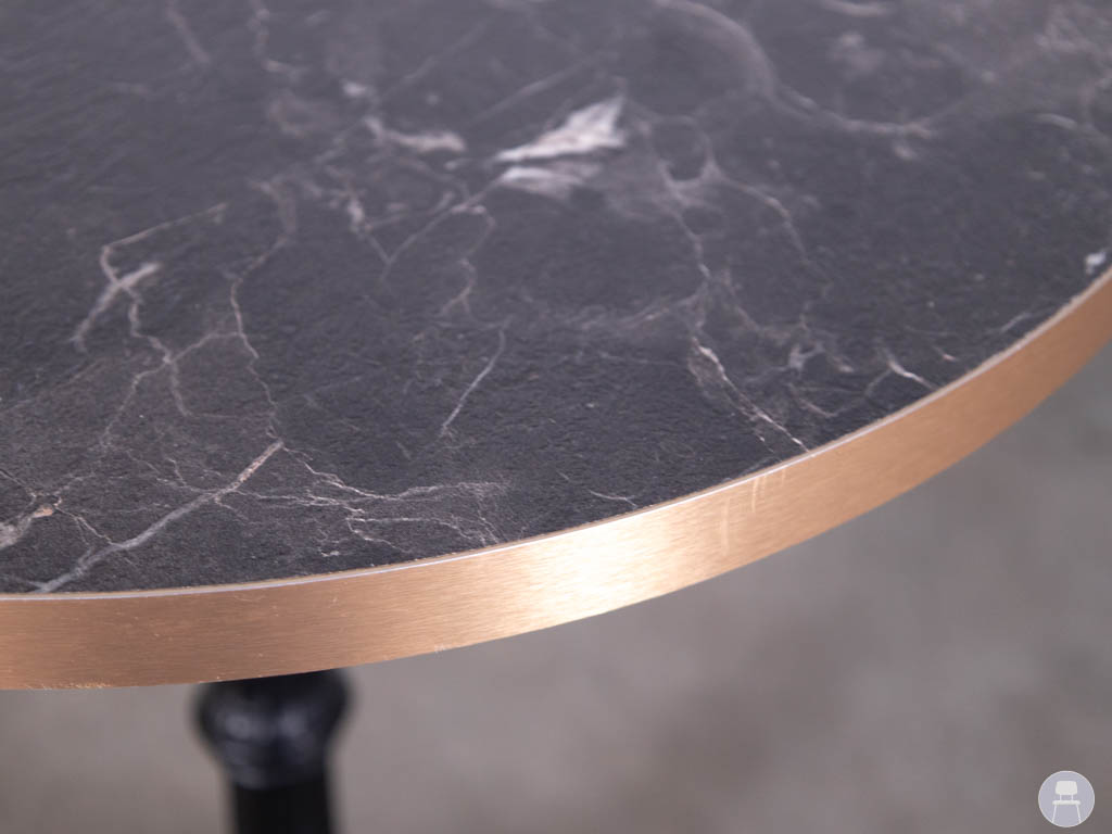 Het ronde tafelblad van 60 cm heeft een zwarte marmerlook en is uitgevoerd in HPL, waardoor het blad duurzaam en geschikt is voor intensief gebruik. De koperkleurige metalen rand geeft de tafel een luxe en verfijnde uitstraling. De tafel staat op een stevig gietijzeren castle onderstel, wat zorgt voor stabiliteit en een klassieke horecastijl.