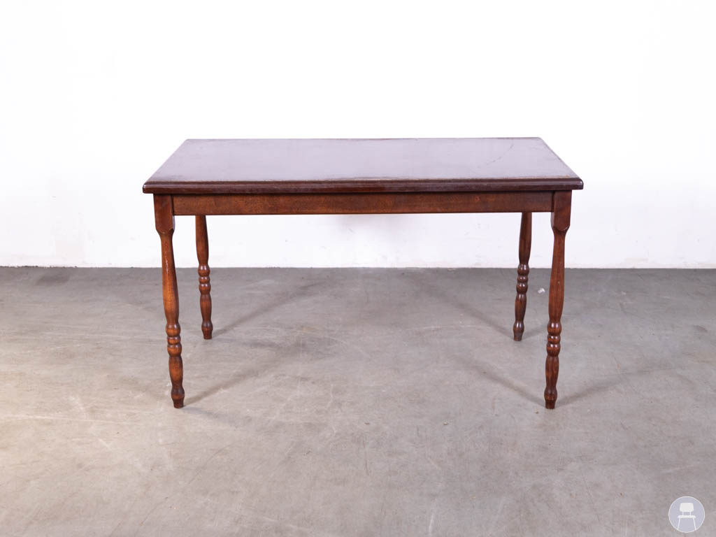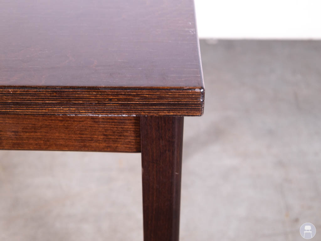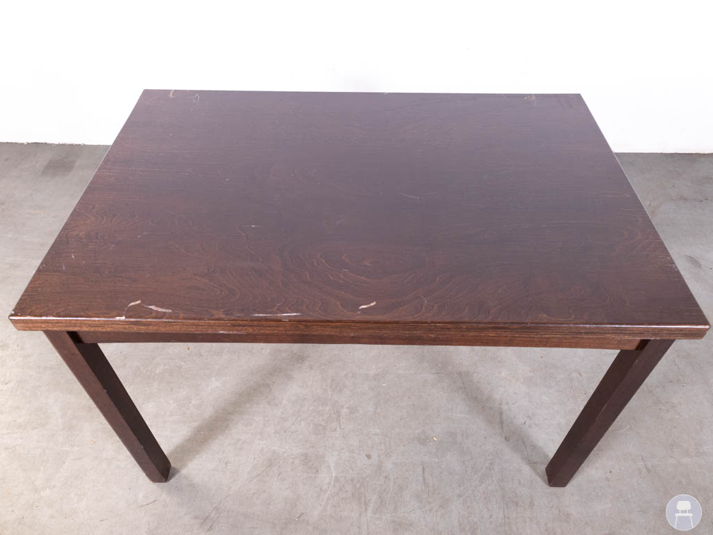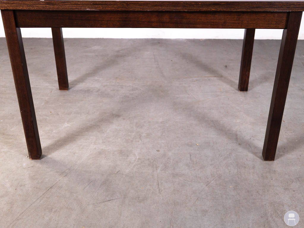 Het tafelblad is uitgevoerd in hout met een diepe bruine kleur, wat zorgt voor een warme en tijdloze uitstraling. Het strakke ontwerp in combinatie met de stevige houten poten maakt deze restauranttafel geschikt voor diverse interieurstijlen, van klassiek tot modern.