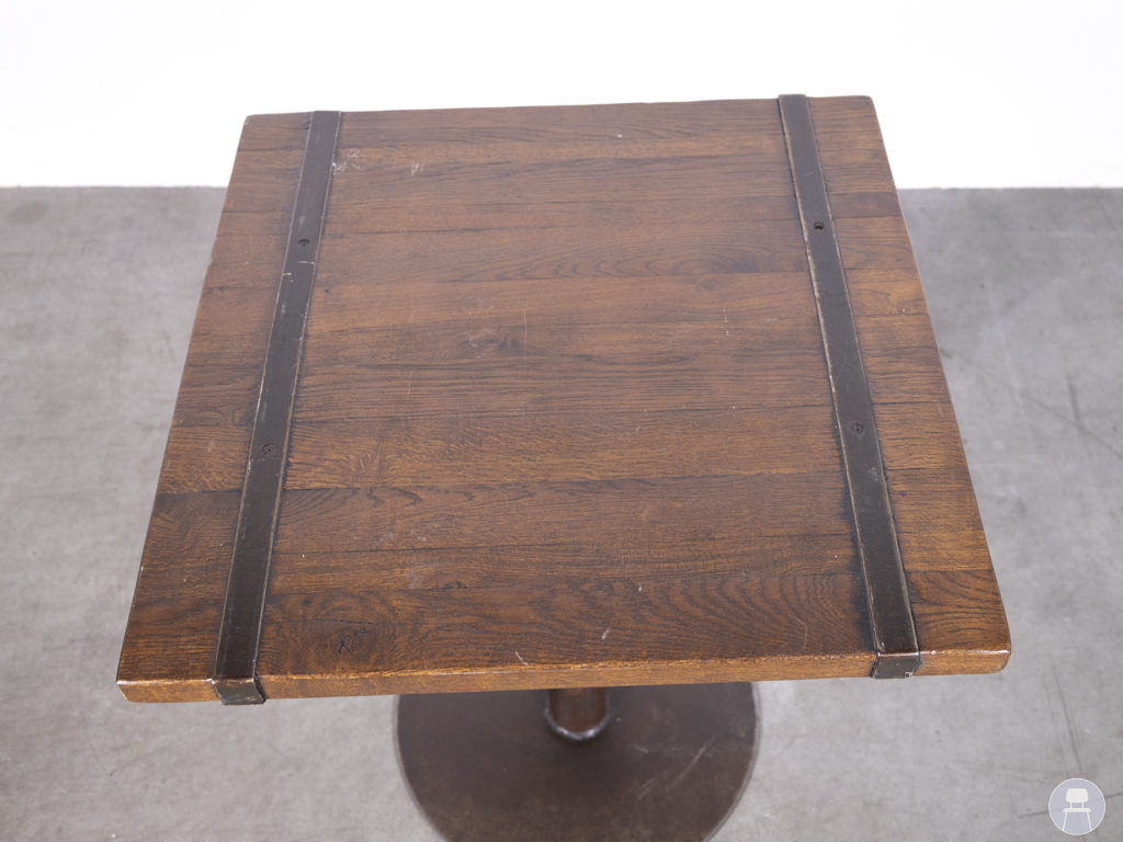 Horecatafel Urby eiken 65x65cm is compact van formaat, maar groots in uitstraling. Met zijn donker eikenhouten blad en subtiele stalen inlegdetails ademt deze tafel een sfeer van stoer vakmanschap en pure authenticiteit. Het hout is rijk van kleur, met een diepe warme toon die onmiddellijk karakter toevoegt aan elke ruimte. De metalen accenten in het blad geven net dat industriële randje zonder te overheersen, waardoor deze horecatafel moeiteloos past in uiteenlopende horecaconcepten.