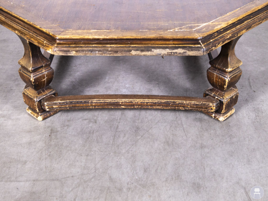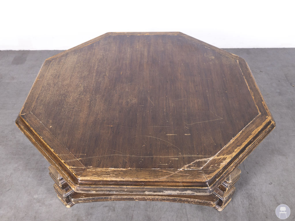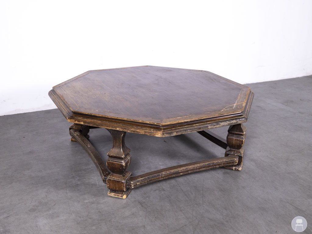 Salontafel Hexagon 140cm rond is een opvallende, achthoekige houten tafel die direct een nostalgische sfeer brengt in elk interieur. Deze ruime salontafel heeft een unieke vorm en een klassiek onderstel, waardoor hij perfect past in horecagelegenheden met een vintage, landelijke of retro uitstraling.