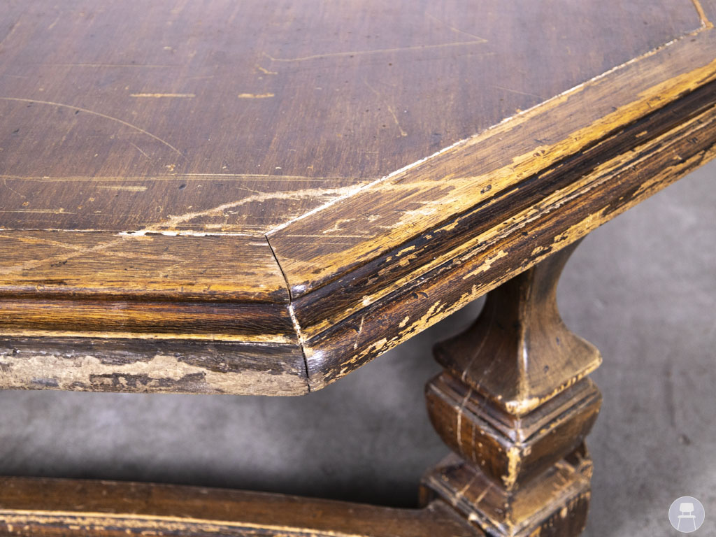 Met een diameter van 140 cm is er volop ruimte om de tafel te gebruiken als centrale blikvanger in een loungehoek of wachtkamer. Het hout vertoont duidelijke gebruikssporen, wat deze tweedehands tafel juist zijn authentieke karakter en gezellige uitstraling geeft.