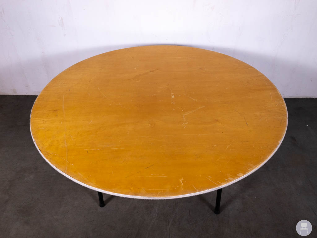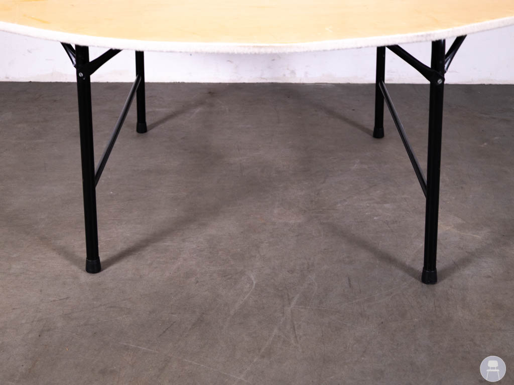 Stam-klaptafel Glen 180 cm rond is een praktische en stevige tafel die ideaal is voor evenementen, feesten, vergaderingen of horecagebruik. Dankzij het ronde blad is de tafel perfect om meerdere mensen comfortabel samen te laten zitten. Het tafelblad is uitgevoerd in hout met een lichte afwerking en biedt voldoende ruimte voor grotere gezelschappen. Het zwarte metalen onderstel is voorzien van een inklapbaar klapsysteem, waardoor de tafel eenvoudig op te zetten en weer op te bergen is. Door het stevige frame en het ruime blad is de stam-klaptafel Glen geschikt voor intensief gebruik bij evenementen, horeca of verhuur.
