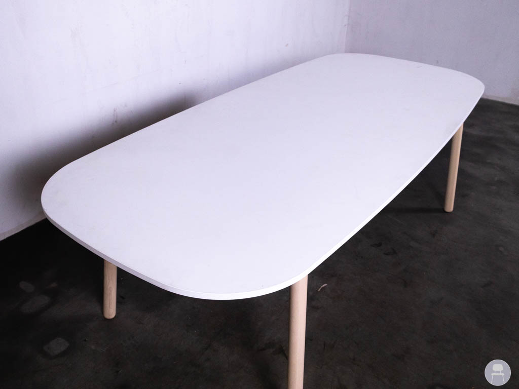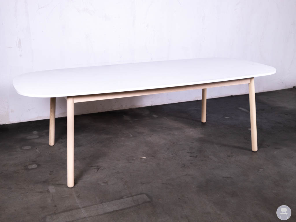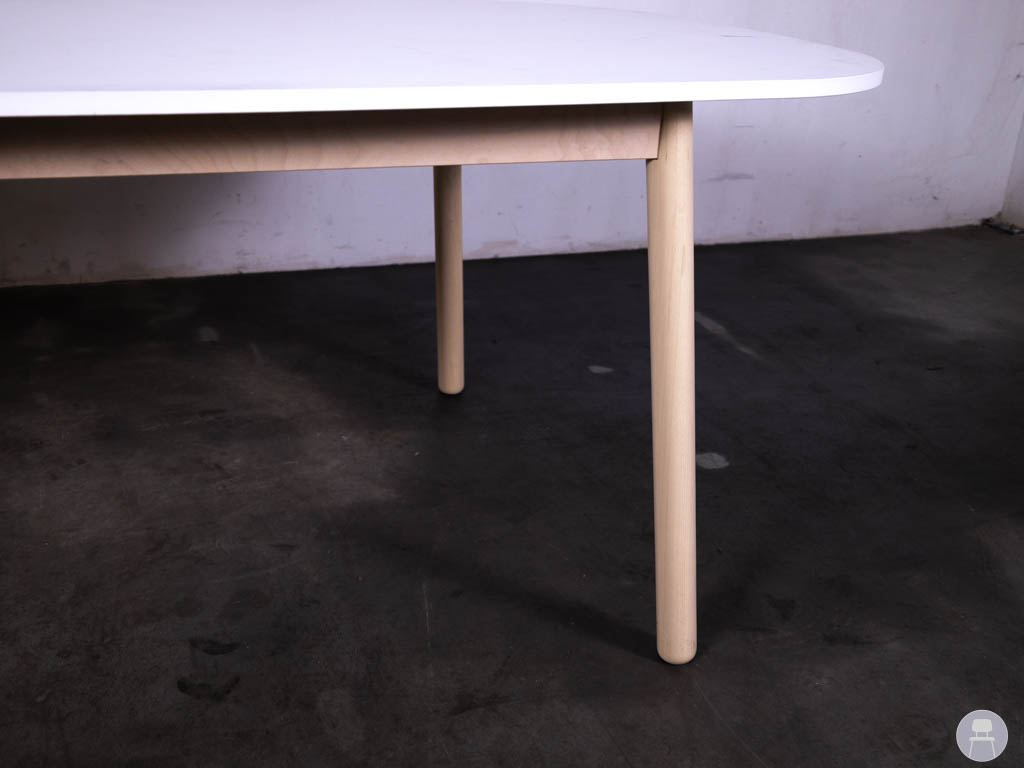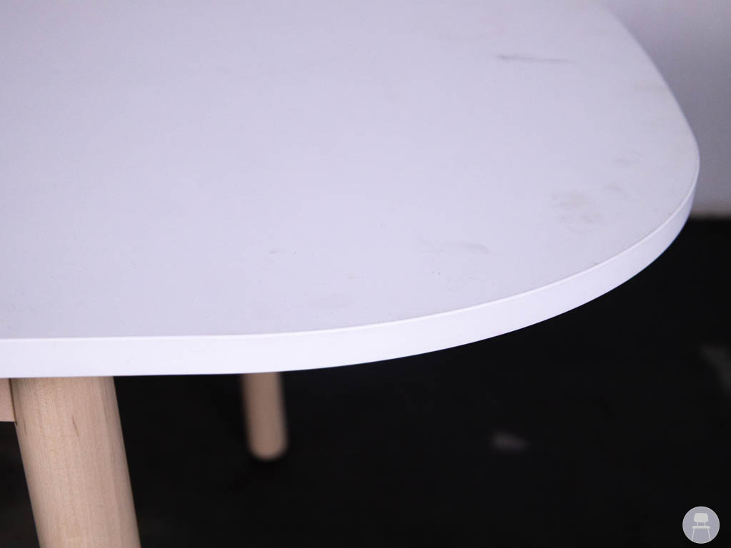 Het strakke witte tafelblad in combinatie met de licht houten poten zorgt voor een frisse en Scandinavische uitstraling. De ovale vorm geeft de tafel een zachte, uitnodigende look en maakt hem praktisch in gebruik doordat er geen scherpe hoeken zijn. Deze stamtafel heeft lichte gebruikssporen op het witte blad, wat voornamelijk cosmetisch is en geen invloed heeft op de stevigheid of functionaliteit. De tafel is stabiel, duurzaam en geschikt voor intensief gebruik.