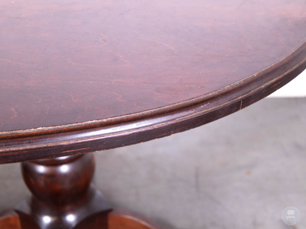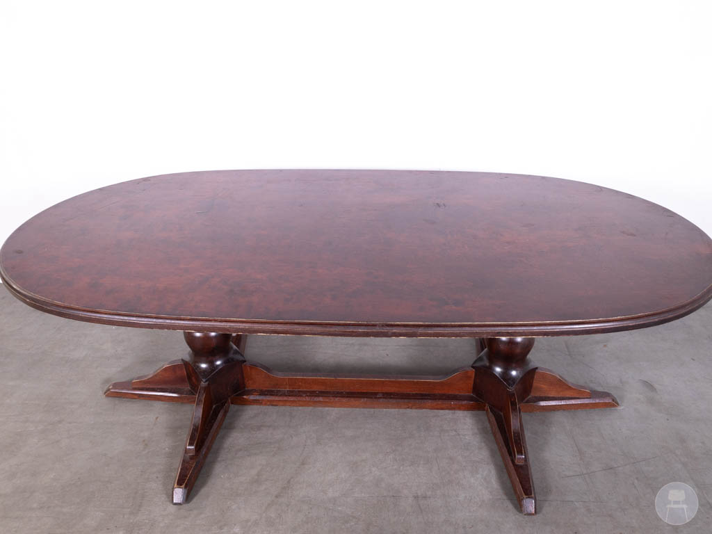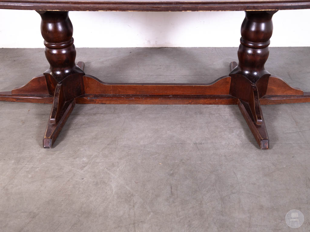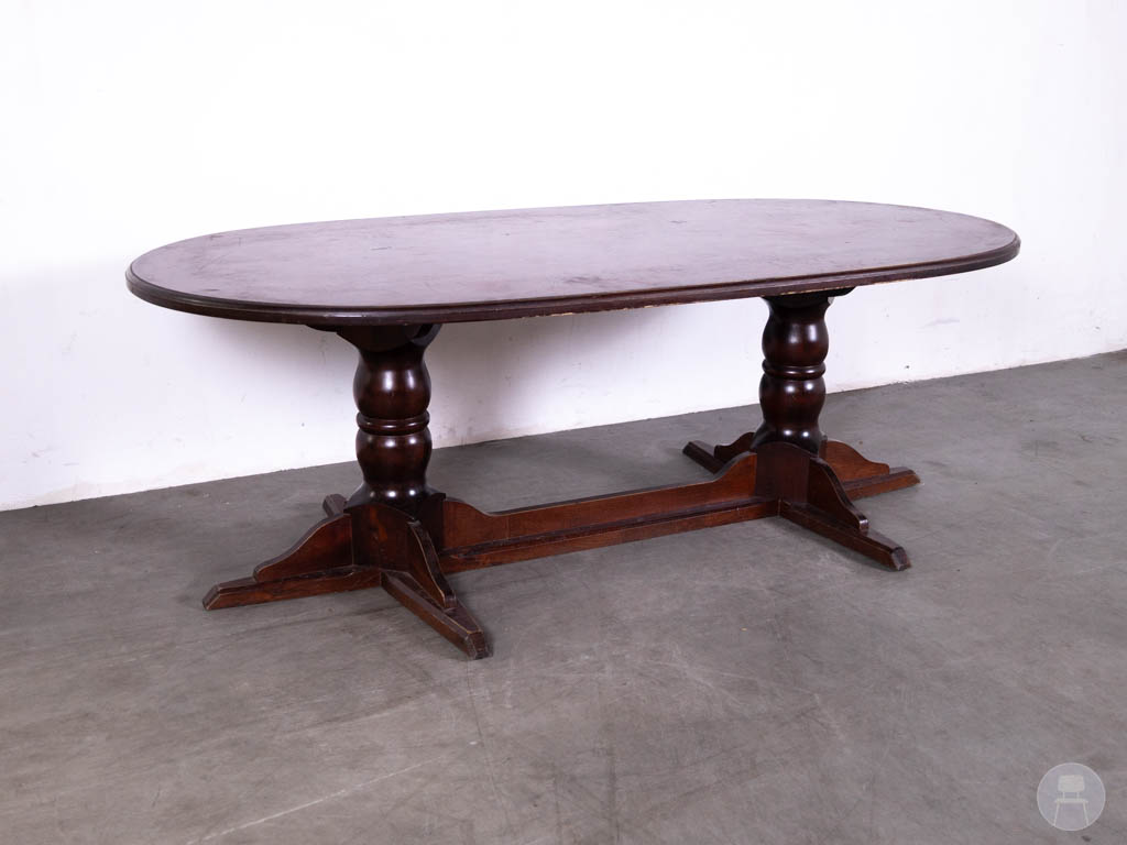 Het tafelblad is uitgevoerd in hout met een warme donkerbruine kleur en heeft een verfijnde, ovale vorm die zorgt voor een chique en uitnodigende uitstraling. Het karakteristieke onderstel met twee centrale kolommen en sierlijke poten geeft de stamtafel een authentieke Thonet-stijl en zorgt tegelijkertijd voor uitstekende stabiliteit.