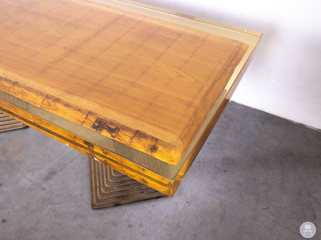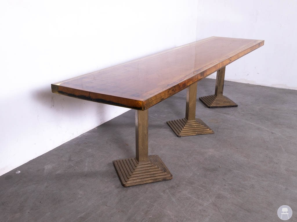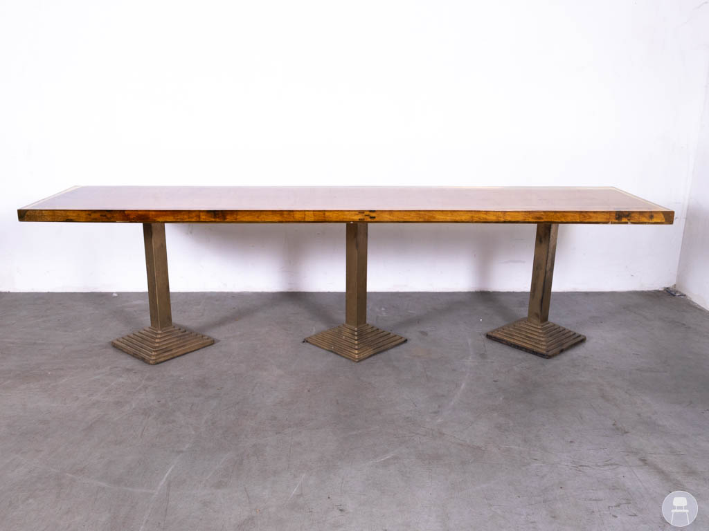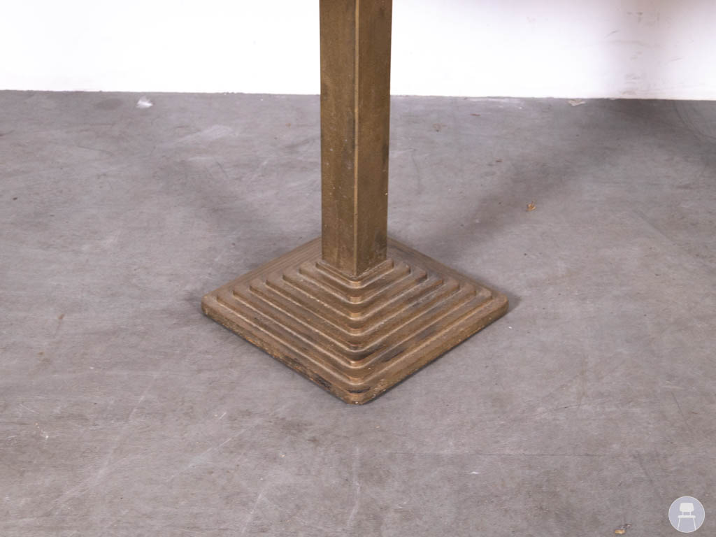 De tafel staat op stevige metalen onderstellen, waardoor de stamtafel zeer stabiel en geschikt is voor intensief gebruik in de horeca. Door het robuuste ontwerp en het zware gewicht blijft de tafel stevig staan, zelfs bij druk gebruik. De tafel heeft gebruikssporen en enkele beschadigingen, wat past bij het karakter van een tweedehands horecatafel en bijdraagt aan de stoere uitstraling van het meubel.