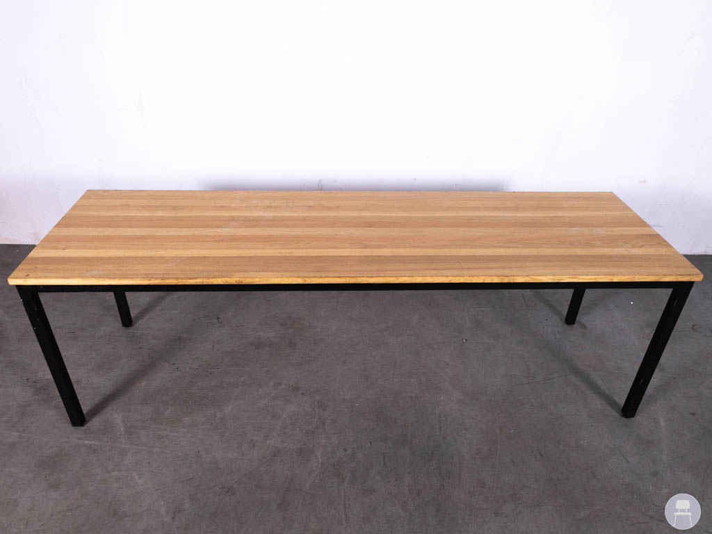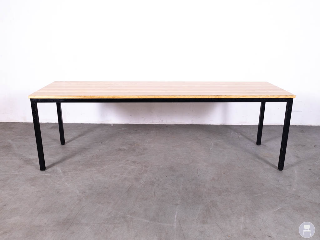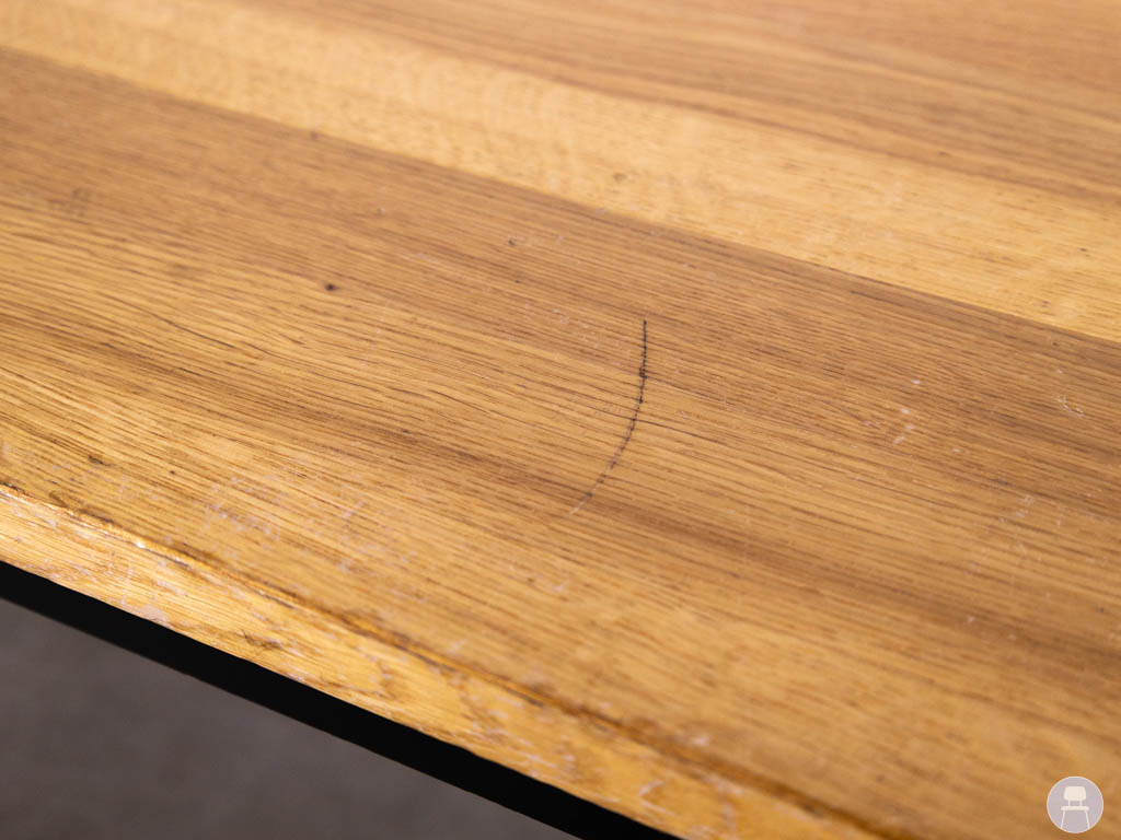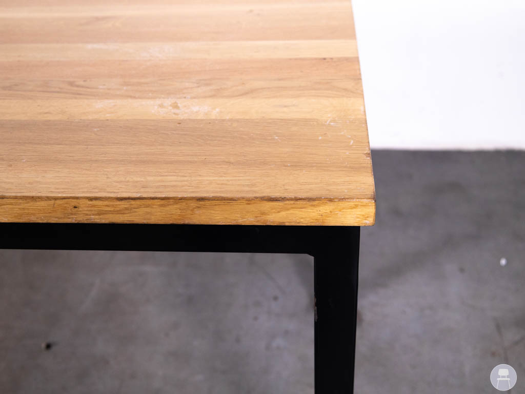 Het blad is uitgevoerd in eikenhout, wat zorgt voor een tijdloze en karaktervolle look met een mooie houtnerf. In combinatie met het zwarte metalen onderstel krijgt de tafel een stoere, industriële uitstraling die in veel interieurs tot zijn recht komt.