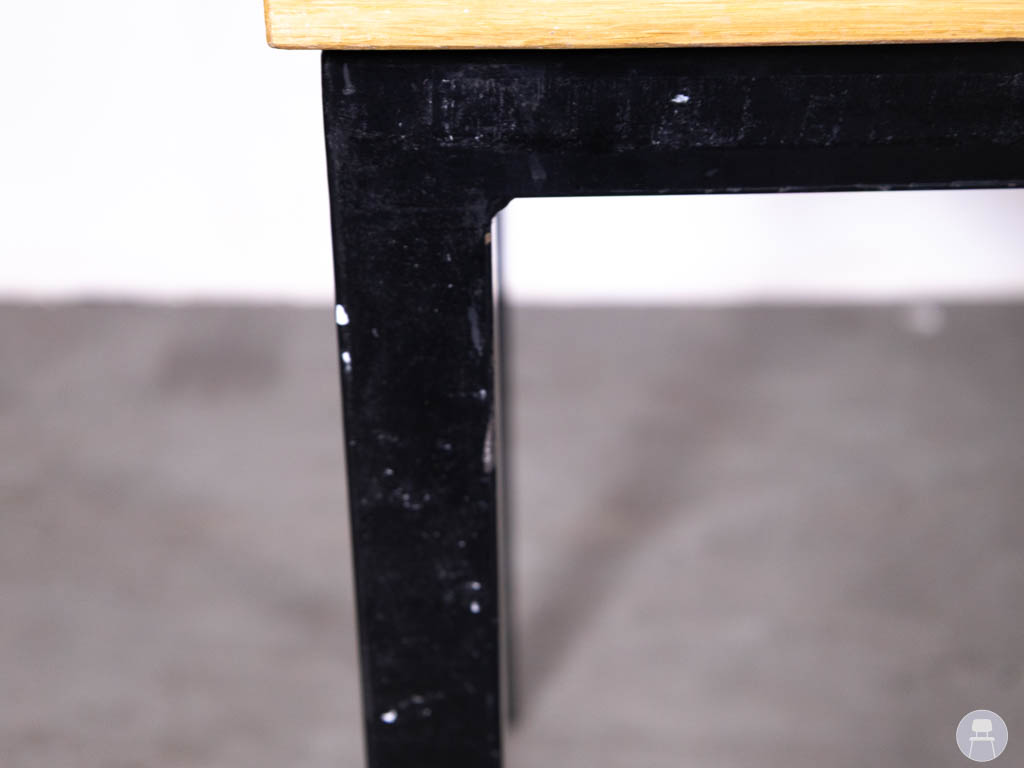 Dankzij de stevige constructie is deze tafel geschikt voor intensief gebruik in bijvoorbeeld een café, restaurant of kantine. De tafel verkeert in gebruikte staat en heeft lichte gebruikssporen op het blad en onderstel.