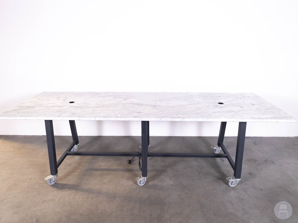 Het onderstel is voorzien van wielen, waardoor de tafel eenvoudig verplaatst kan worden. Dat maakt deze mobiele stamtafel extra praktisch voor horecalocaties die flexibel willen inspelen op verschillende opstellingen of evenementen. In het marmeren blad zijn gaten verwerkt voor stroomvoorziening en onder de tafel bevinden zich stopcontacten, wat deze tafel ook functioneel maakt voor werken, vergaderen of het opladen van apparatuur. De combinatie van echt marmer, mobiliteit en geïntegreerde stroompunten maakt deze horecastamtafel tot een stijlvolle en veelzijdige keuze.