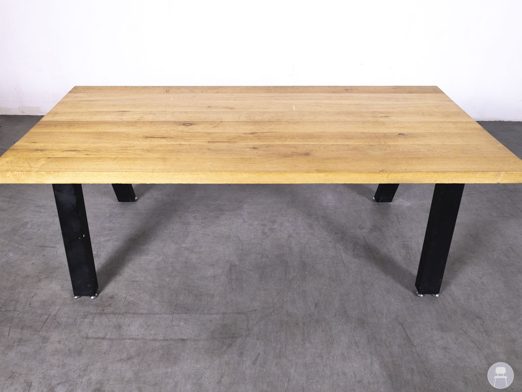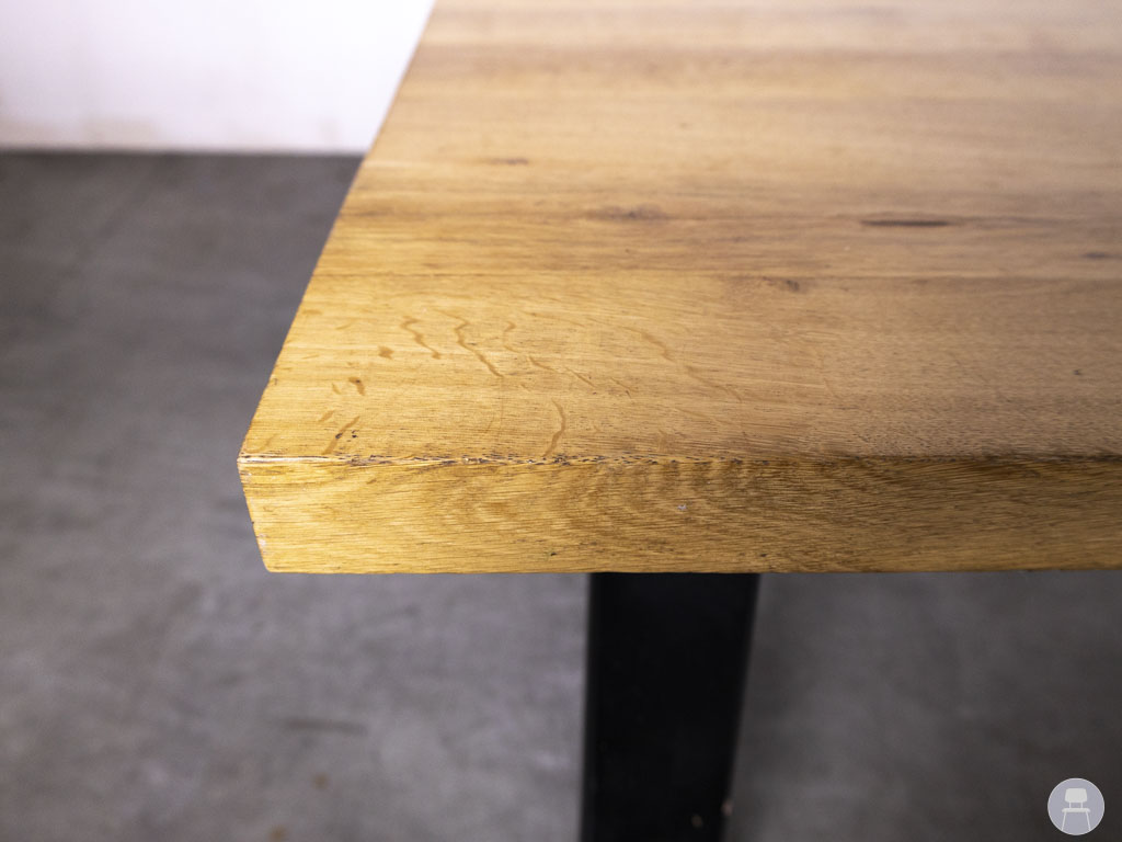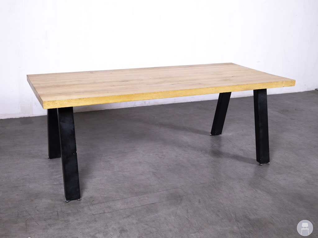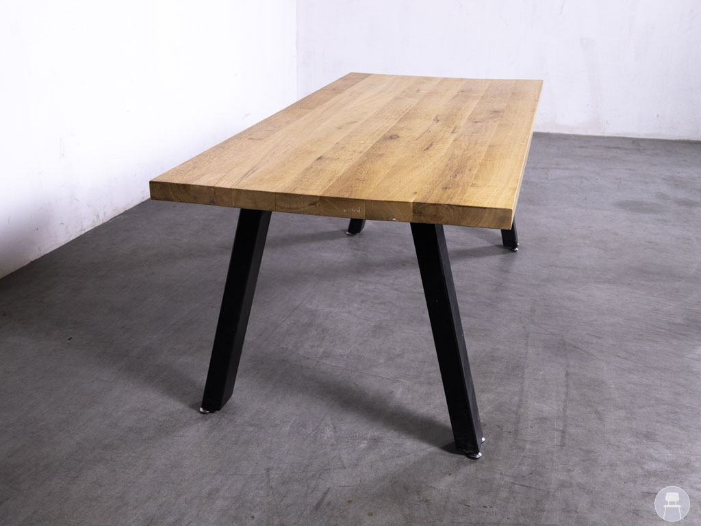 Het tafelblad is uitgevoerd in een natuurlijke eiken kleur die perfect combineert met het stoere onderstel van zwart metaal. De schuingeplaatste poten geven de tafel een industriële look en zorgen tegelijkertijd voor optimale stabiliteit. Dankzij deze mix van eikenhout en metaal past deze tafel zowel in moderne als in meer rustieke horecagelegenheden.