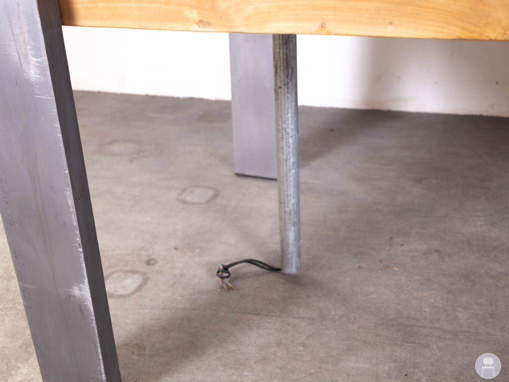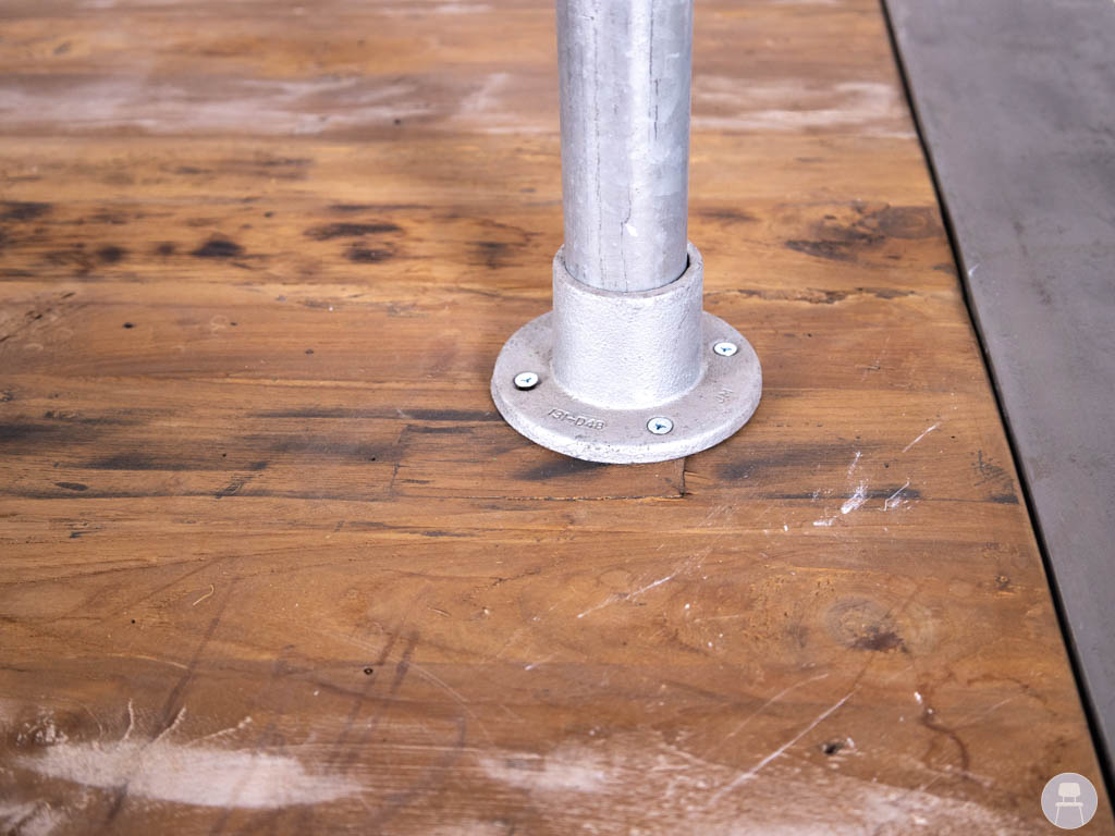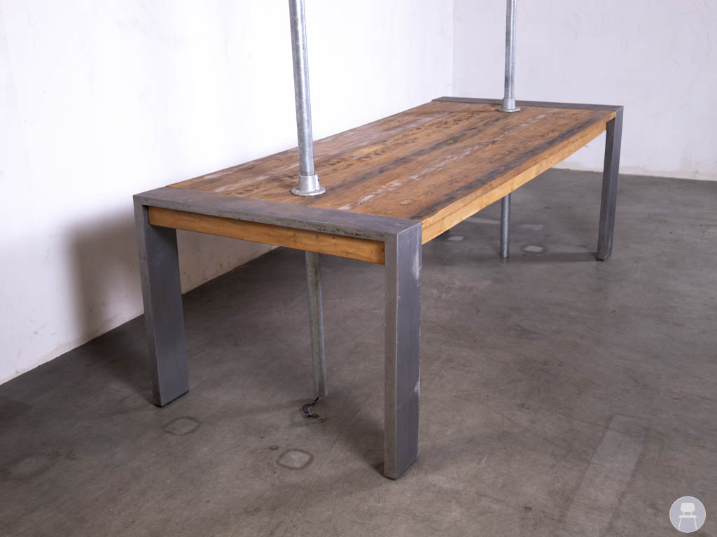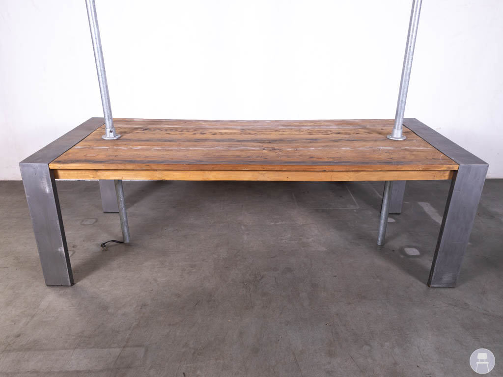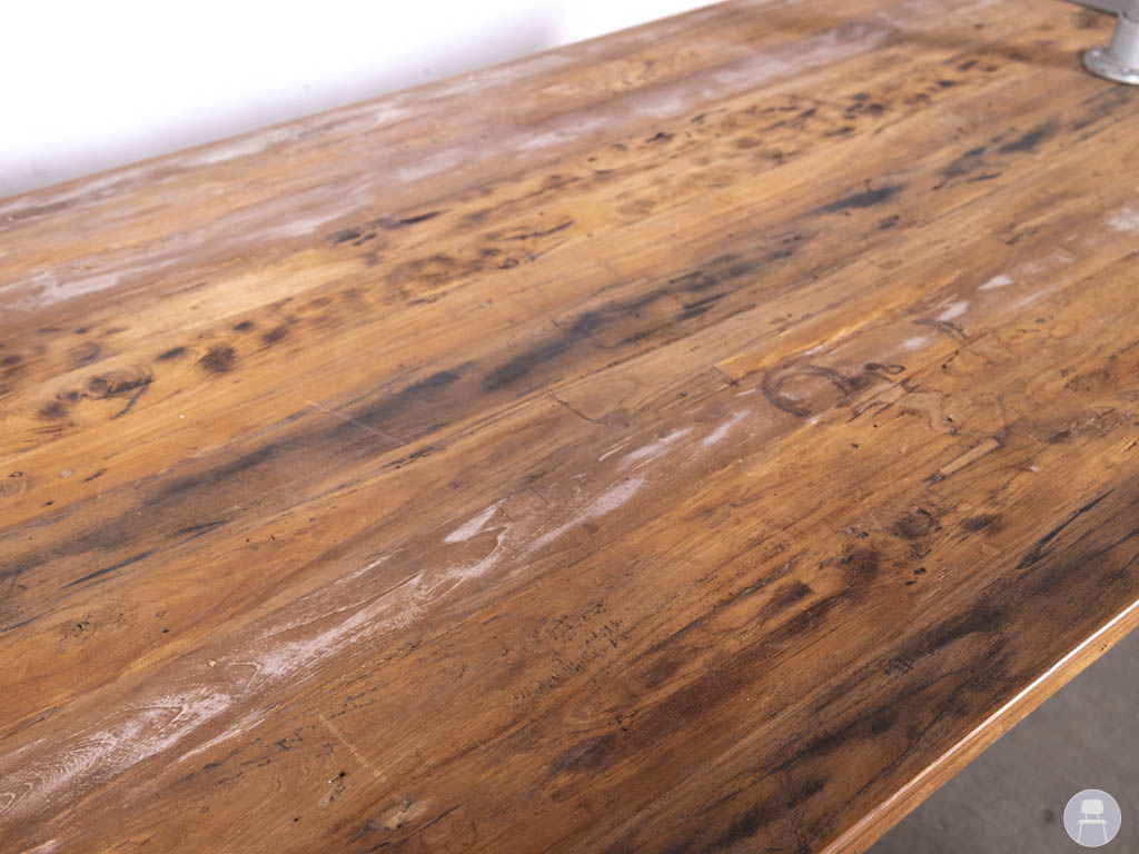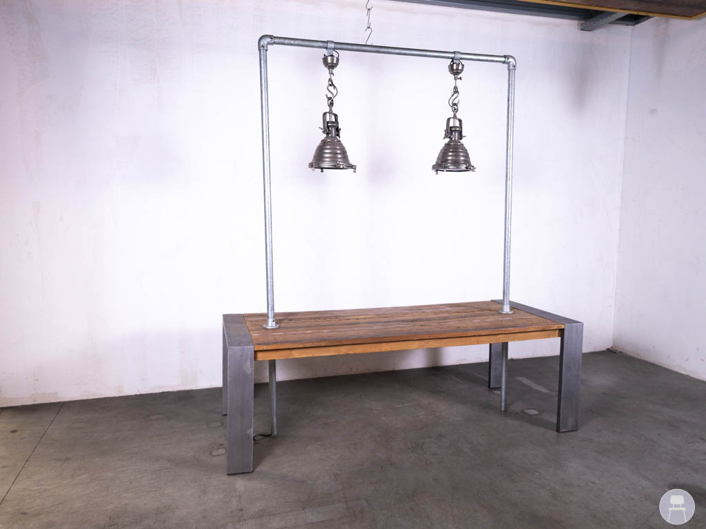 Het massieve houten tafelblad heeft een doorleefde, ruige uitstraling met zichtbare houtstructuur. De combinatie van het warme hout en de stevige metalen poten zorgt voor een stoer en industrieel design. De geïntegreerde tafelstang boven het blad, voorzien van twee metalen hanglampen, geeft de tafel een unieke en functionele uitstraling. Dit maakt de stamtafel perfect voor sfeervolle horecaomgevingen.