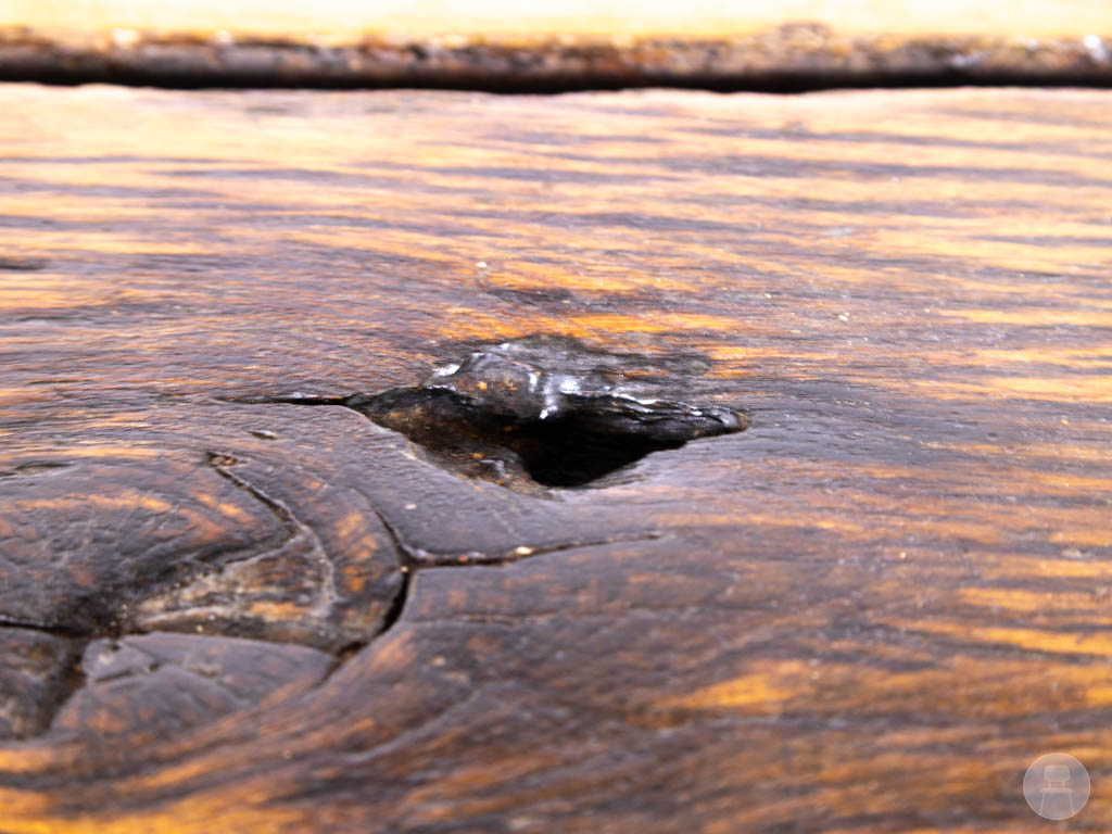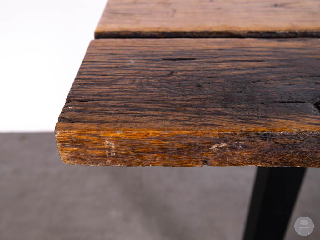 Het tafelblad is uitgevoerd in massief hout met een warme, doorleefde uitstraling. De zichtbare nerven en gebruikssporen geven de tafel een stoer en authentiek karakter, wat perfect past binnen industriële en vintage horeca concepten. Het stevige metalen onderstel in zwart zorgt voor stabiliteit en een moderne uitstraling.
