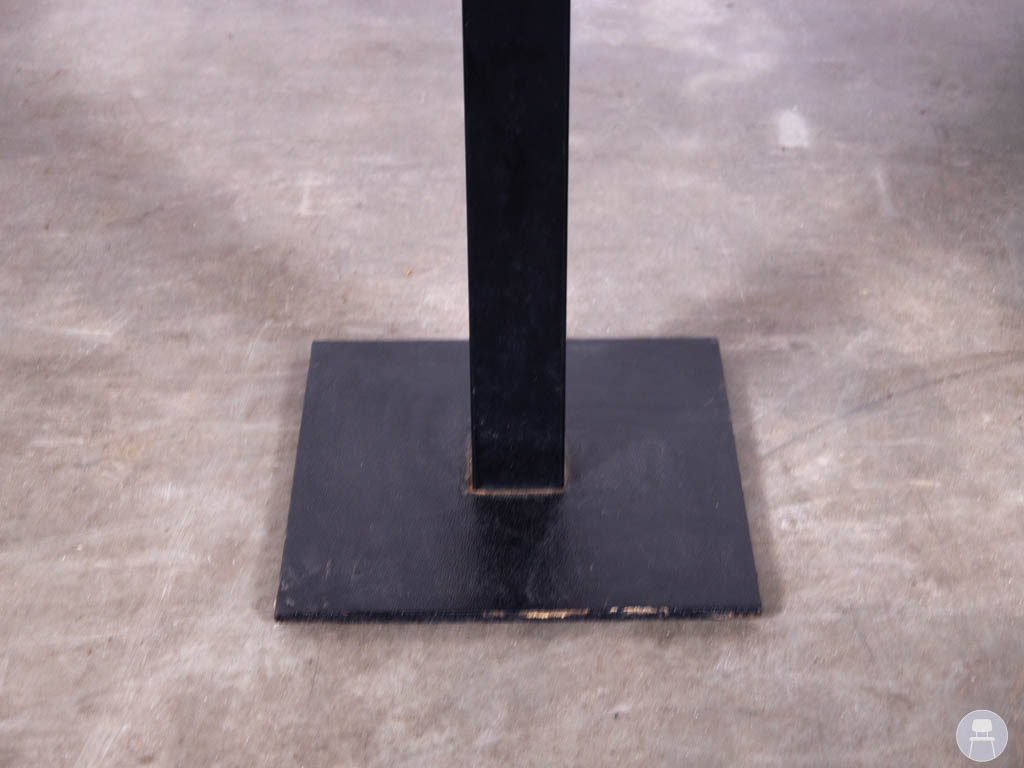 De tafel staat op een stevig zwart metalen onderstel met een centrale kolom en vierkante voetplaat. Dit zorgt voor stabiliteit en voldoende beenruimte rondom de tafel. De halfhoge uitvoering maakt deze tafel geschikt in combinatie met halfhoge barkrukken of als informele zit-/sta-oplossing.