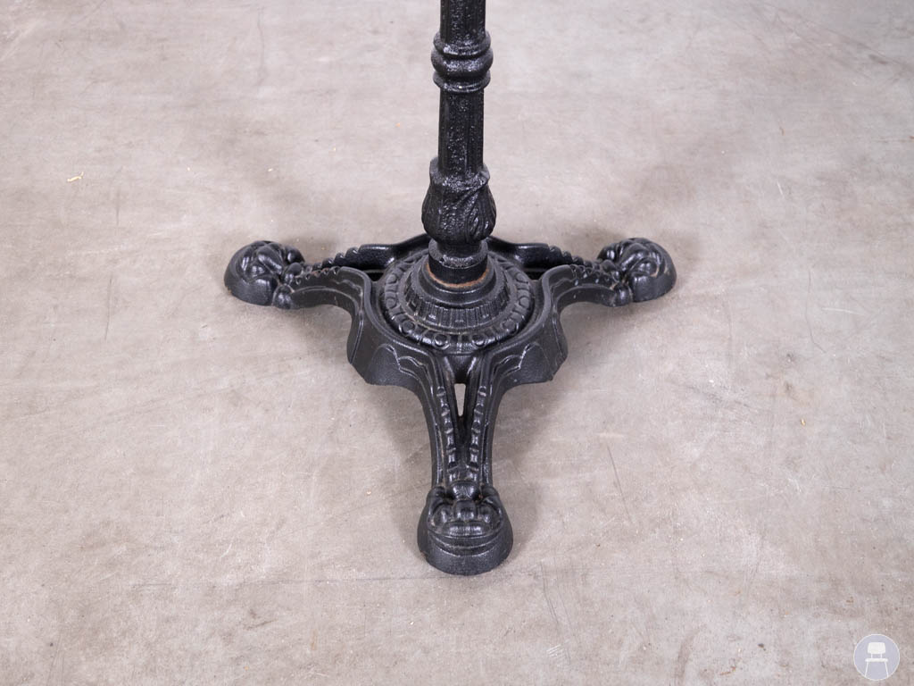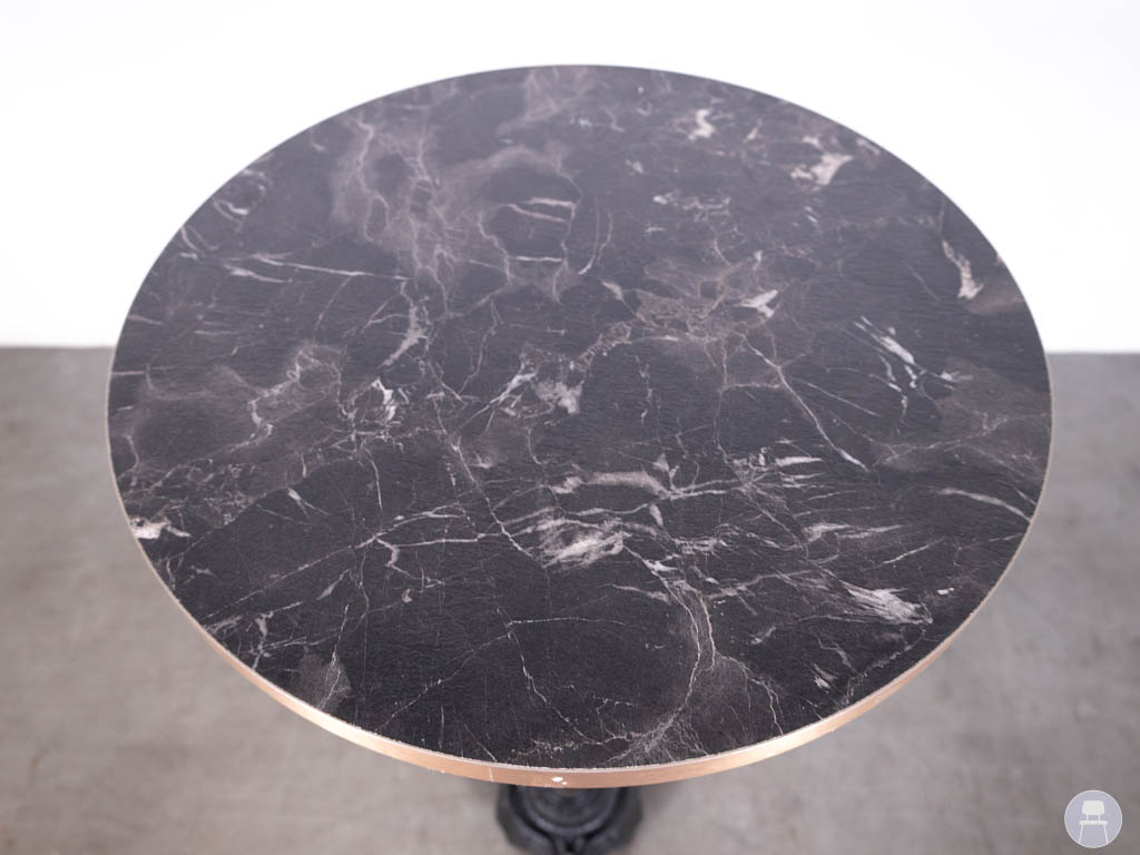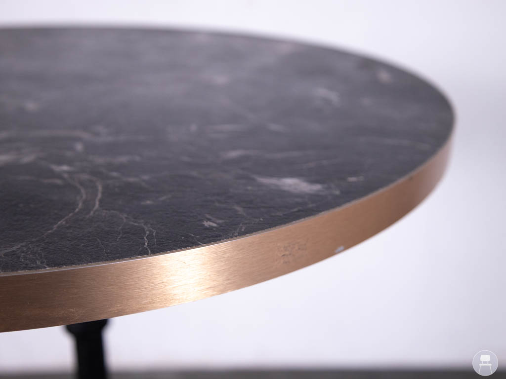Het ronde tafelblad van 60 cm heeft een zwarte marmerlook en is uitgevoerd in HPL, waardoor het blad duurzaam en geschikt is voor intensief gebruik. De koperkleurige metalen rand geeft de tafel een luxe en verfijnde uitstraling. De tafel staat op een stevig gietijzeren castle onderstel, wat zorgt voor stabiliteit en een klassieke horecastijl.