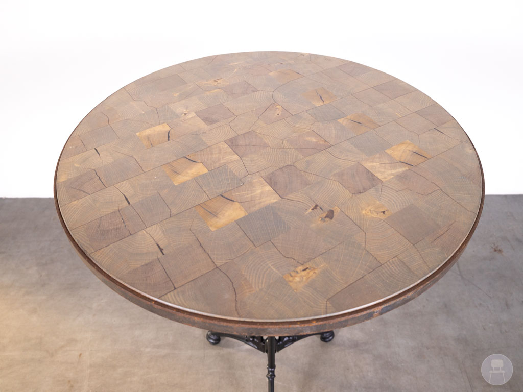 Deze ronde statafel met een diameter van 85 cm is voorzien van een bijzonder houten blad in mozaïekpatroon, wat zorgt voor een warme en karaktervolle look. Het blad is stevig en geschikt voor intensief gebruik. Het aluminium onderstel met klassieke pootconstructie biedt stabiliteit en geeft de tafel een industriële uitstraling.