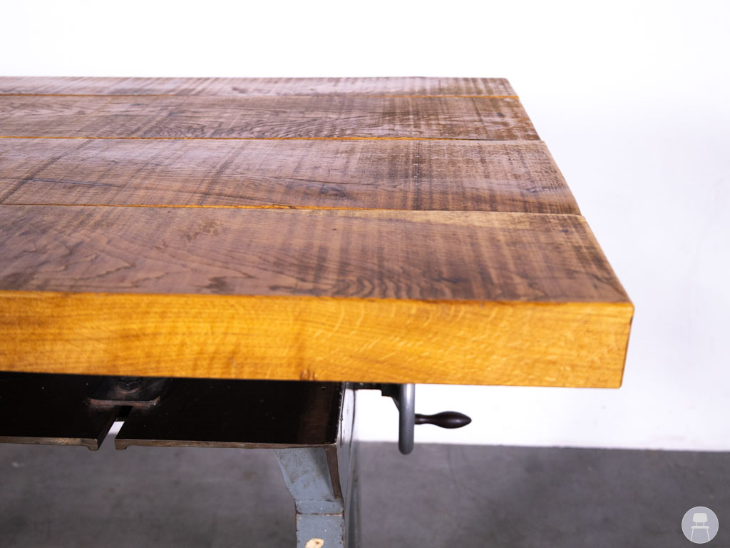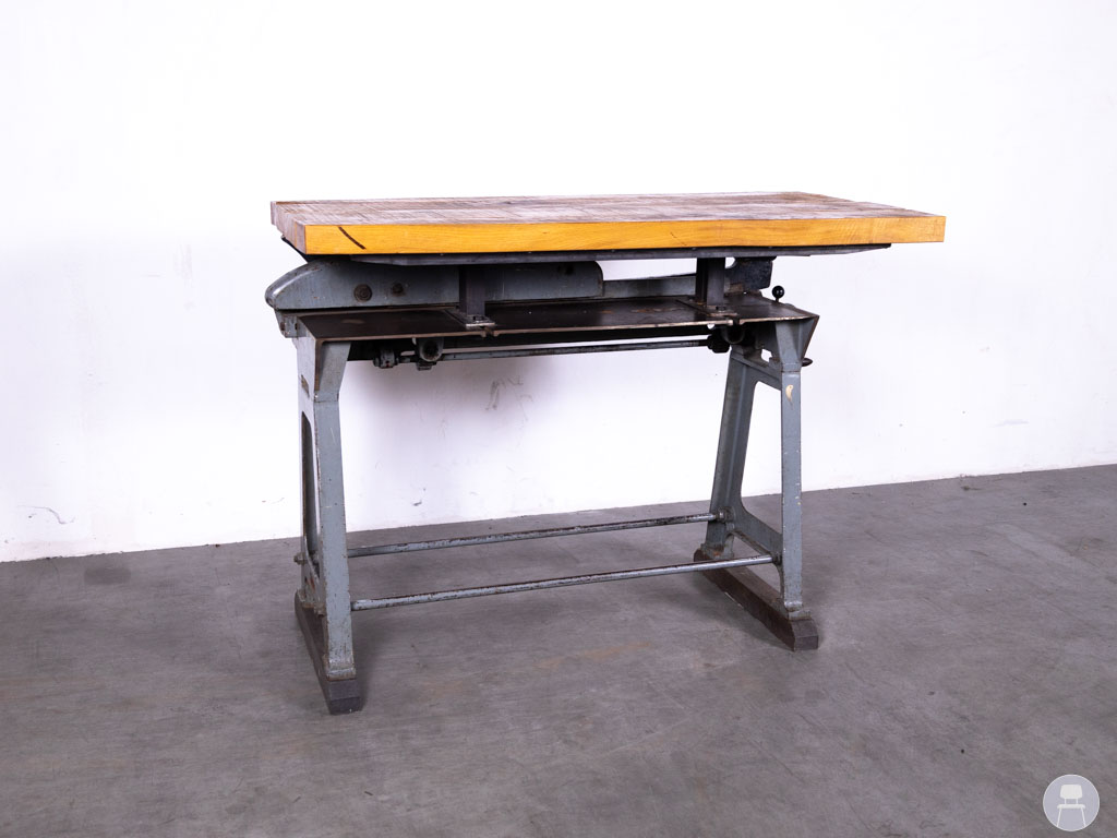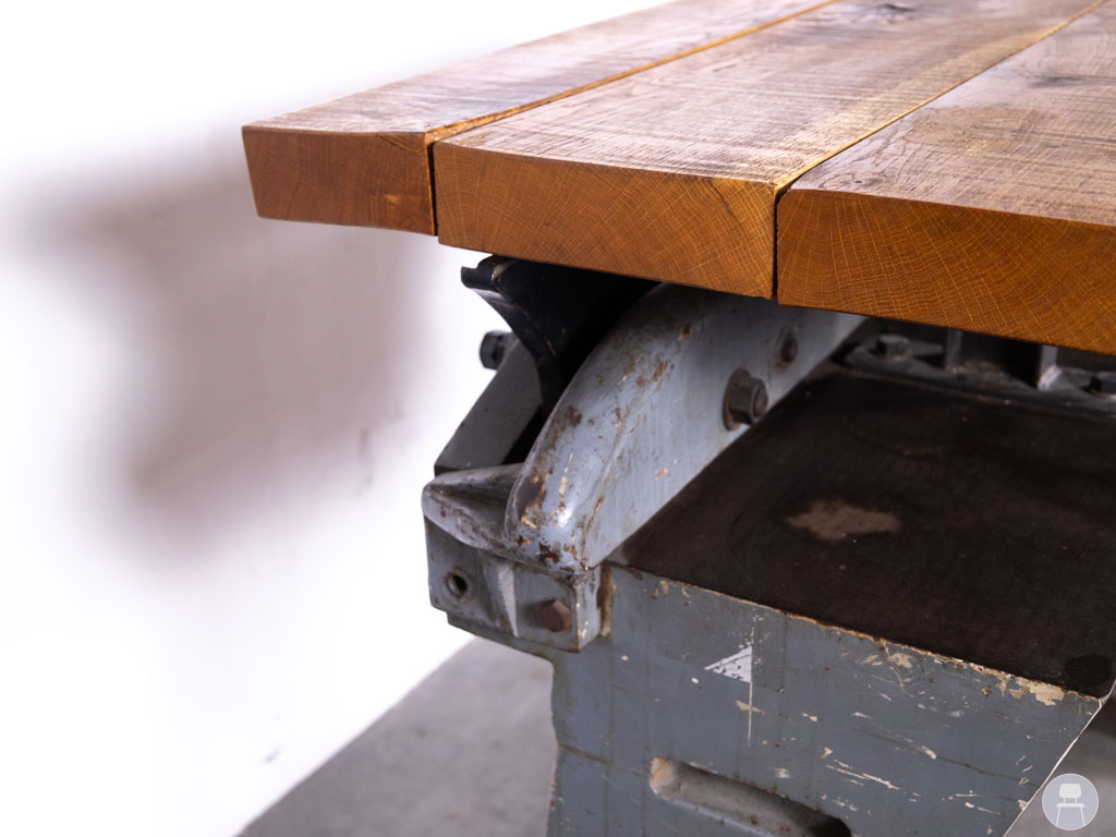 Het onderstel is voorzien van authentieke details zoals een slingermechaniek en metalen tandwielen, wat zorgt voor een industriële uitstraling met geschiedenis. Het dikke houten blad is ruw afgewerkt en straalt vakmanschap en duurzaamheid uit. Deze tafel is perfect als statafel of hoge werktafel in een bar, restaurant of creatieve ruimte en brengt direct sfeer en karakter in elke omgeving. Geen tafel is hetzelfde – dus je haalt altijd een uniek stuk in je zaak. Let op: de tafel is erg zwaar!
