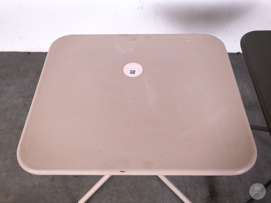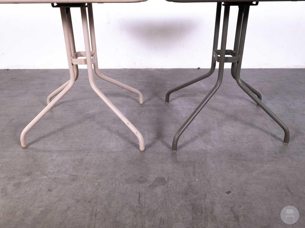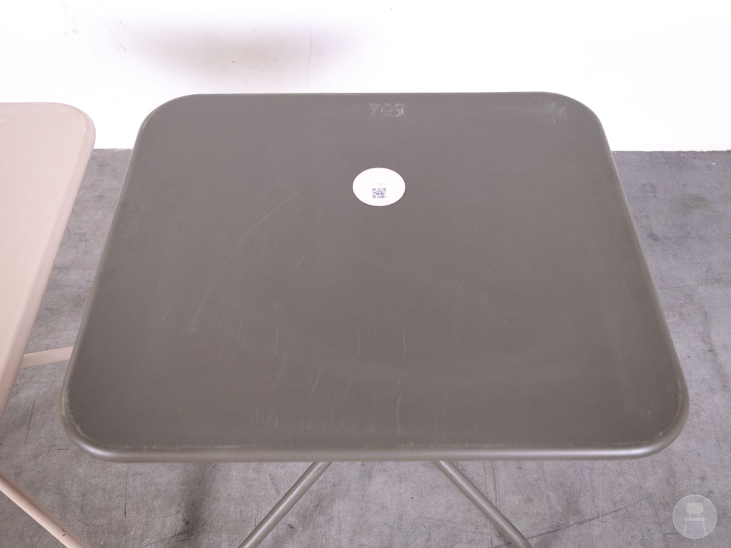 De set bestaat uit twee verschillende kleuren — donkergroen en taupe — wat zorgt voor een speelse, maar toch harmonieuze uitstraling. Dankzij het gecoate plaatstaal zijn de tafels bestand tegen weer en wind en eenvoudig te reinigen, wat ze ideaal maakt voor dagelijks gebruik op het terras van een café, bistro of lunchroom. Deze tweedehands terrastafels bieden comfort, kwaliteit en kleur in één compacte, gebruiksvriendelijke set.